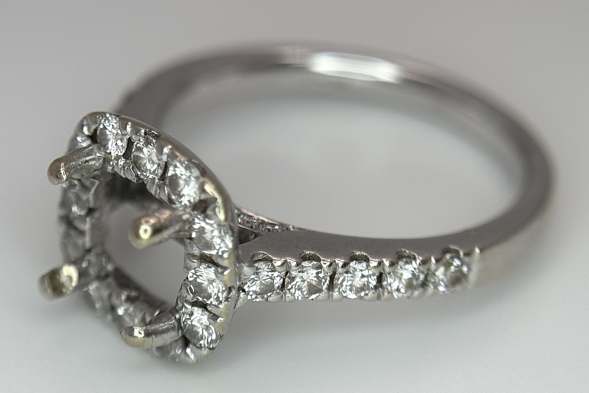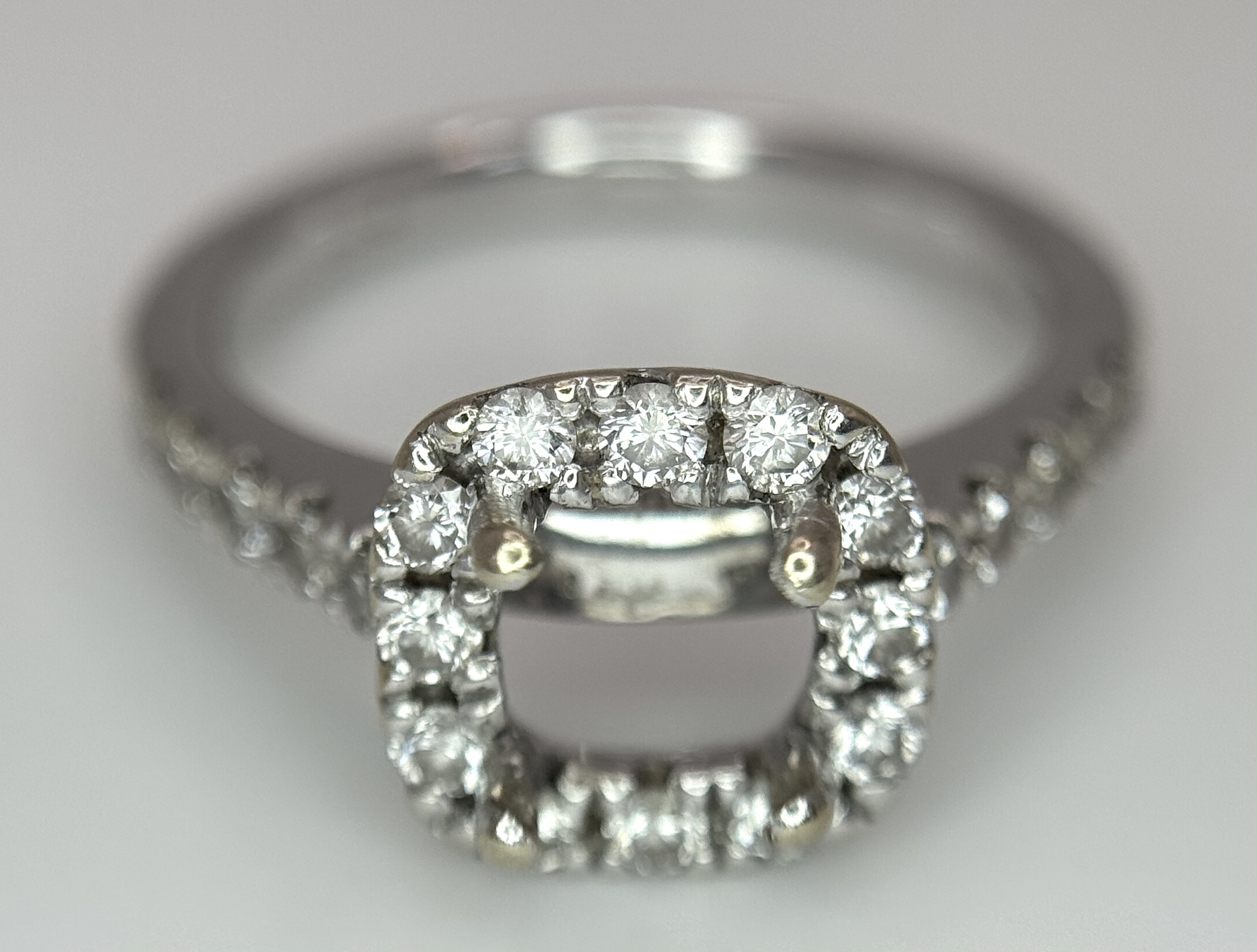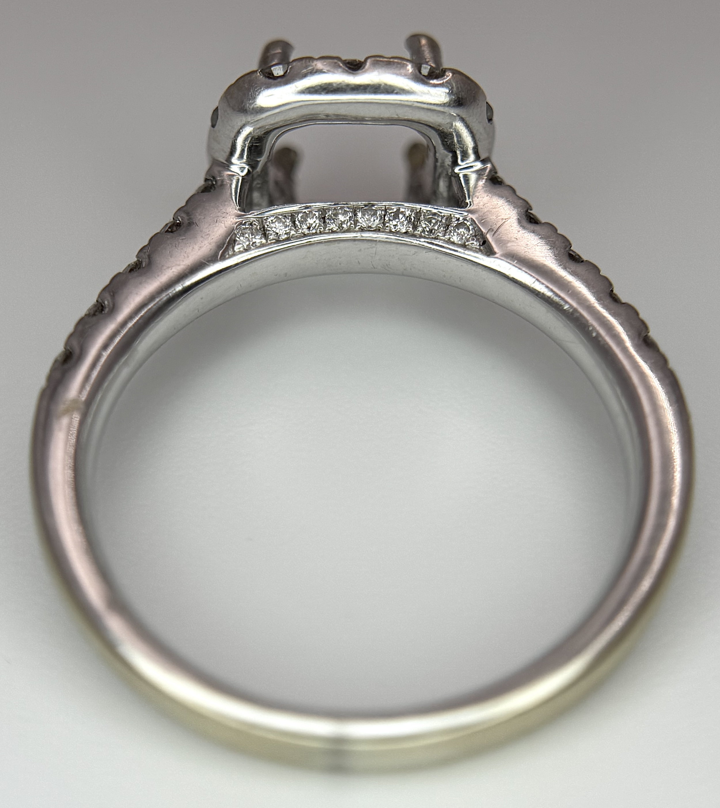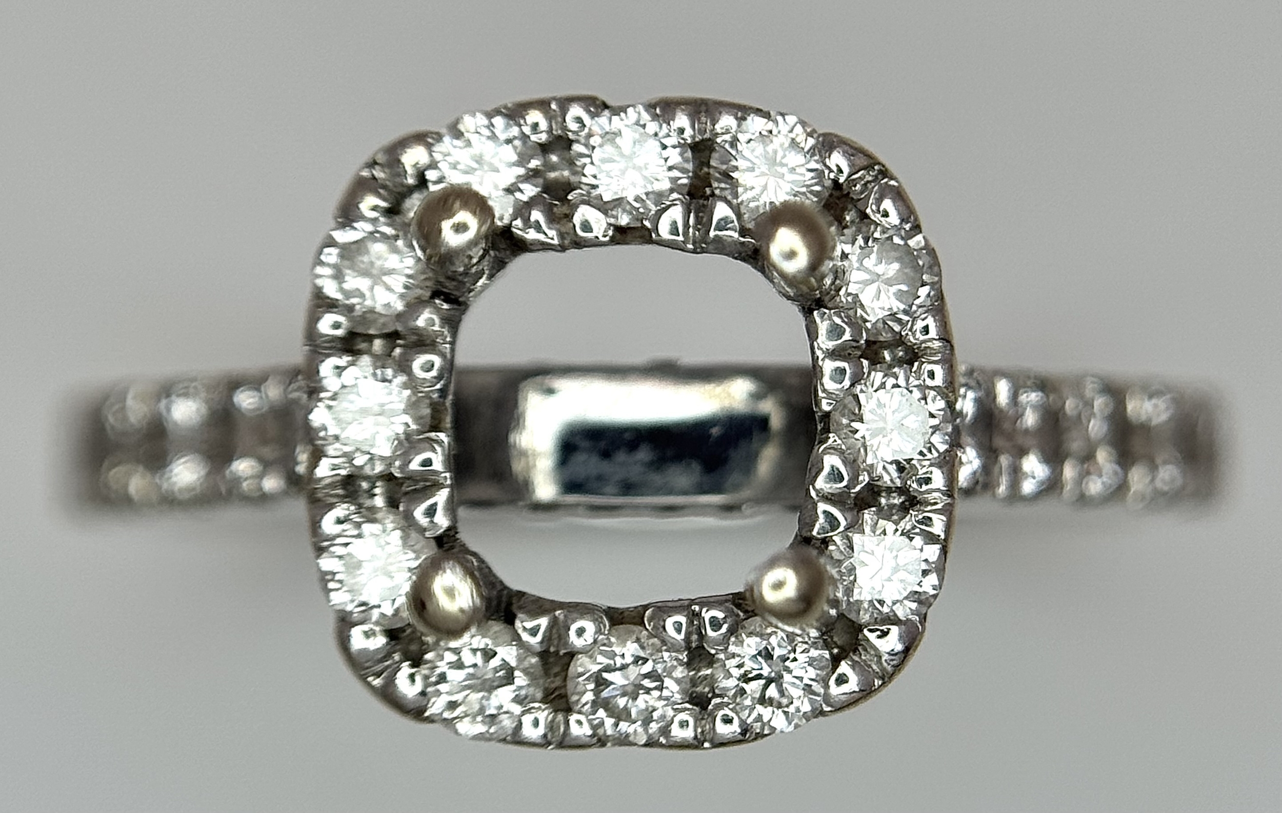 An 18K WHITE GOLD DIAMOND SET HALO RING MOUNT 4.2G SIZE L WILL HOLD A 0.85CT STONE APPROX . Ref: SC 7062