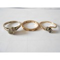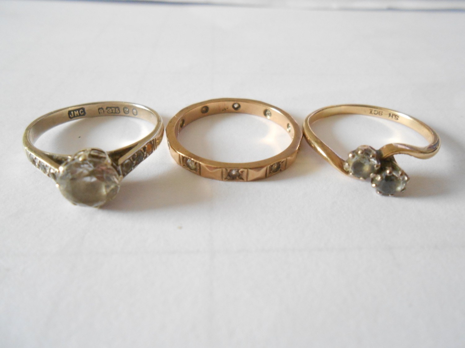 A lady's ring of crossover design set two white stones, on a 9ct. gold shank, a lady's ring set white stone with white stone set shoulders, on a 9ct. gold shank and a lady's eternity ring set white stones, on a 9ct. gold shank