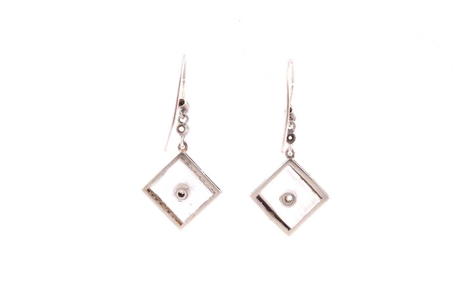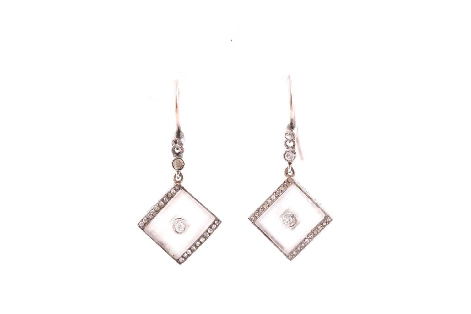A pair of early 20th century diamond and rock crystal drop earrings, the squared mounts with frosted rock crystal, inset with a small diamond, suspended beneath two small diamonds, hook fastens, 2.5 cm long.