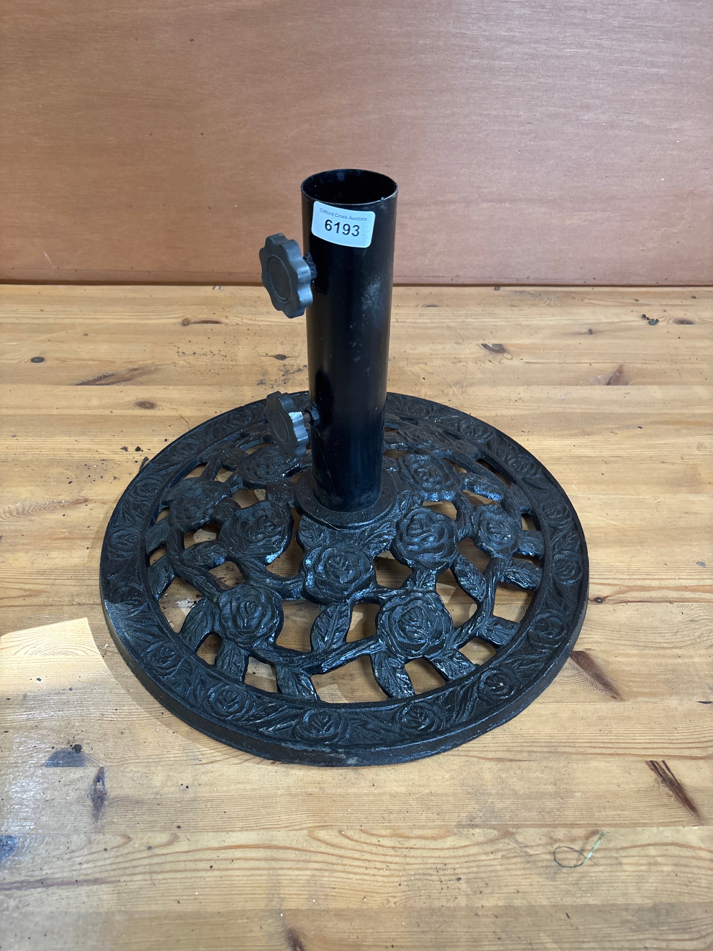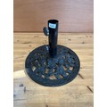 A cast iron parasol base with rose design.
