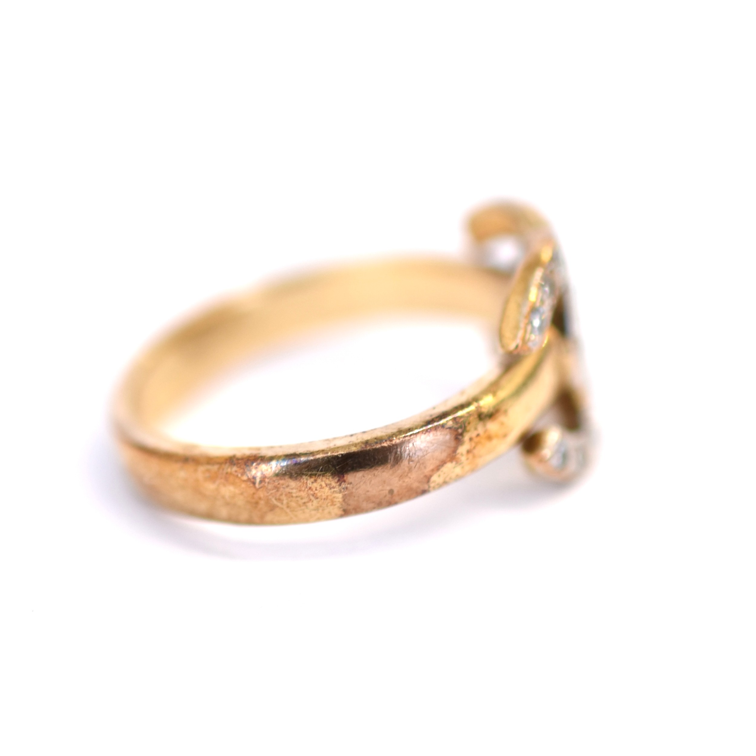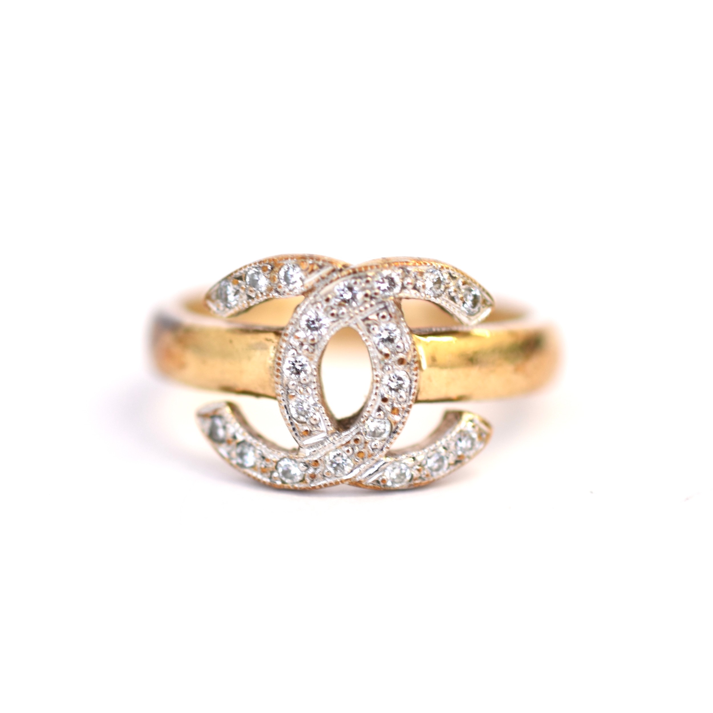 9ct CC diamond ring. Ring size M. Weighing 3.90g. Head measures 10.20mm. Good condition - tarnish to shank from previous gold testing.
