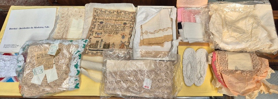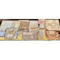 A box of lace and linen to include a 19th century sampler et...