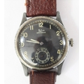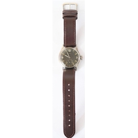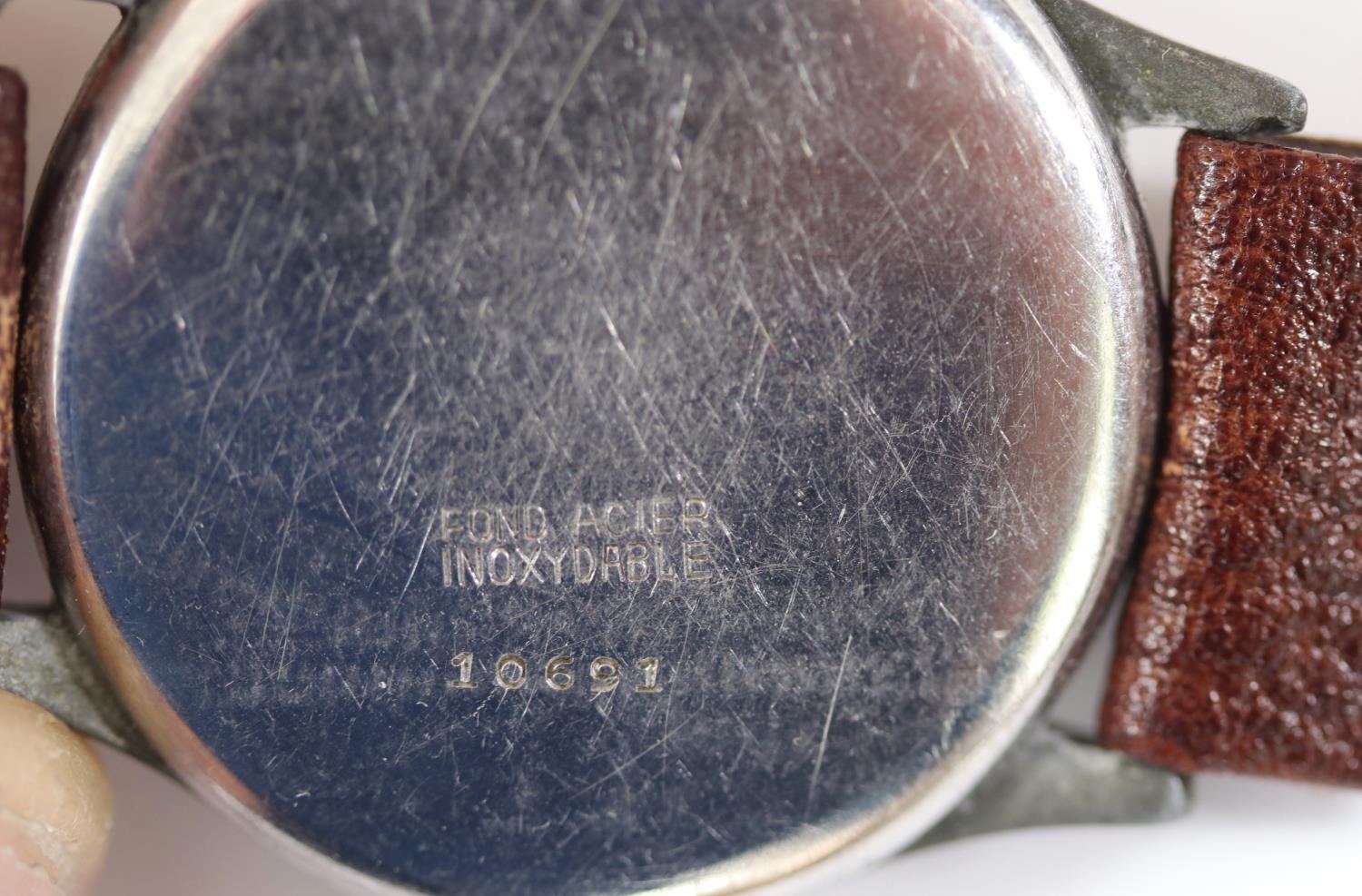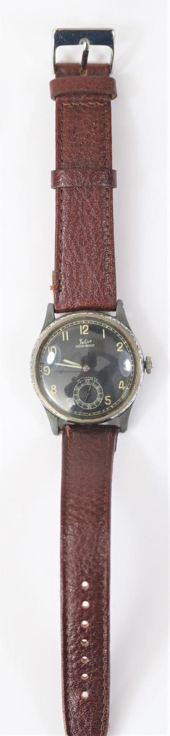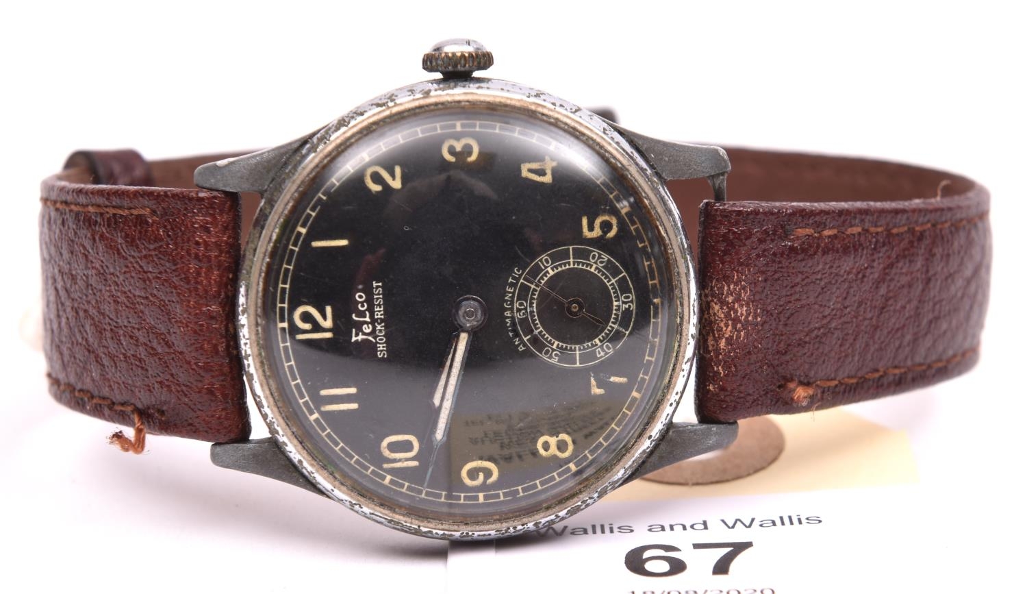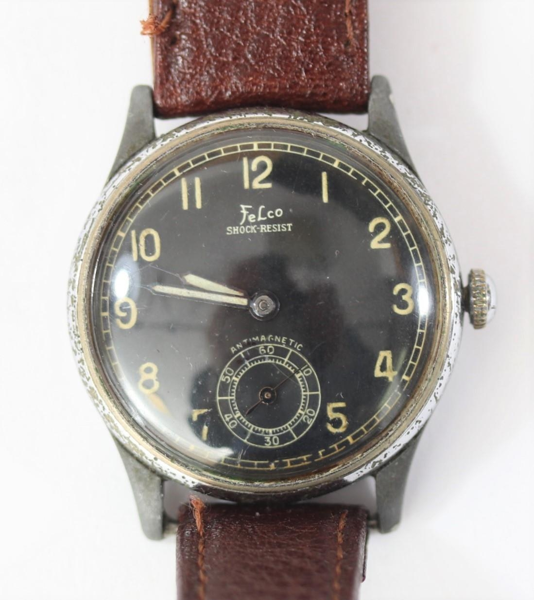 Felco wristwatch. Plated case, almost all plating removed from midcase, bezel pitted and worn, 33mm without crown. Fixed bars. Snap back marked “Fond Acier Inoxyable” with serial number. Black dial is clean, with some marking, signed Felco, Shockresist and antimagnetic. Dial markers appear to have original luminous material, hands are blued, luminous material on hands has been refinished. Unsigned A.S 1130 movement, some scratches to plates, overall clean, running condition. QGC