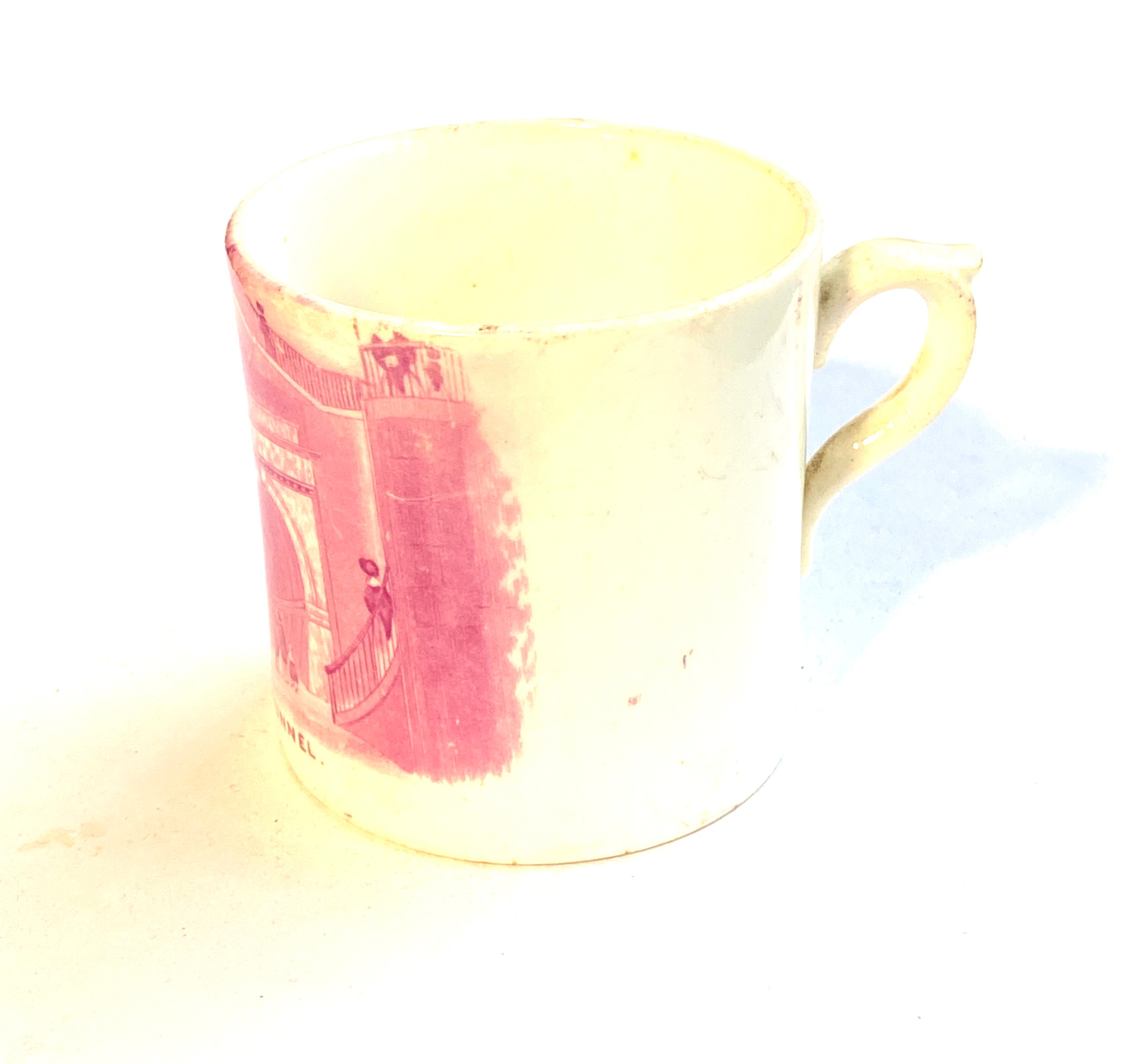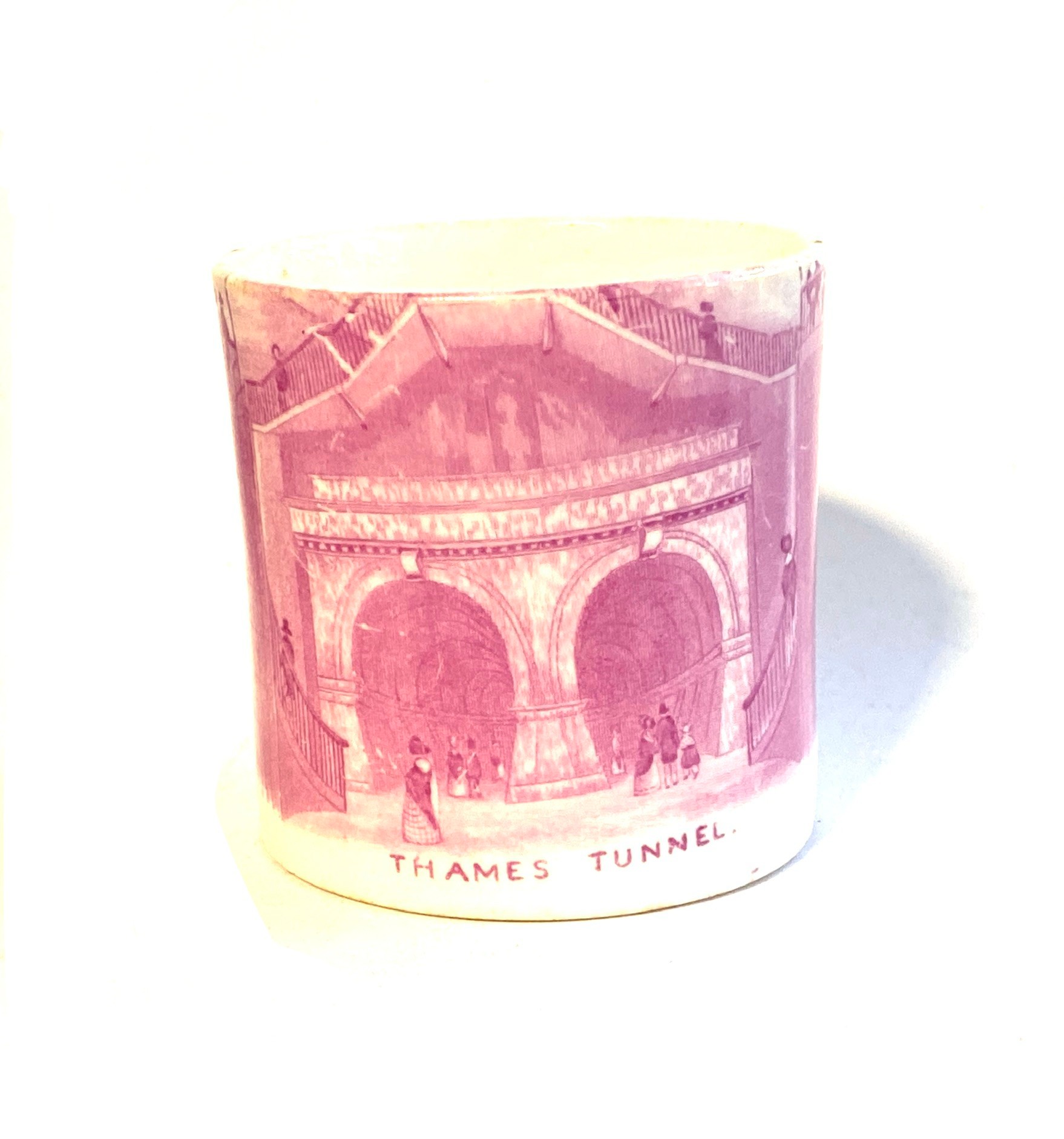 A small 19th century pink transferware 'Thames Tunnel' coffee can, 5.5cmH