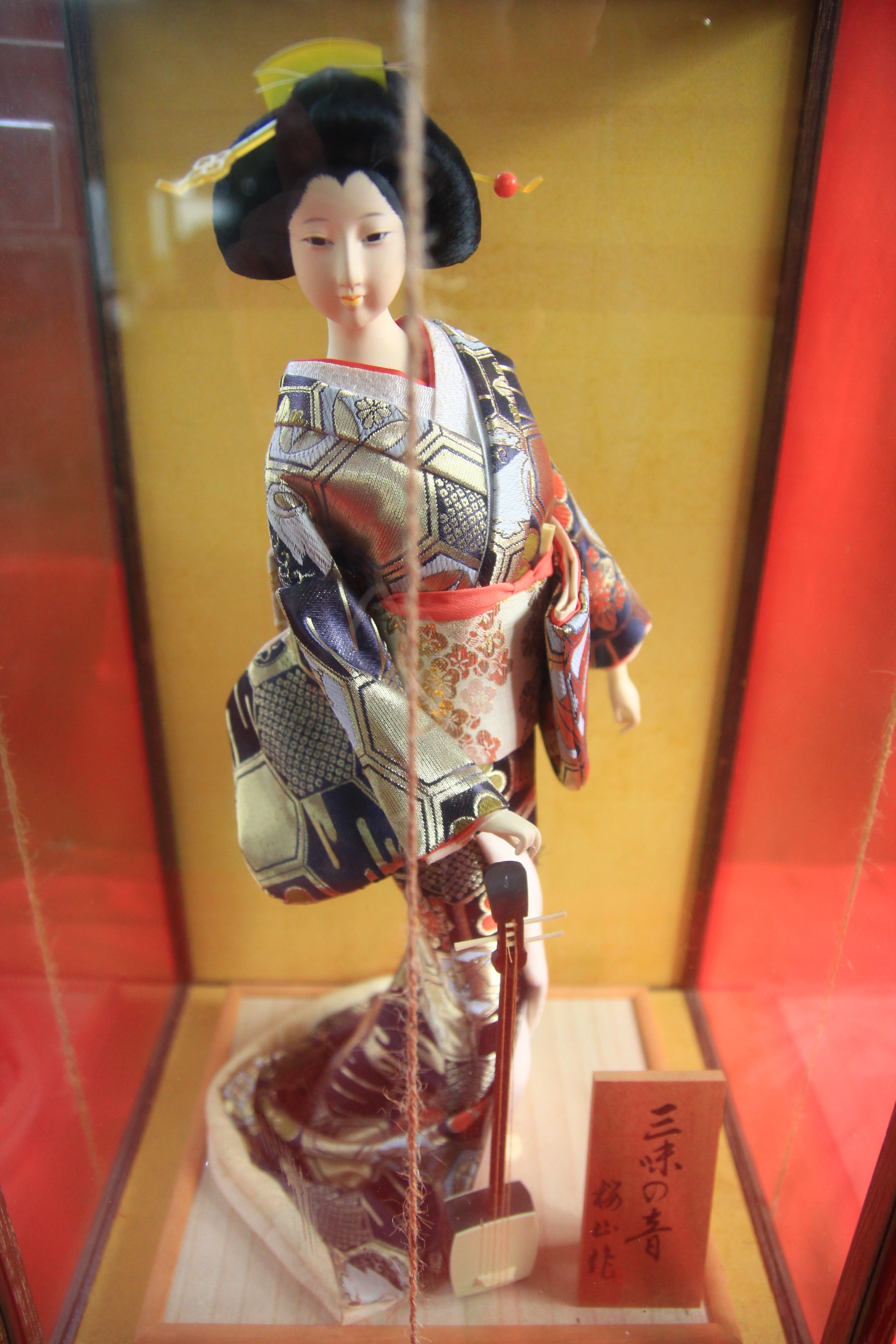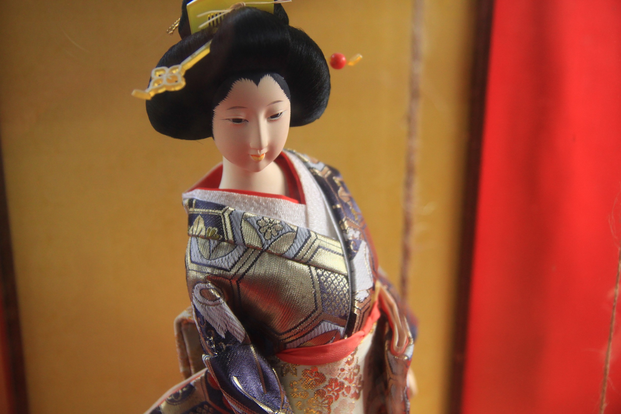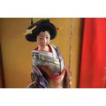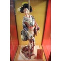 A 1920s Japanese traditional Geisha doll, with porcelain face, in glazed display cabinet of some age cabinet is 21in x 12in)