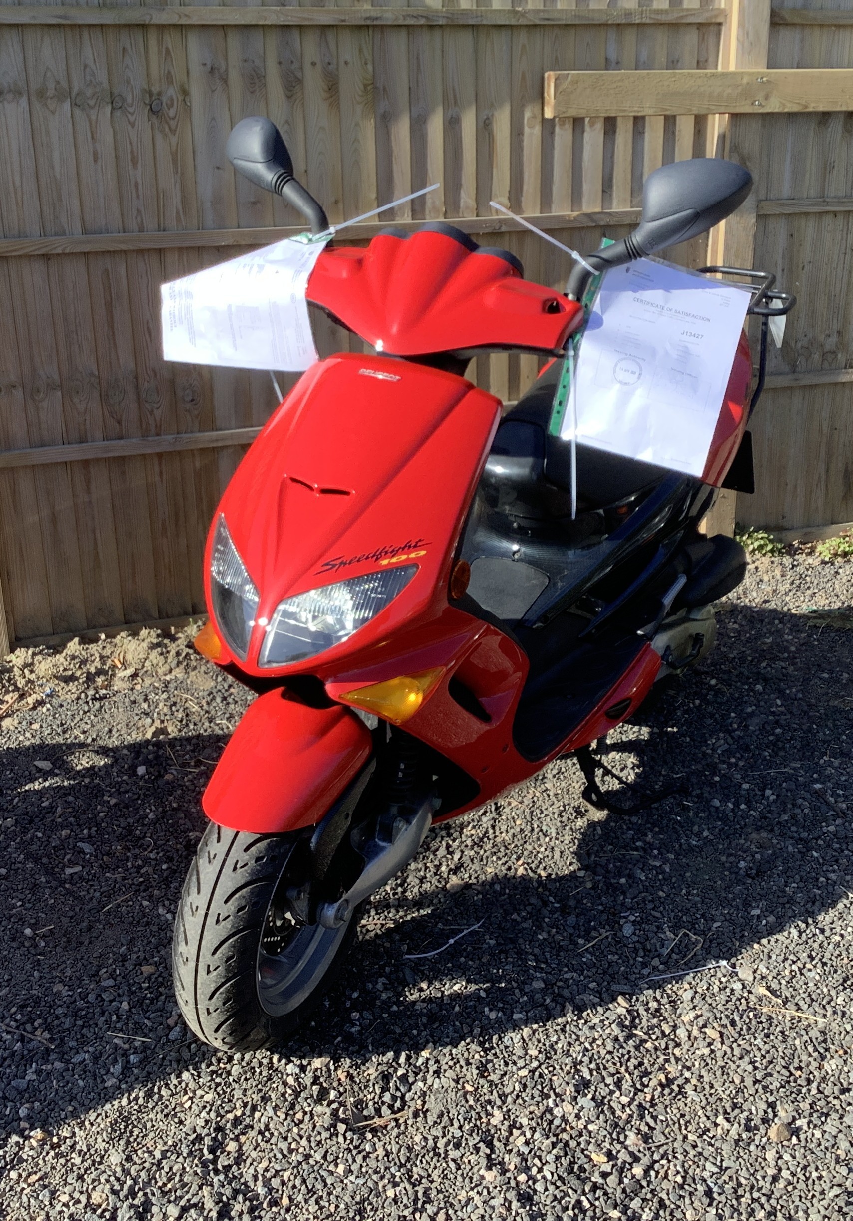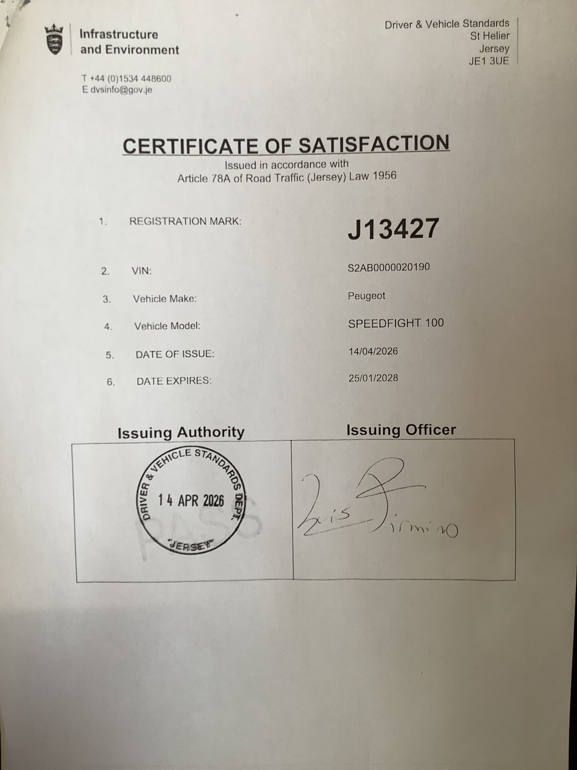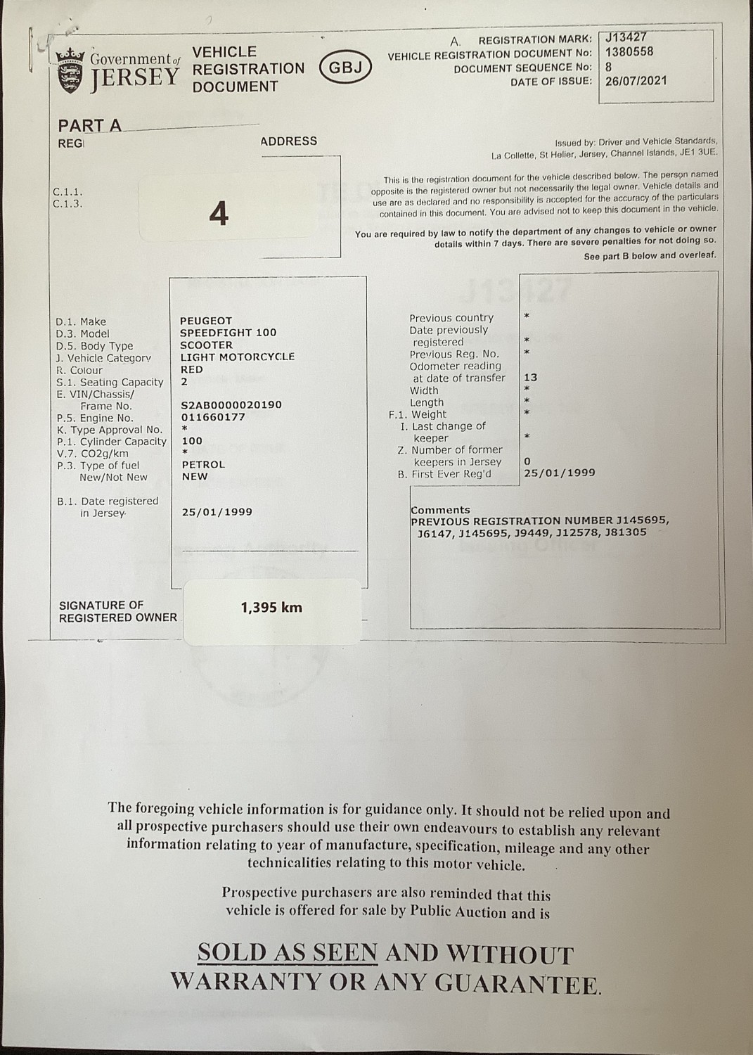 A 1999 Peugeot Speedfight 100 scooter J13427, odometer reading 1,395 kilometres only - current DVS Certificate of Satisfaction