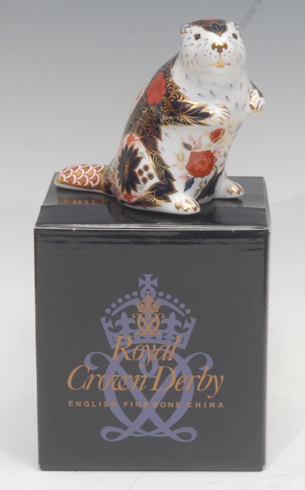 A Royal Crown Derby paperweight, Old Imari Beaver, decorated in the 1128 pattern, gold stopper,10.5cm, printed mark in red, boxed