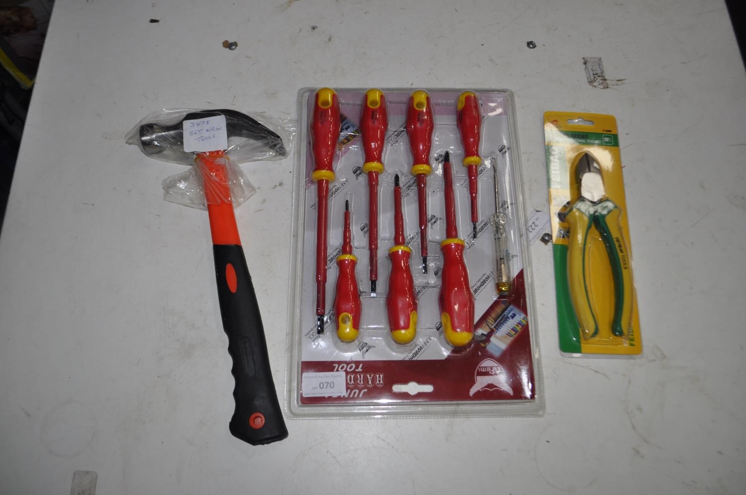 SET OF NEW TOOLS INC HAMMER, PLYERS AND FULL SCREWDRIVER SET