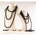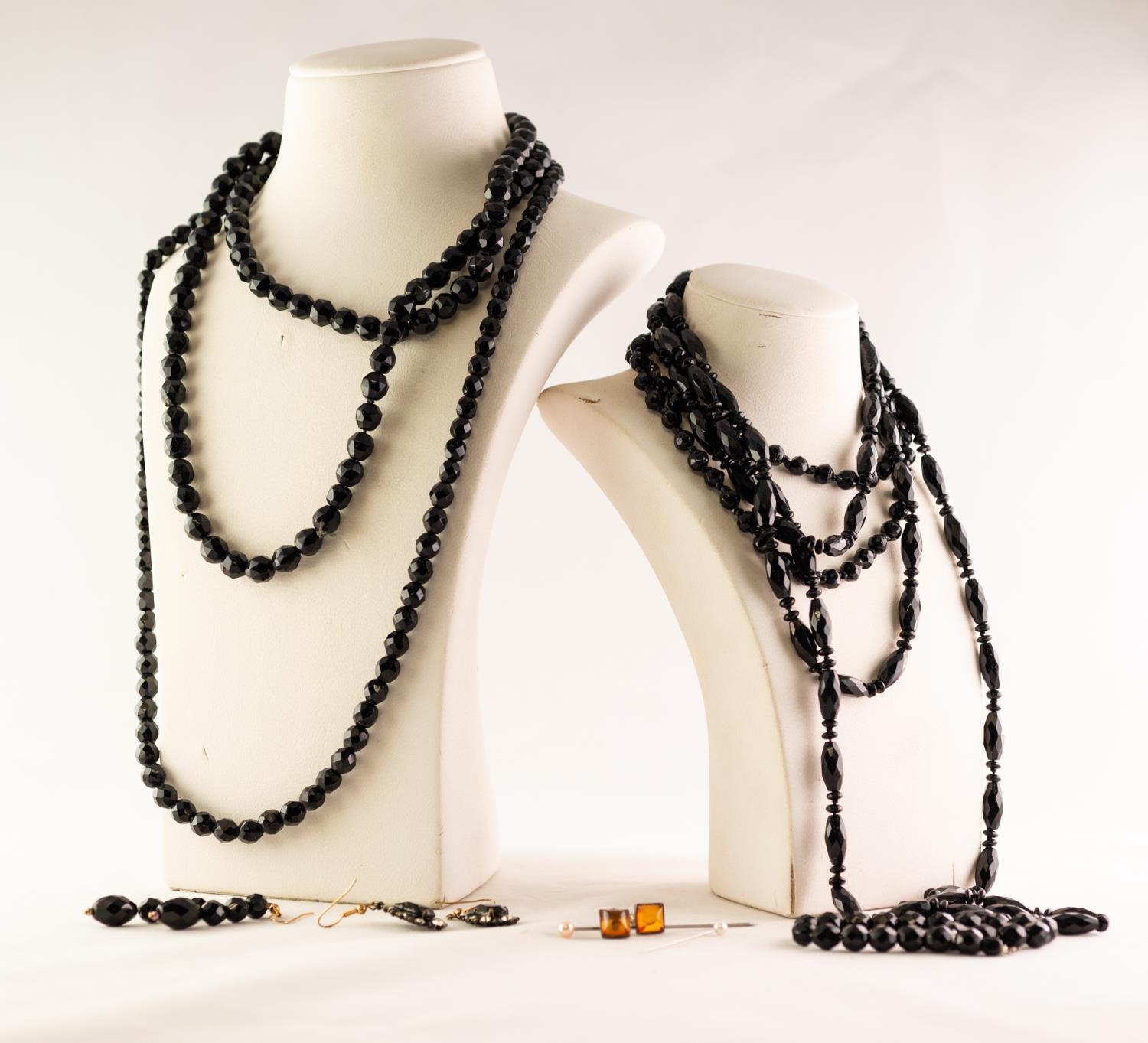 FOUR JET FACETED BEAD NECKLACES, a similar BRACELET and a pair of pendant EARRINGS; a pair of JET AND PASTE SET EARRINGS; a pair of white metal and probably amber set EARRINGS and two simulated pearl topped STICK PINS