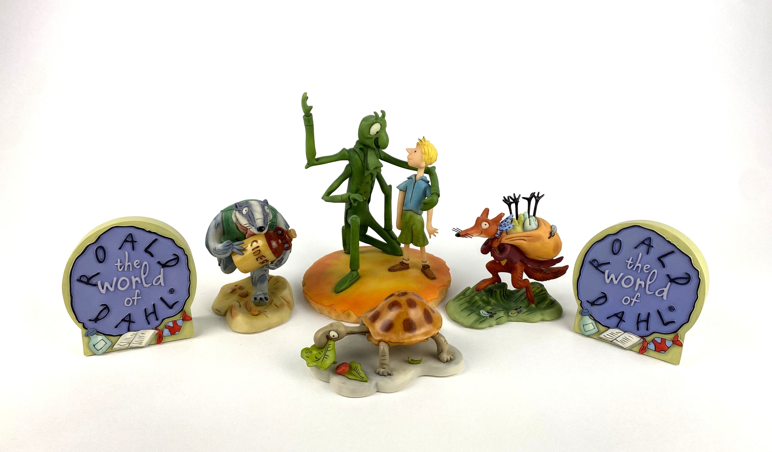 A collection of four boxed 'The World of Roald Dahl' Robert Harrop resin figurines based on Quentin Blake illustrations for Roald Dahl's stories, to include Badger from Fantastic Mr Fox 9.5cm high, Fantastic Mr Fox, James and the Grasshopper from James and the Giant Peach, and Alfie from Esio Trot, together with two Roald Dahl plaques and an advertising display card