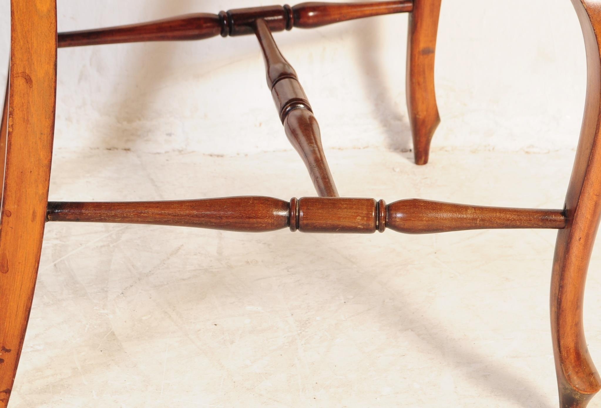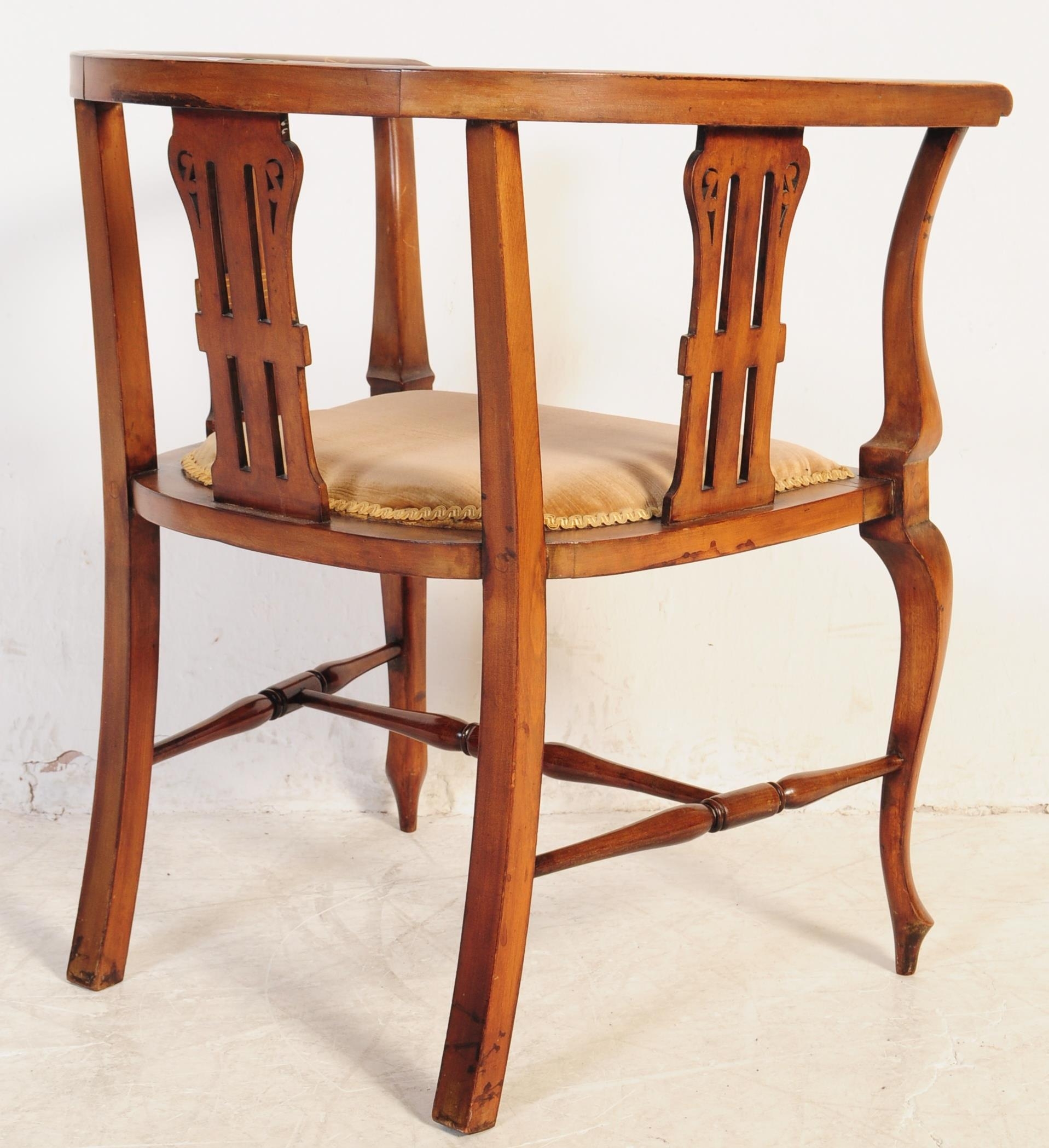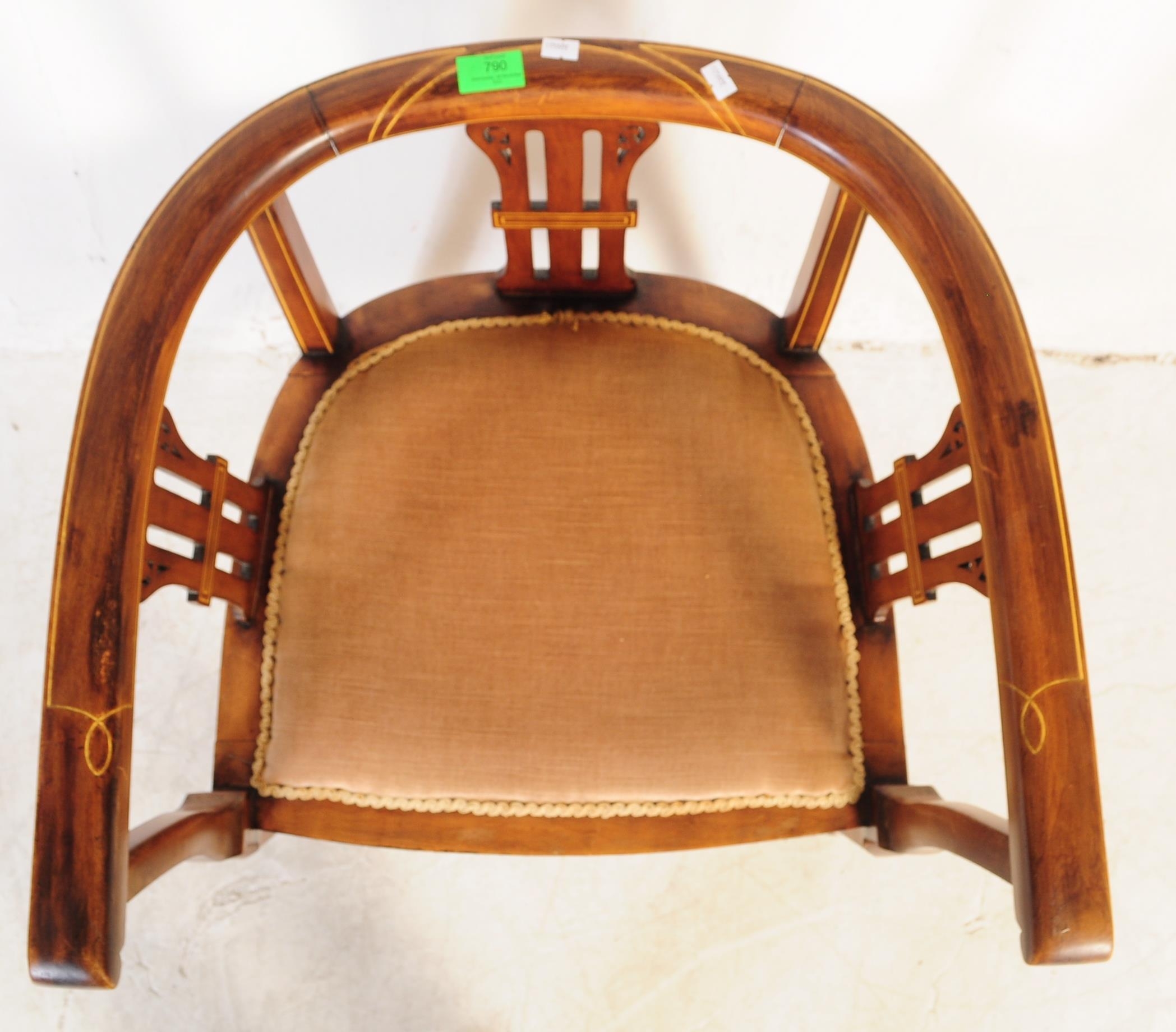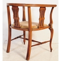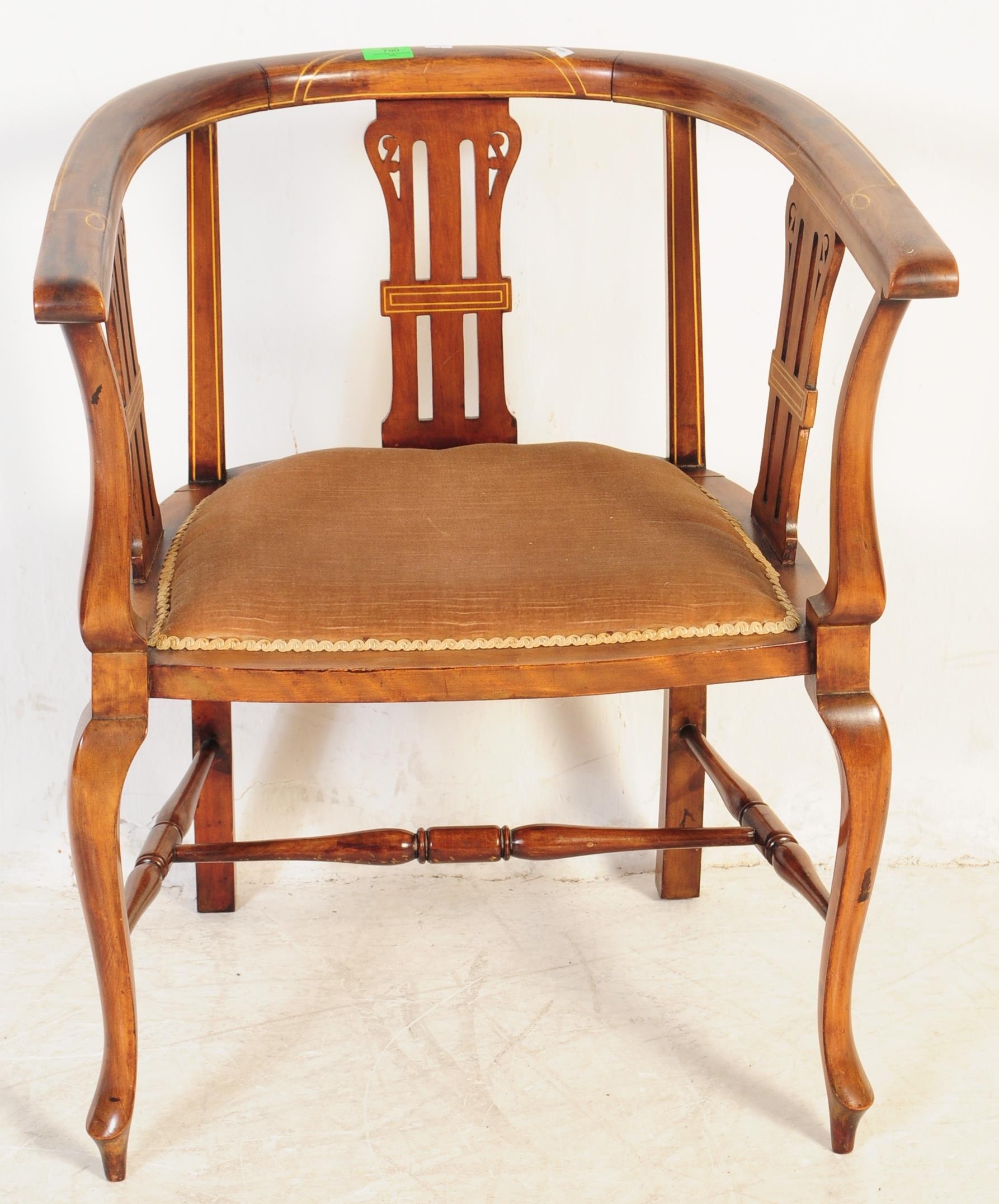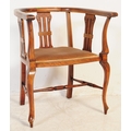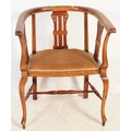 An Edwardian mahogany tub armchair. The chair being raised on cabriole legs with pad upholstered seat with shaped top rail over gallery supports. Measures approx. 73cm x 60cm x 50cm.