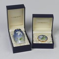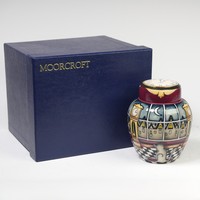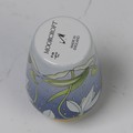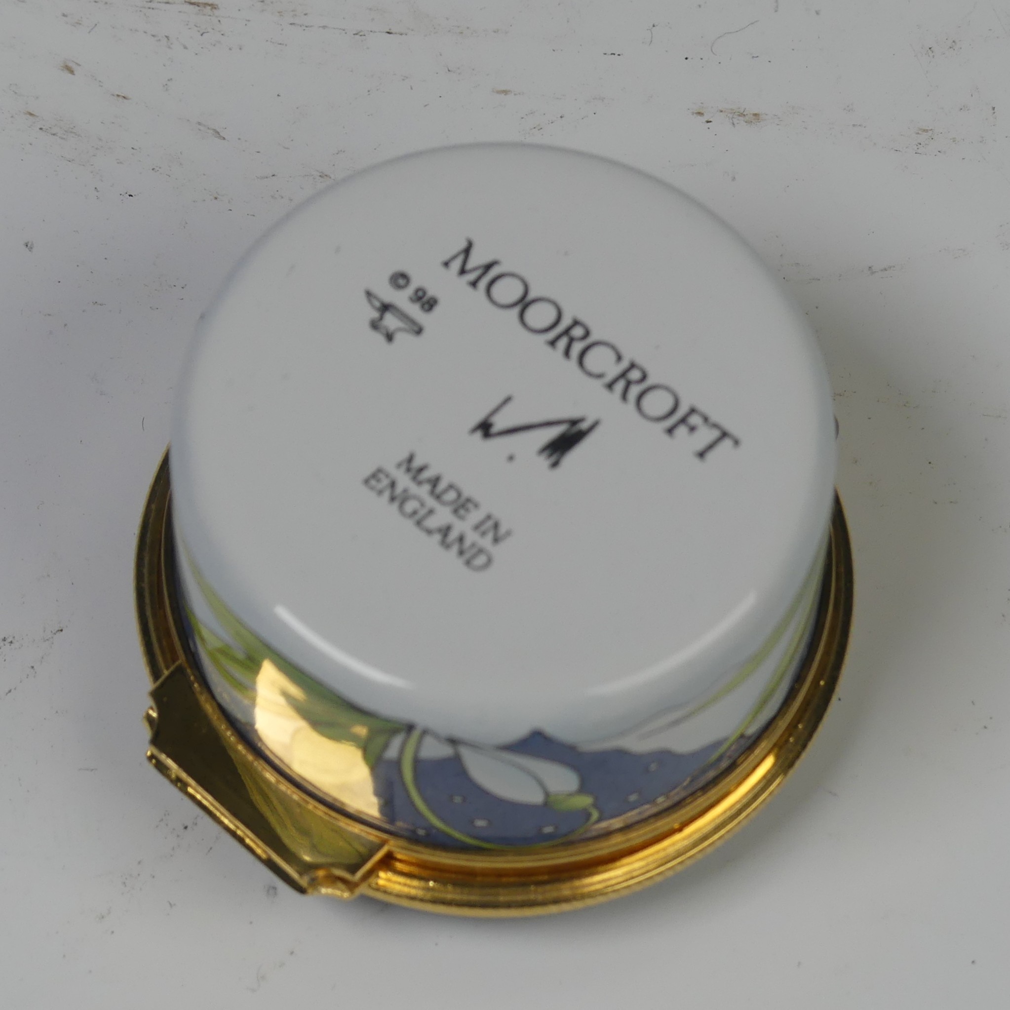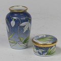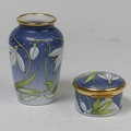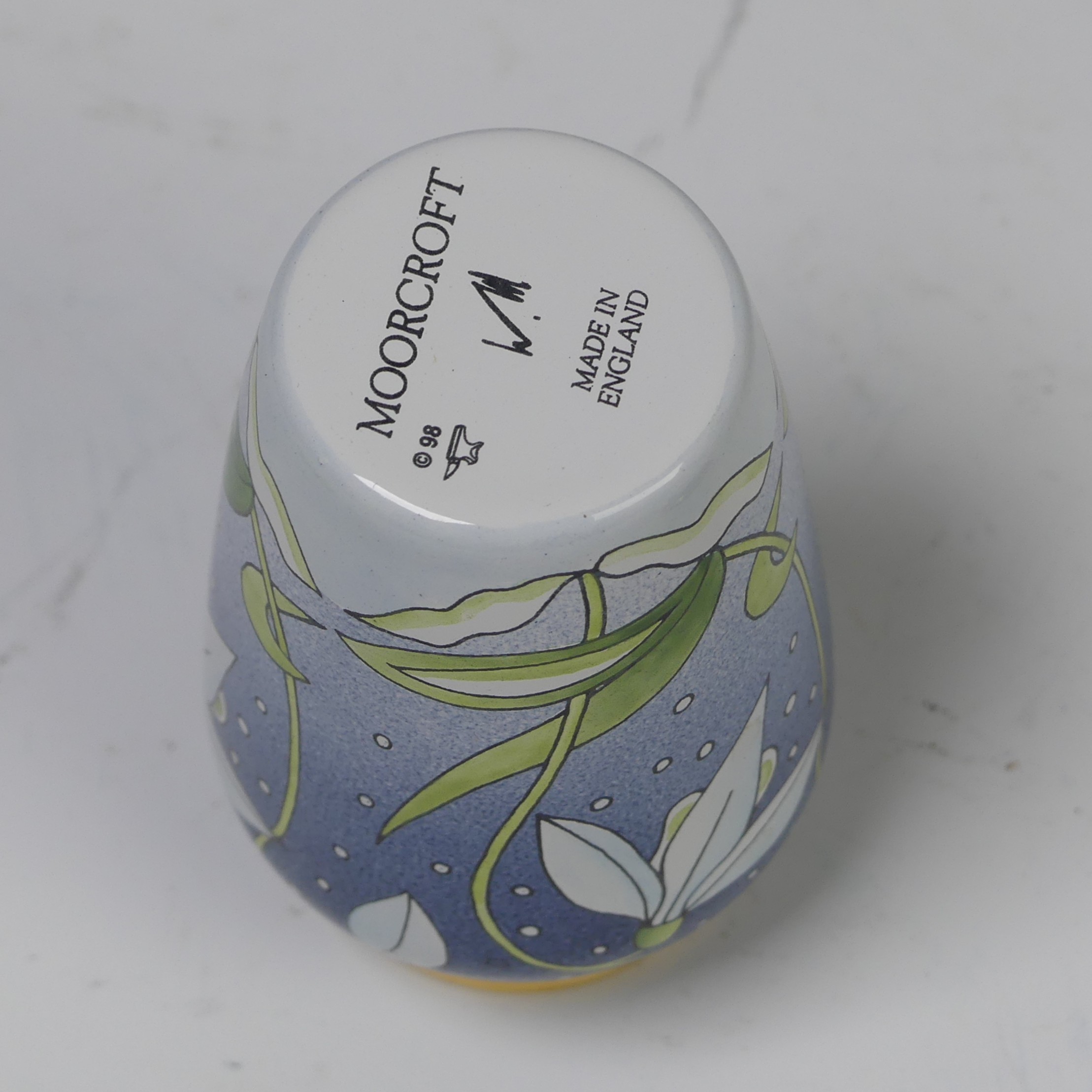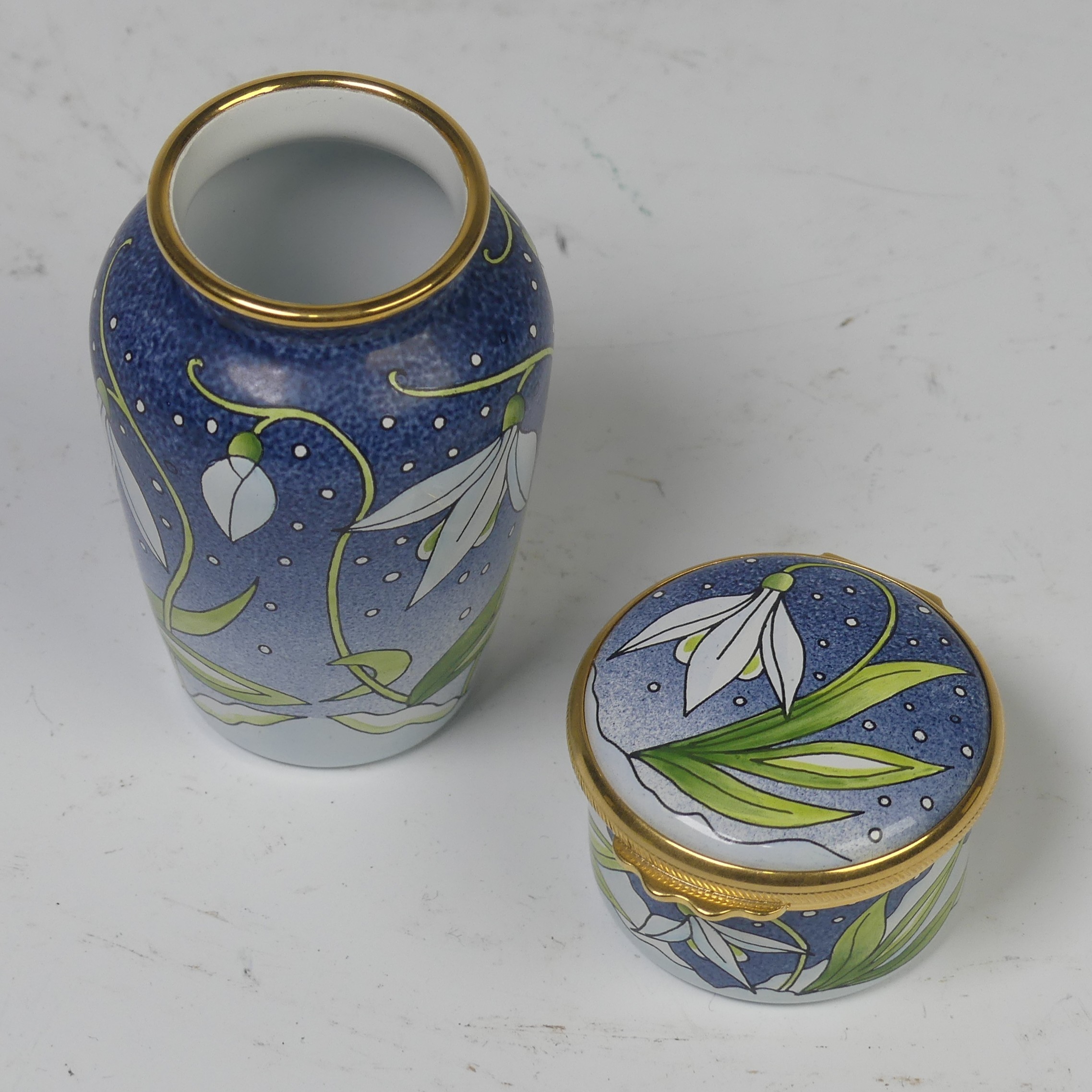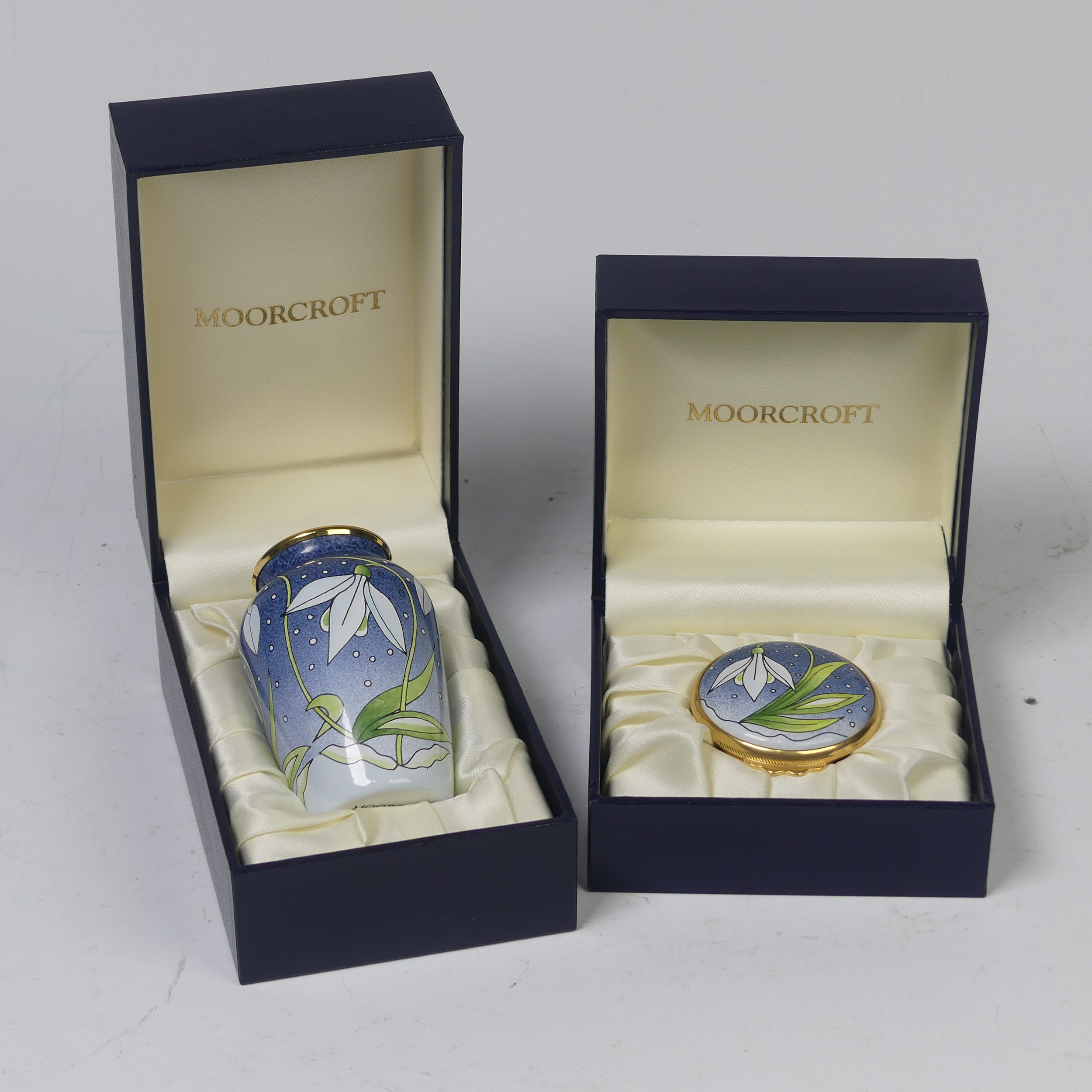 A Moorcroft Pottery miniature ‘Snowdrop’ enamelled vase, dated 1998, decorated in printed coloured enamels and gilt, printed marks to base, in original box, 7.5cm high, together with a Moorcroft ‘Snowdrop’ enamelled Pill Box, in original box (2)