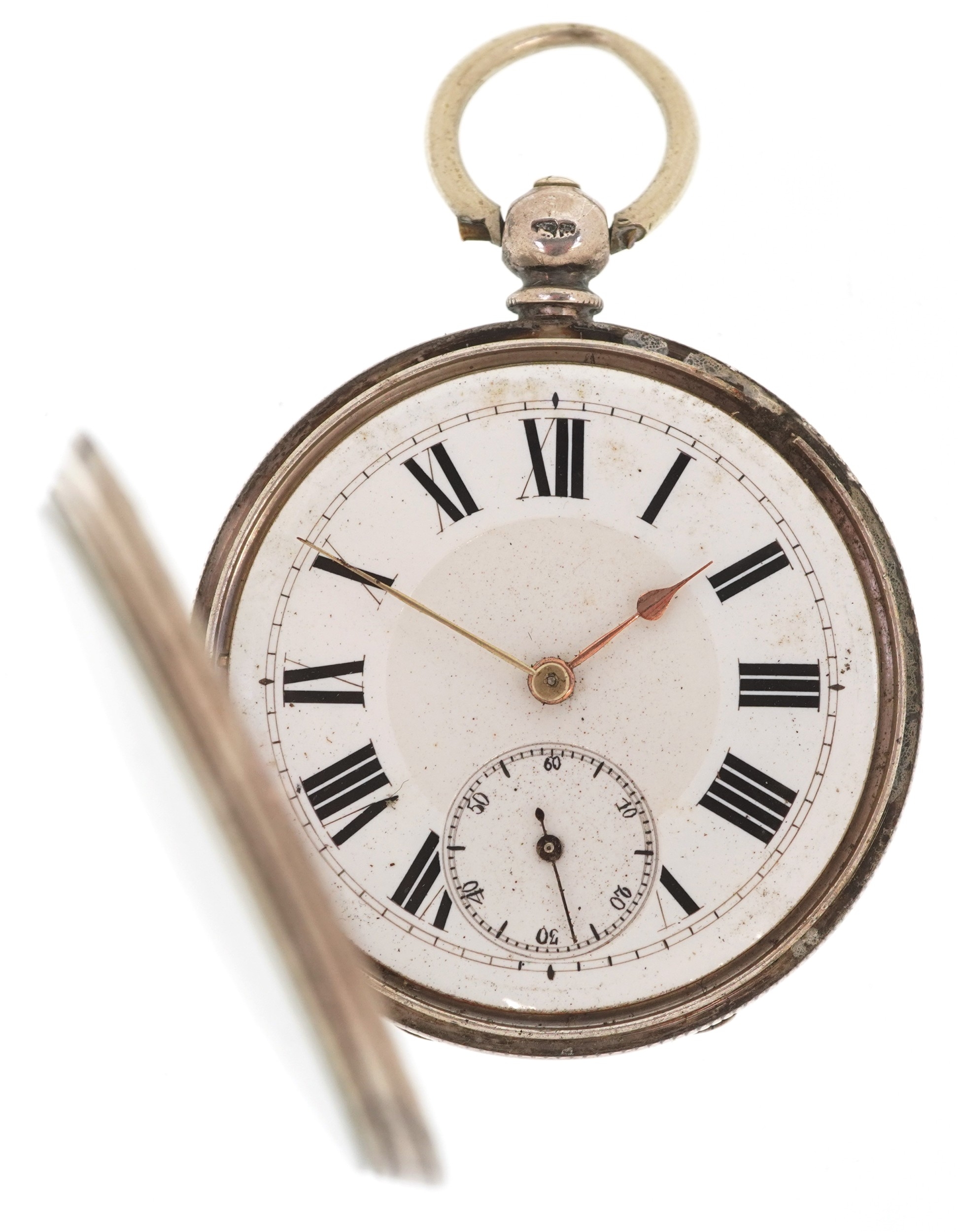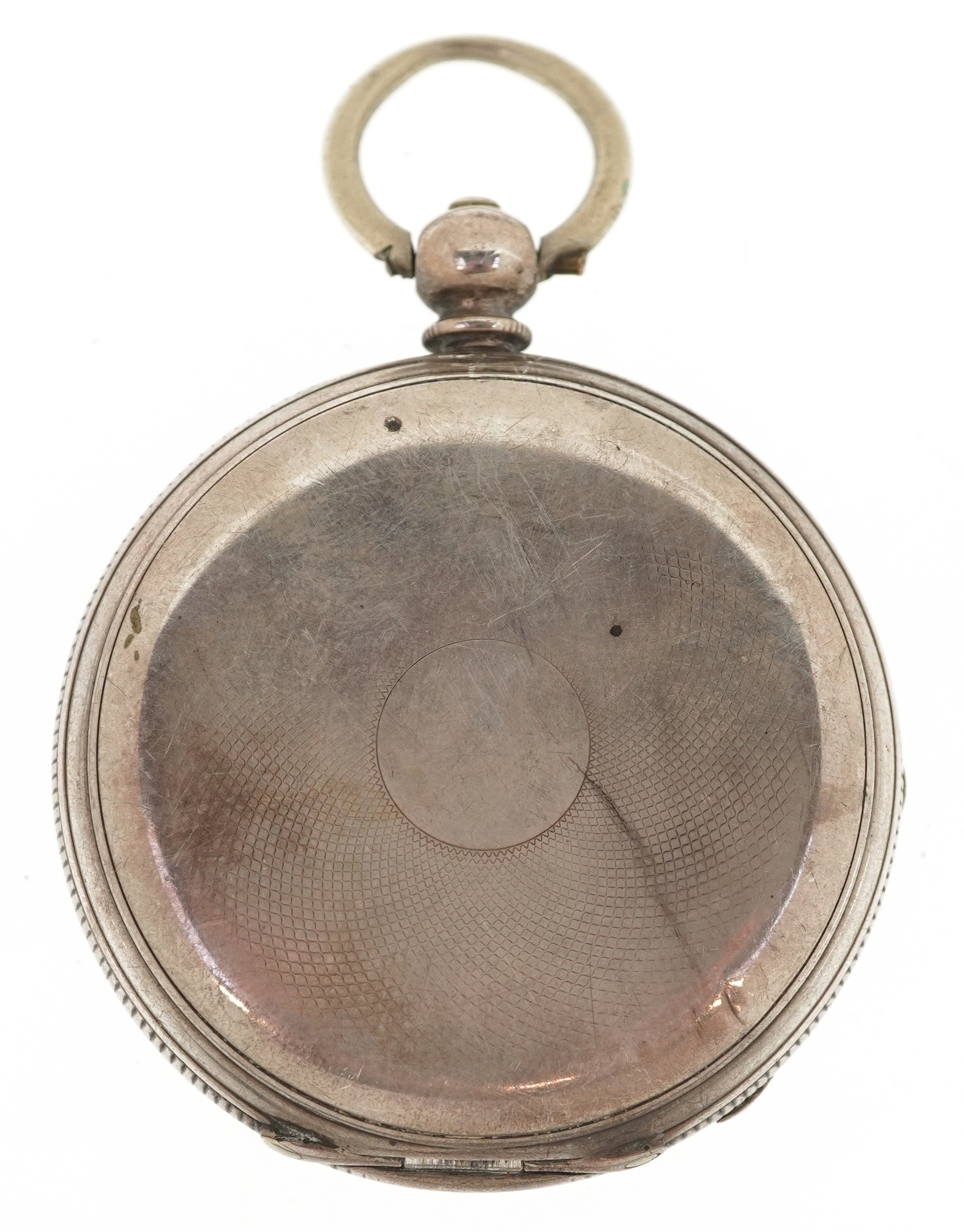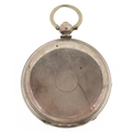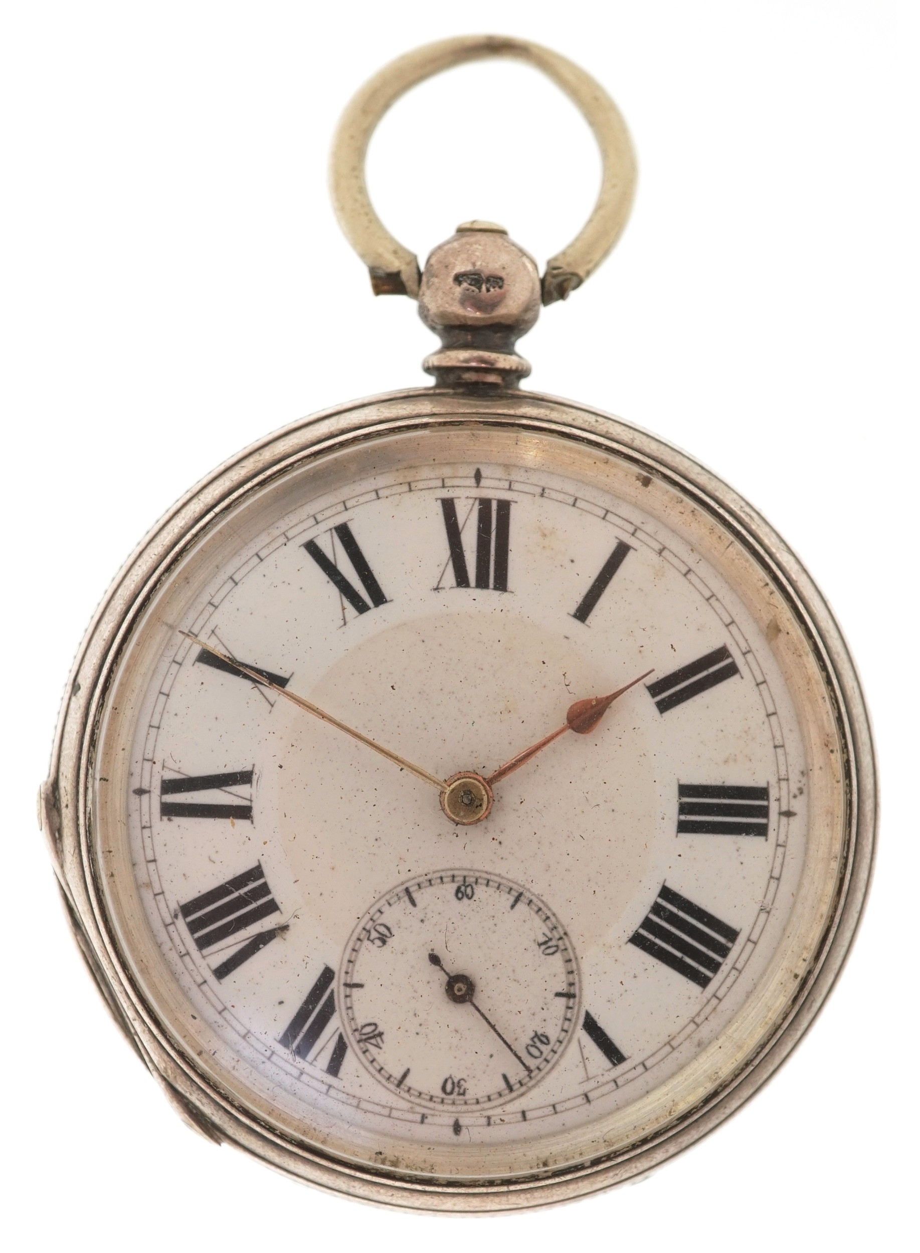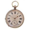 A Victorian gentlemen's silver open face keywind pocket watch having enamelled dial with Roman numerals, 48mm in diameter.