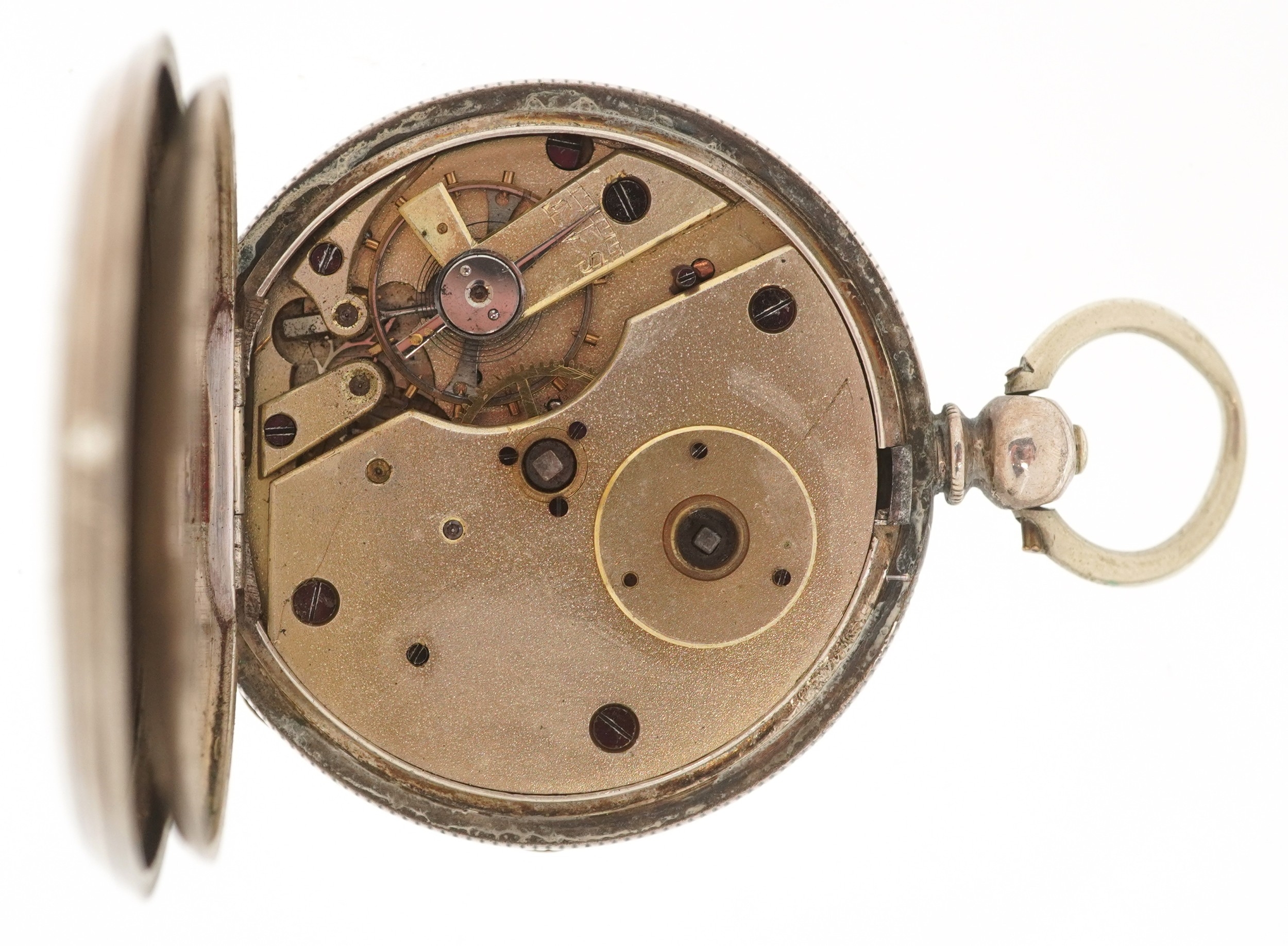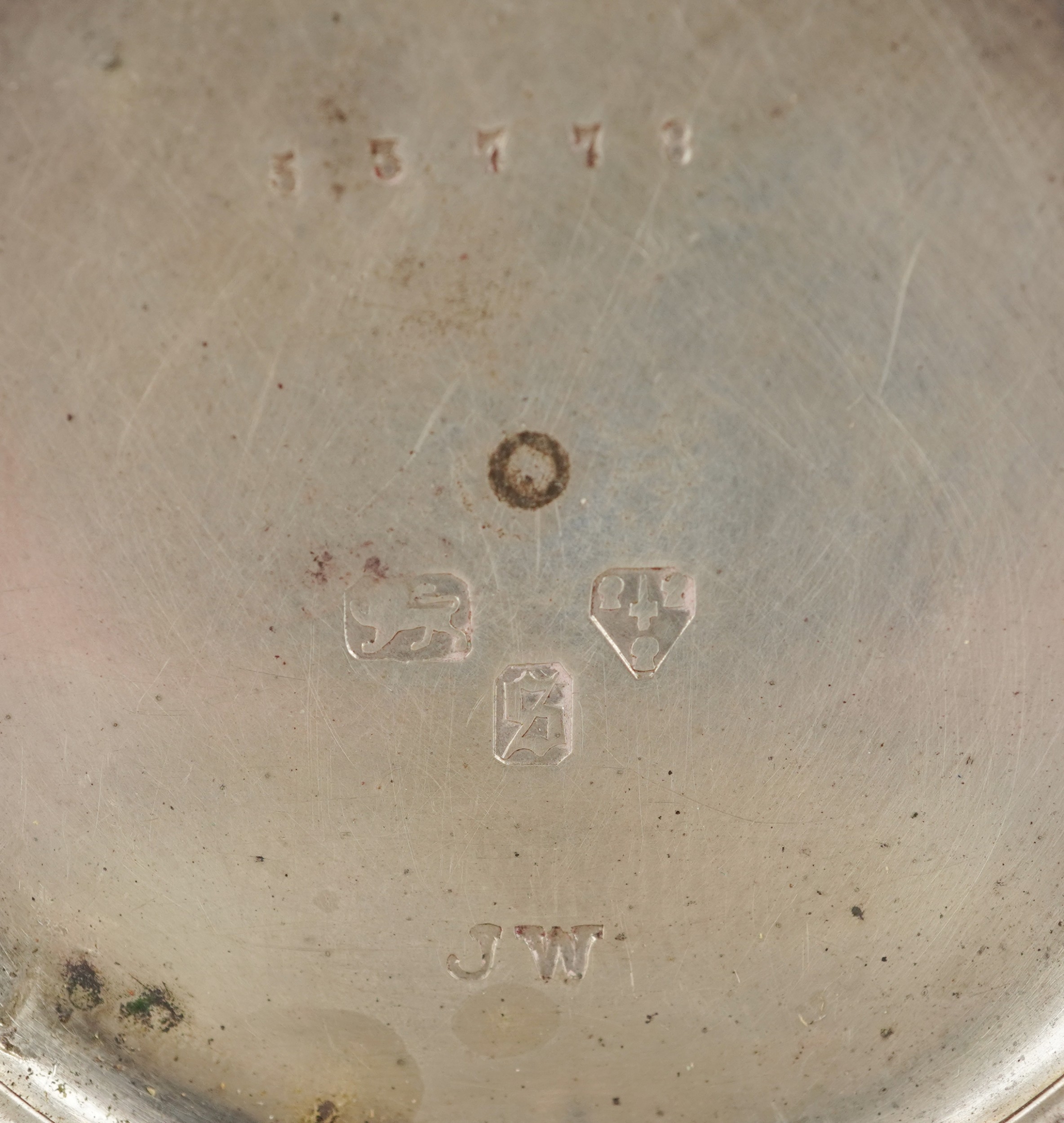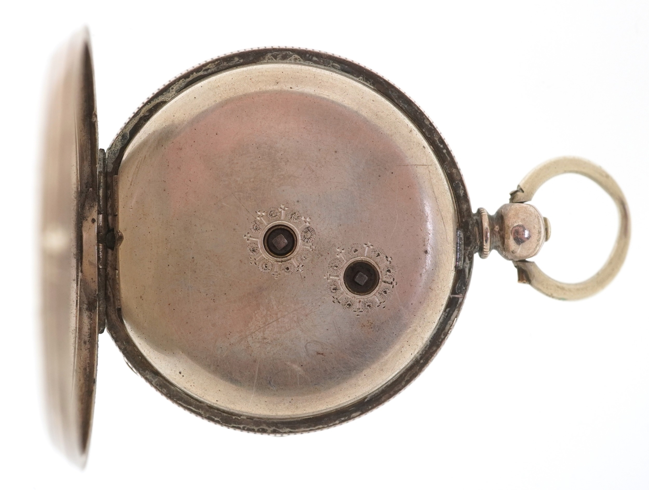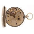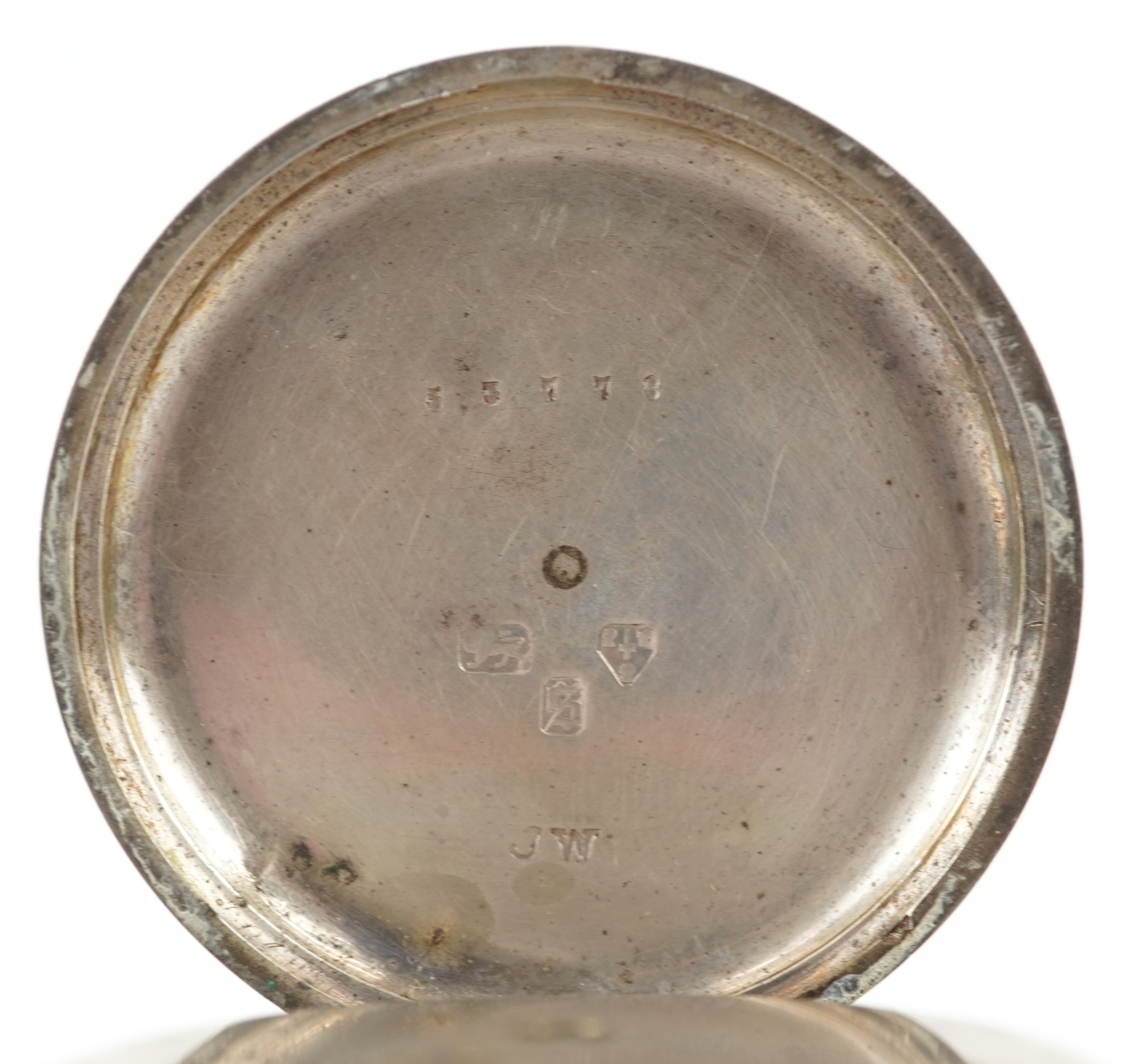 A Victorian gentlemen's silver open face keywind pocket watch having enamelled dial with Roman numerals, 48mm in diameter.