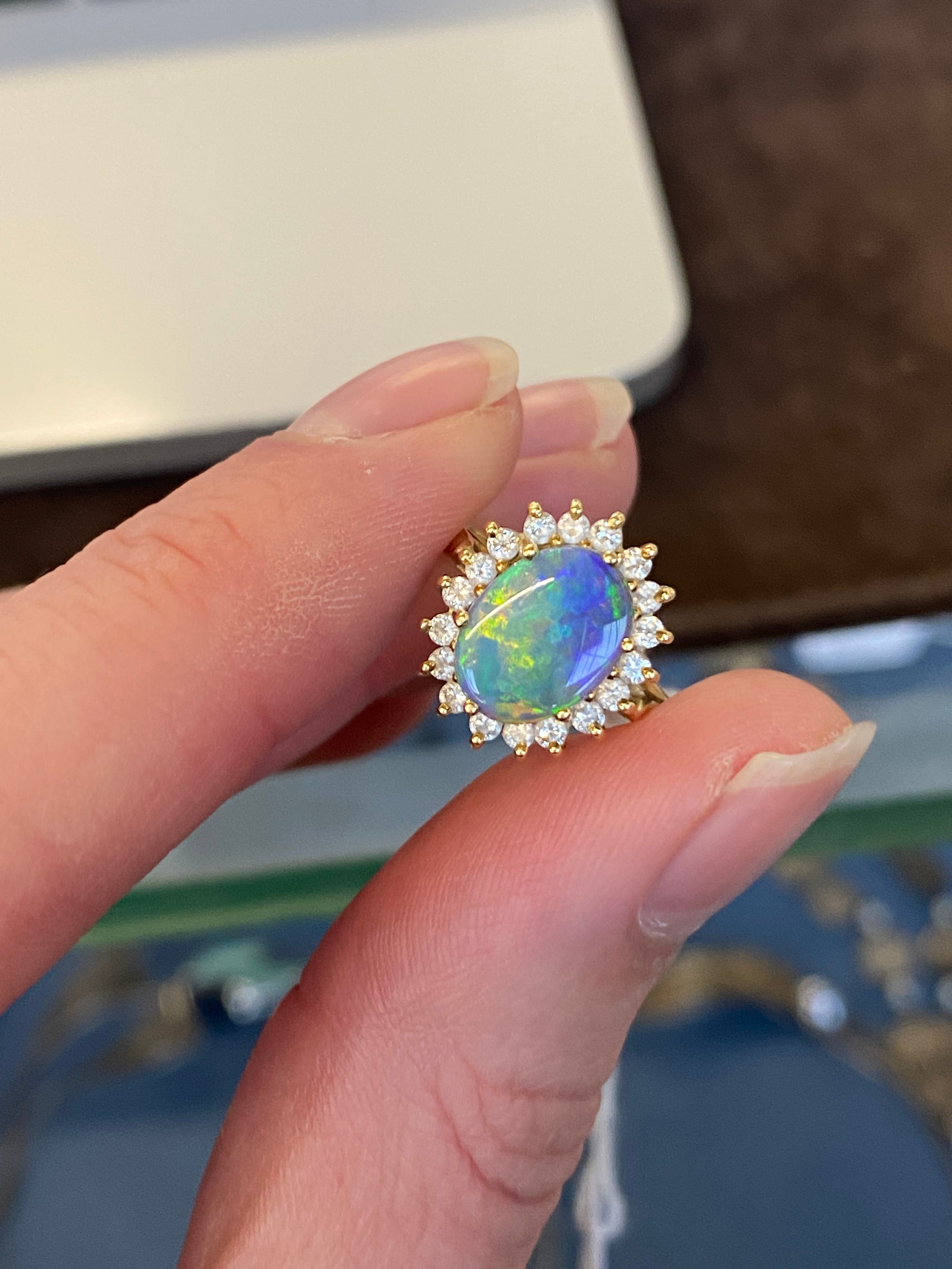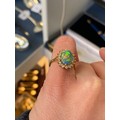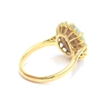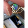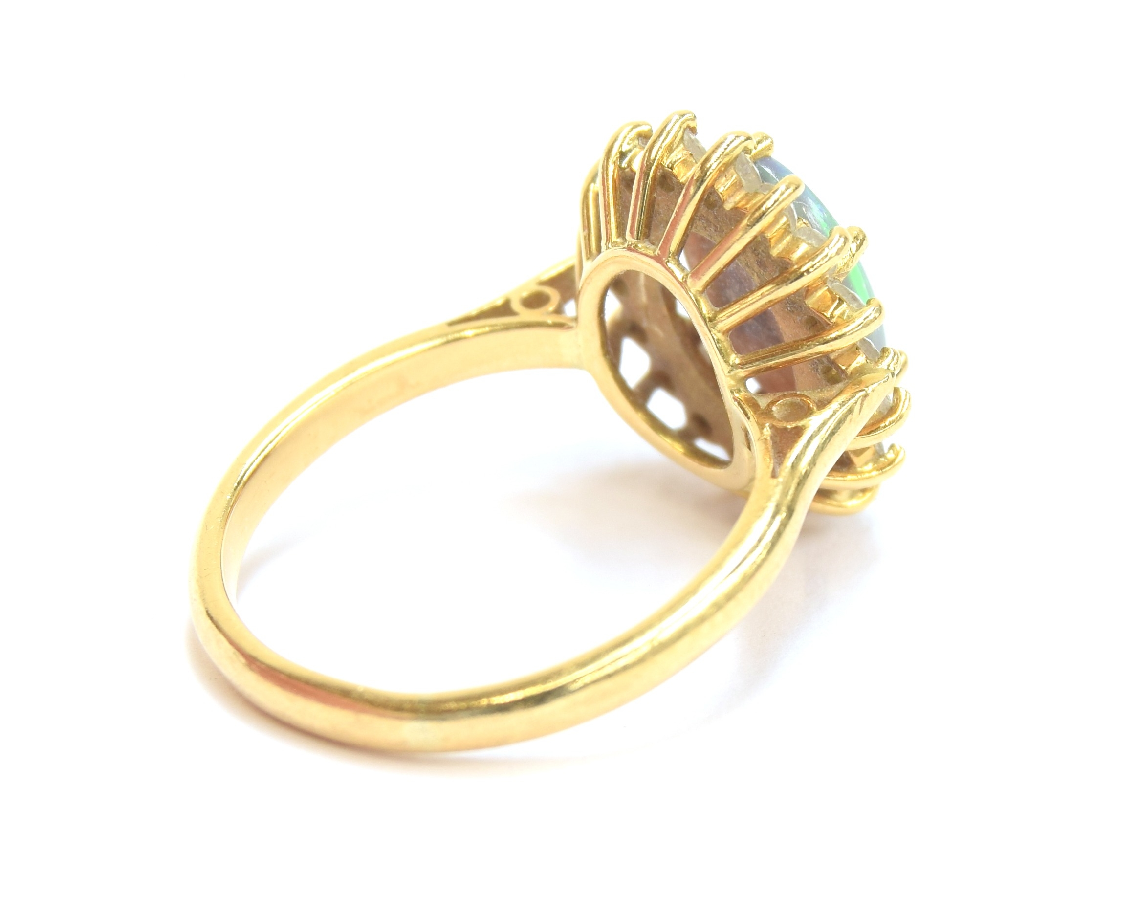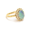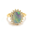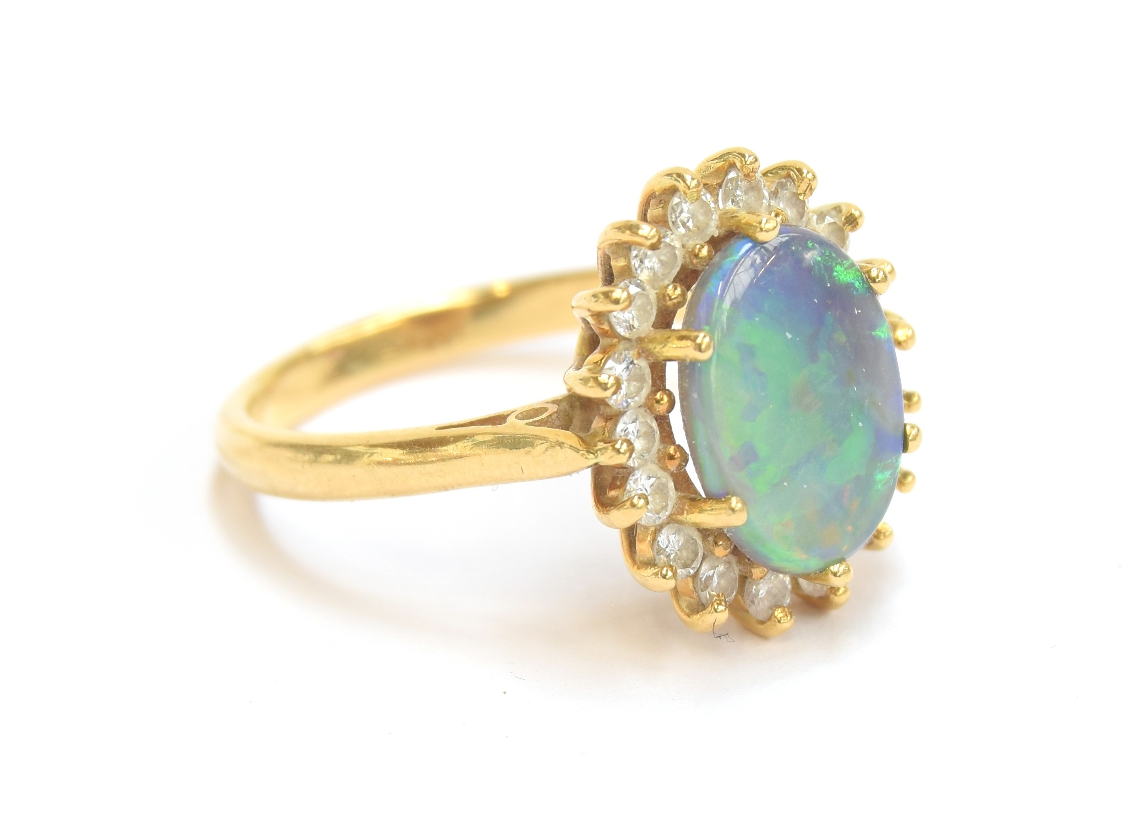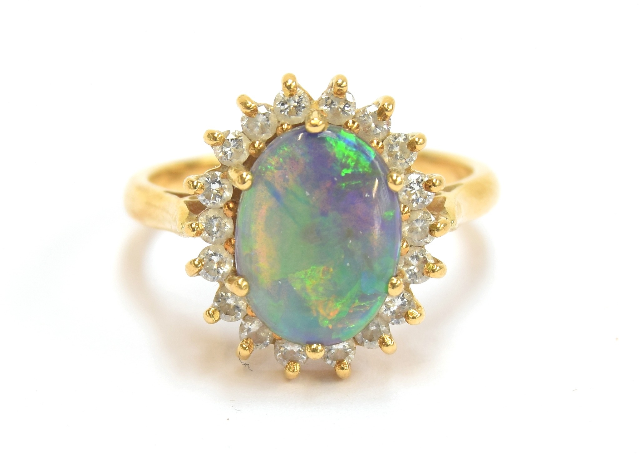 An 18ct yellow gold, boulder opal and diamond cluster ring, the opal 10x8mm, size L 1/2, 4.3g