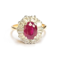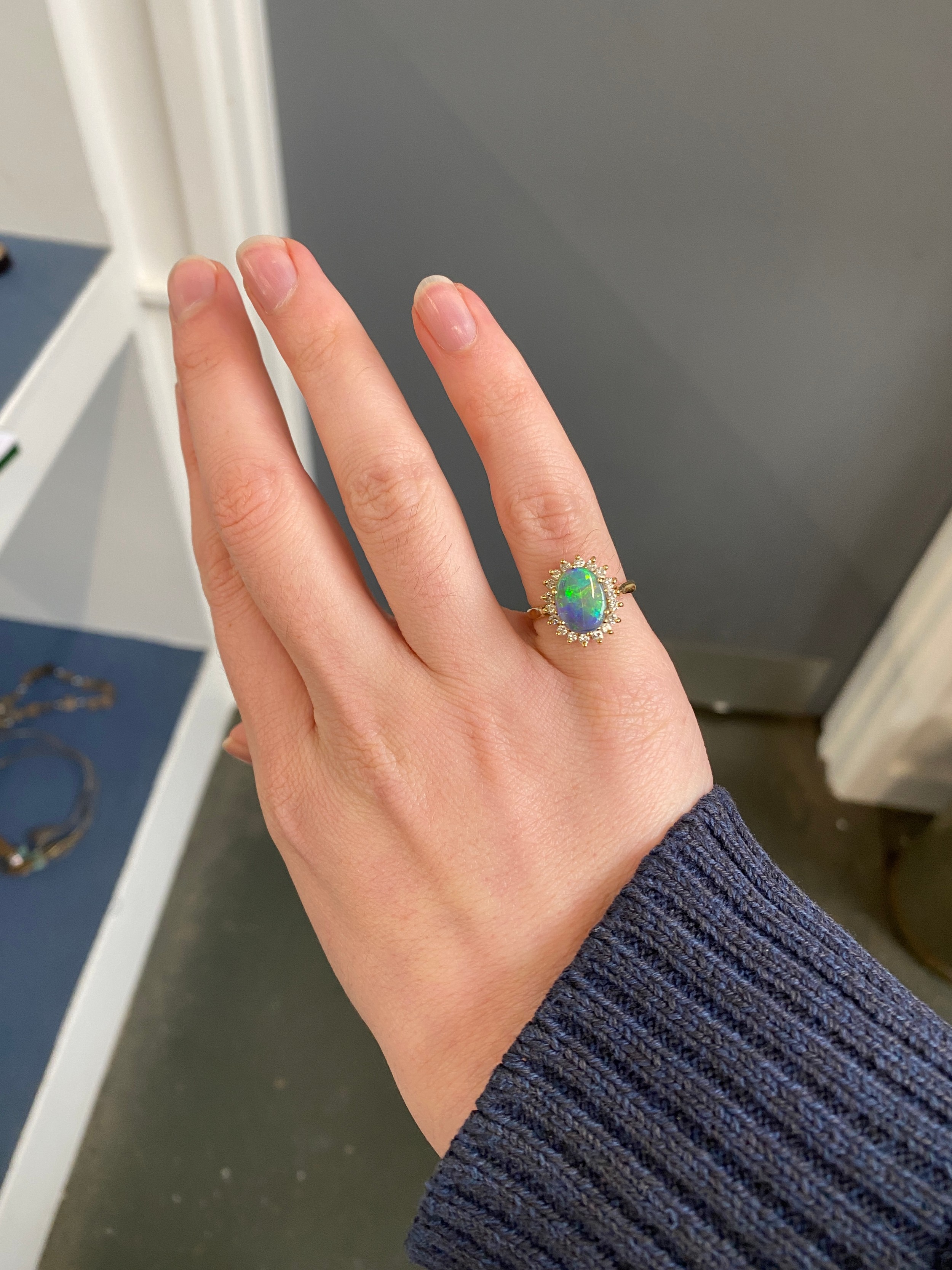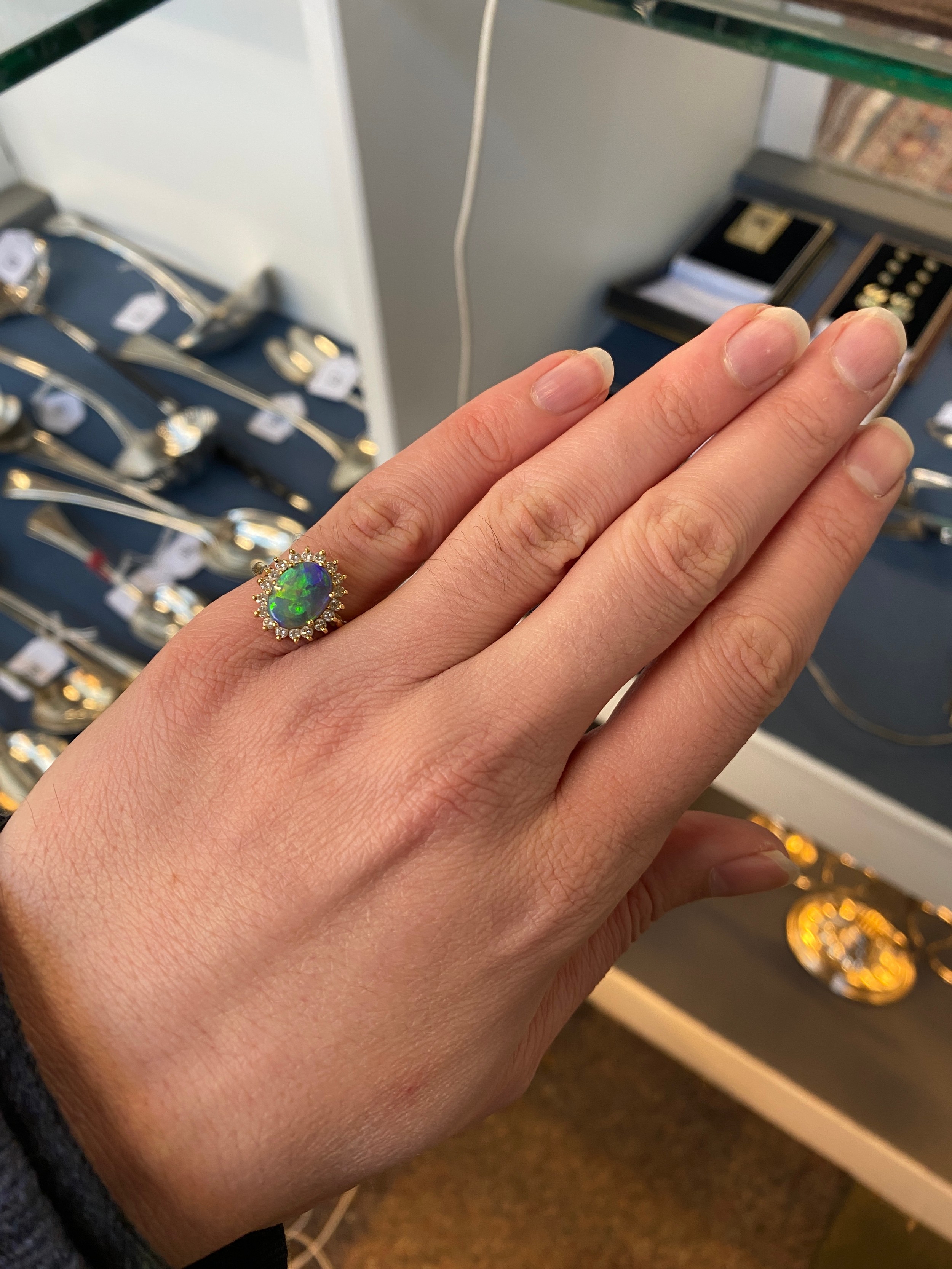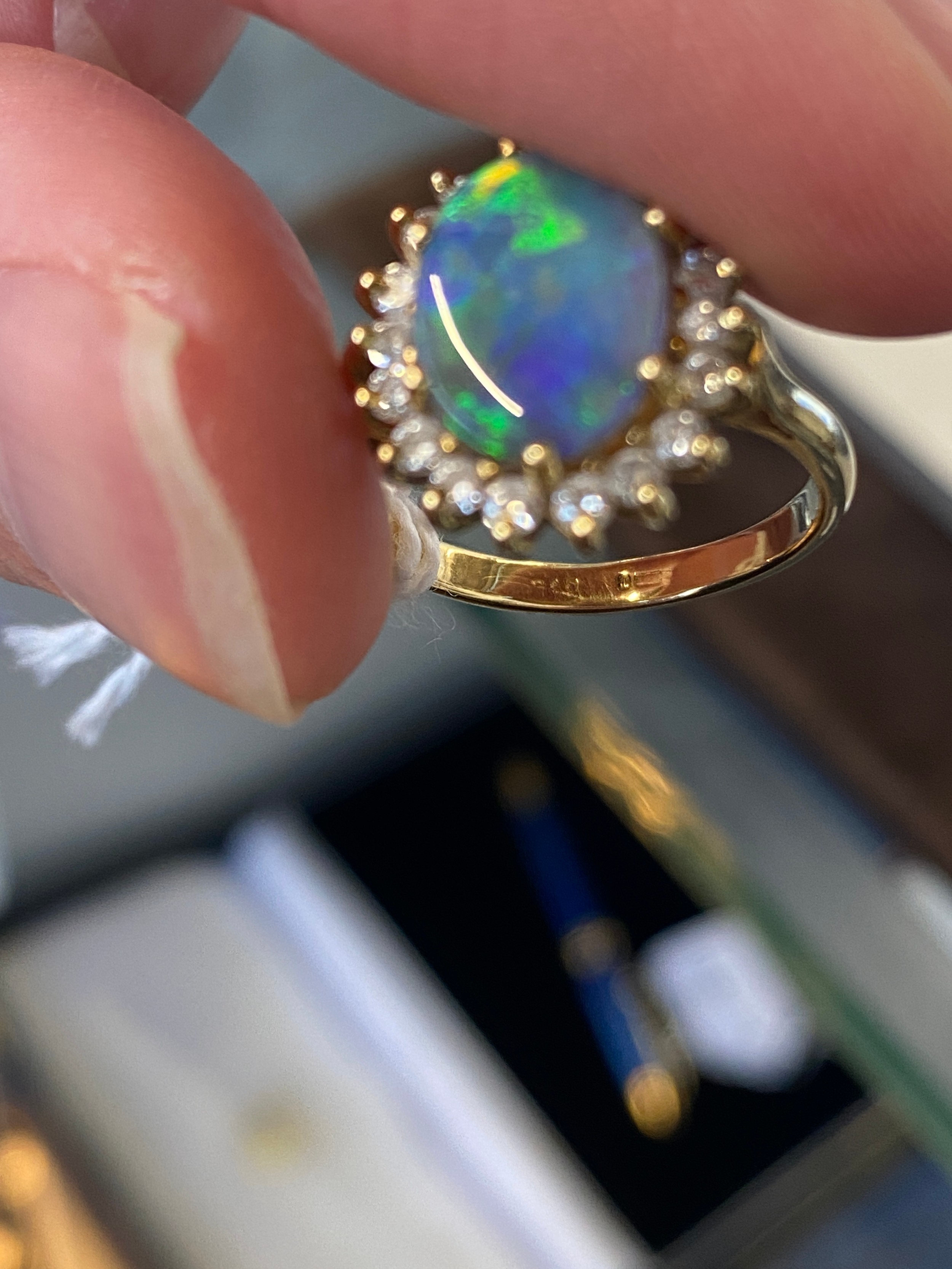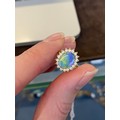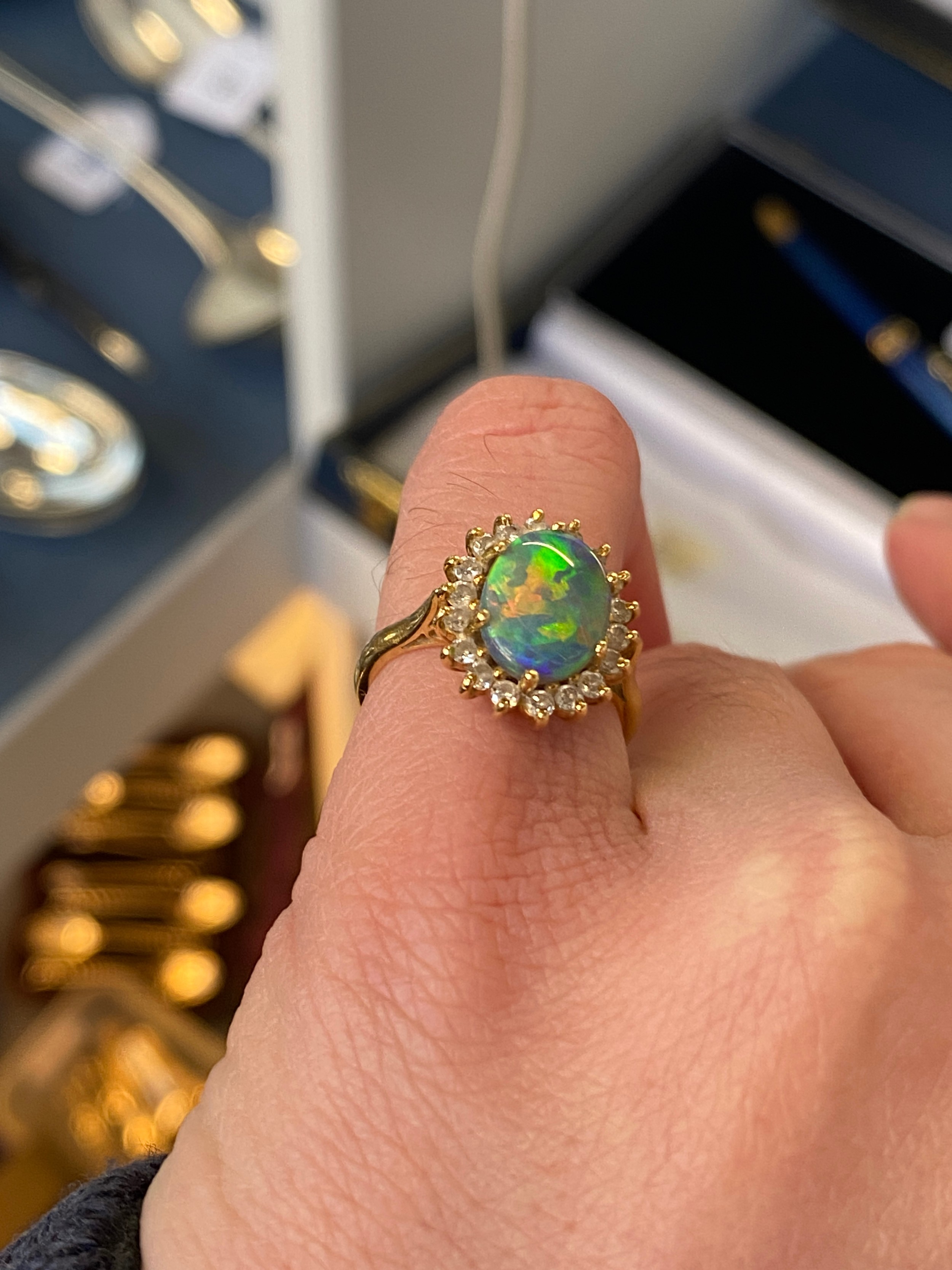 An 18ct yellow gold, boulder opal and diamond cluster ring, the opal 10x8mm, size L 1/2, 4.3g
