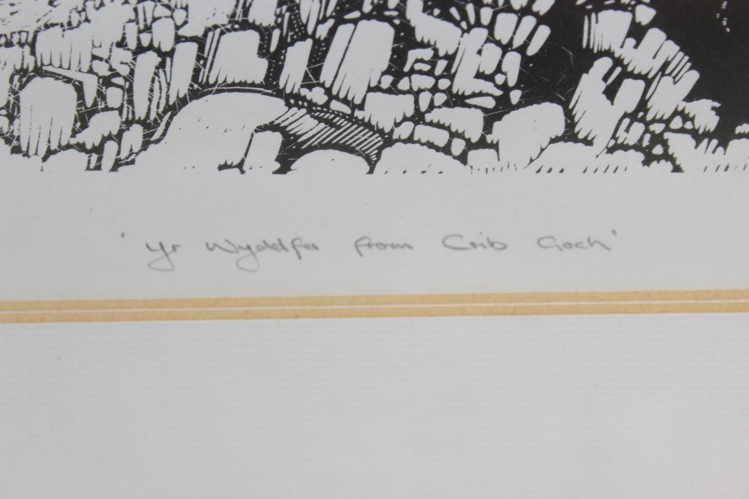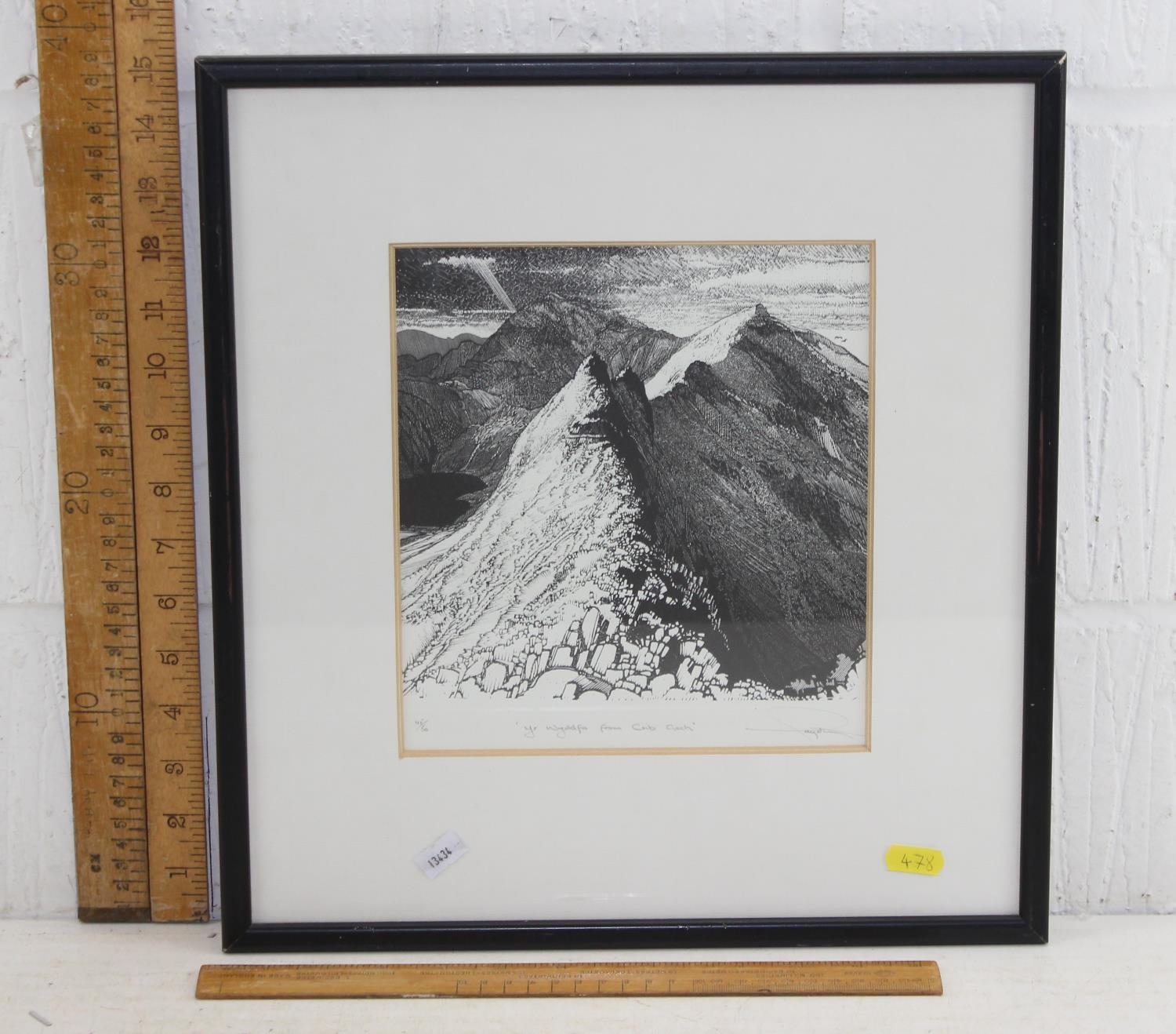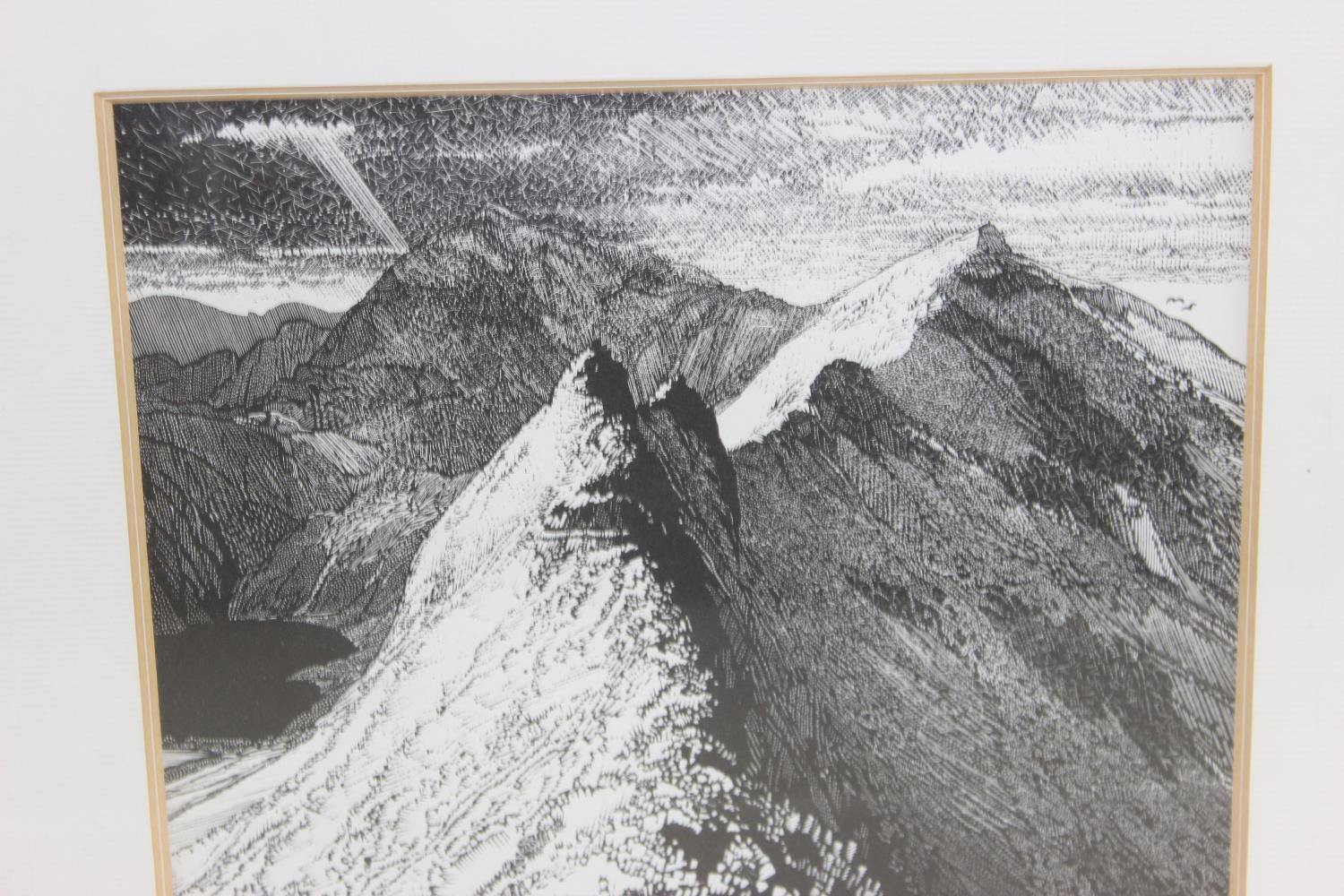 Limited edition engraving of Crib Goch, numbered 45/50 and indistinctly signed, Al Abbar Dubai gallery label to verso.