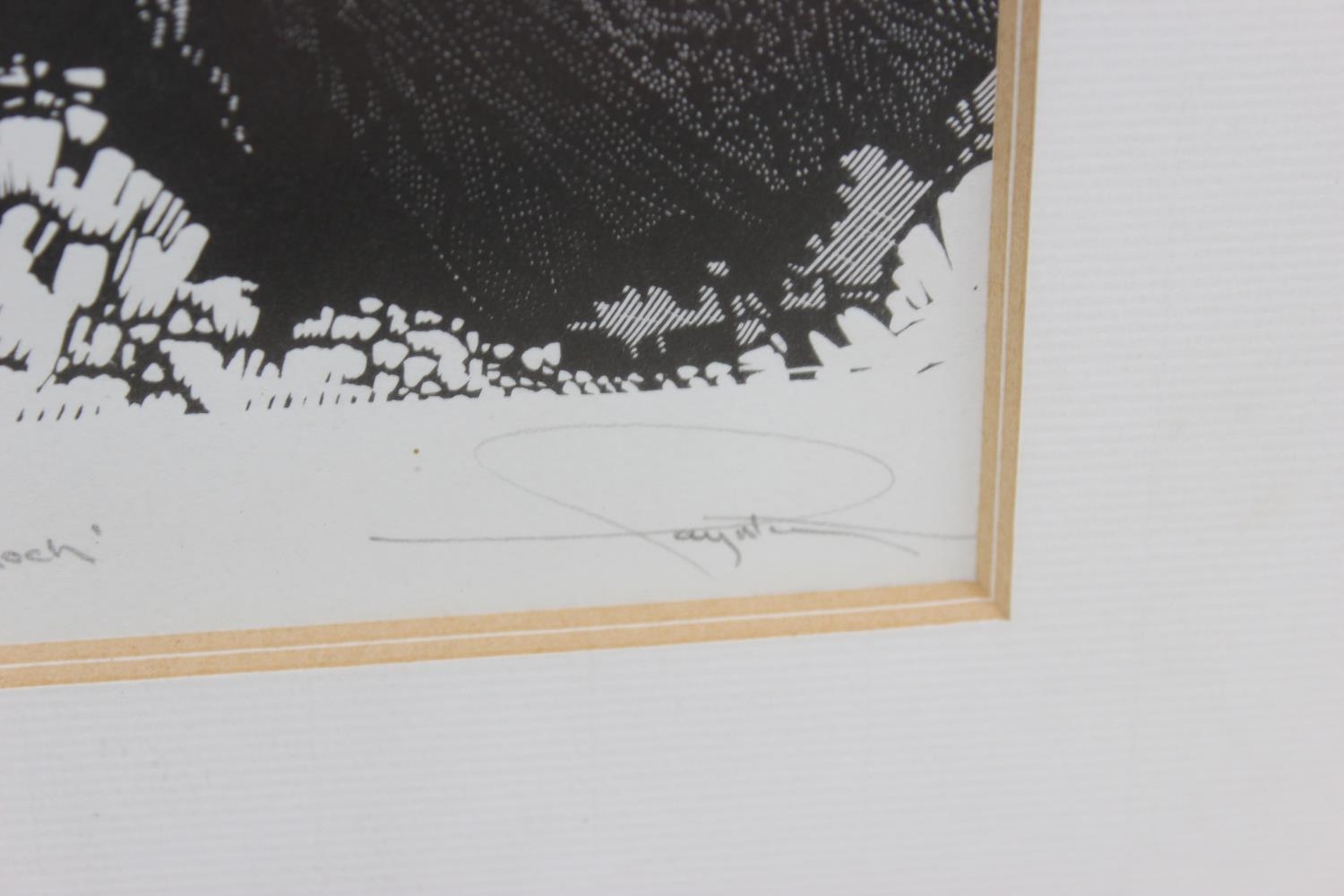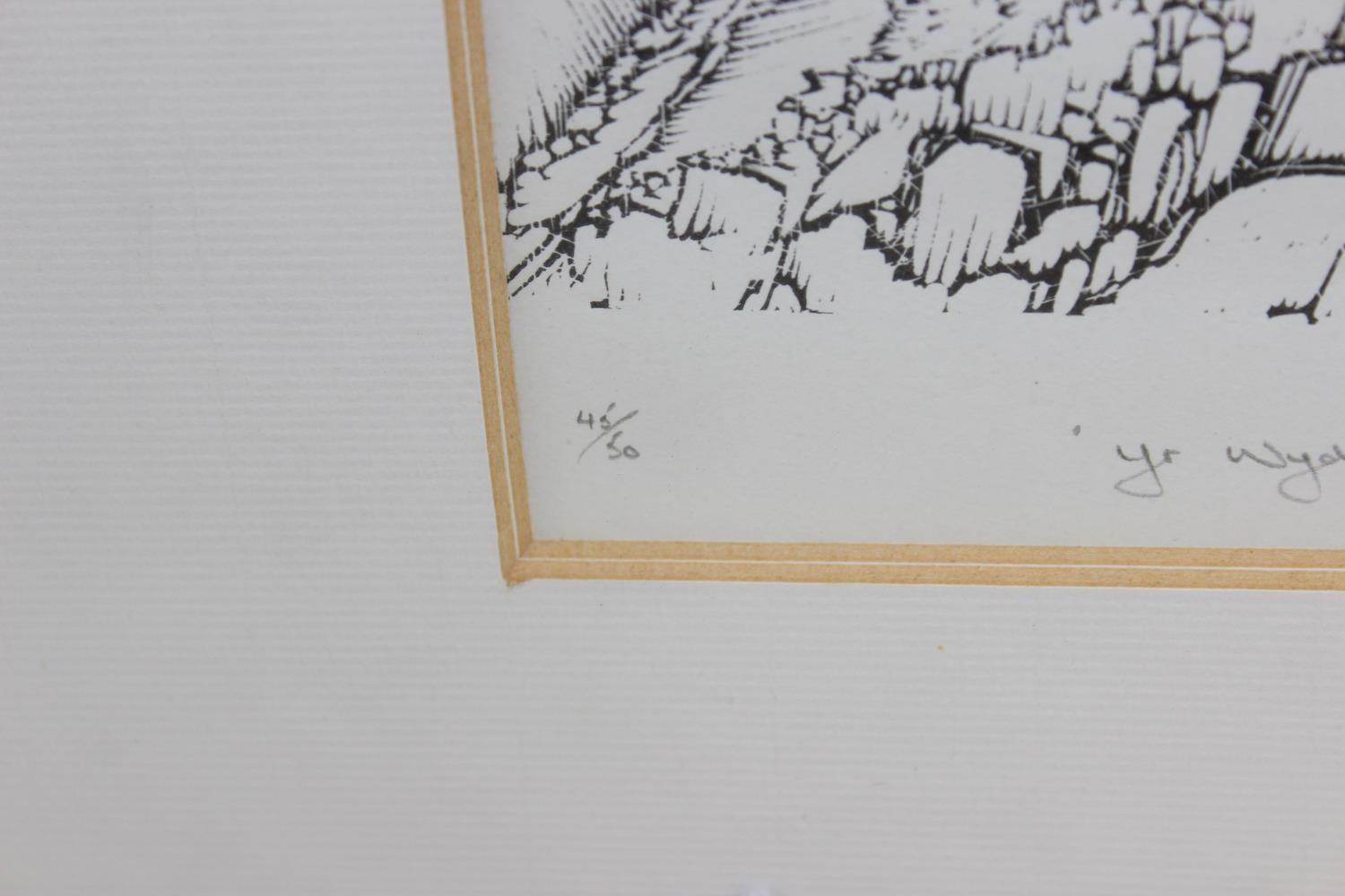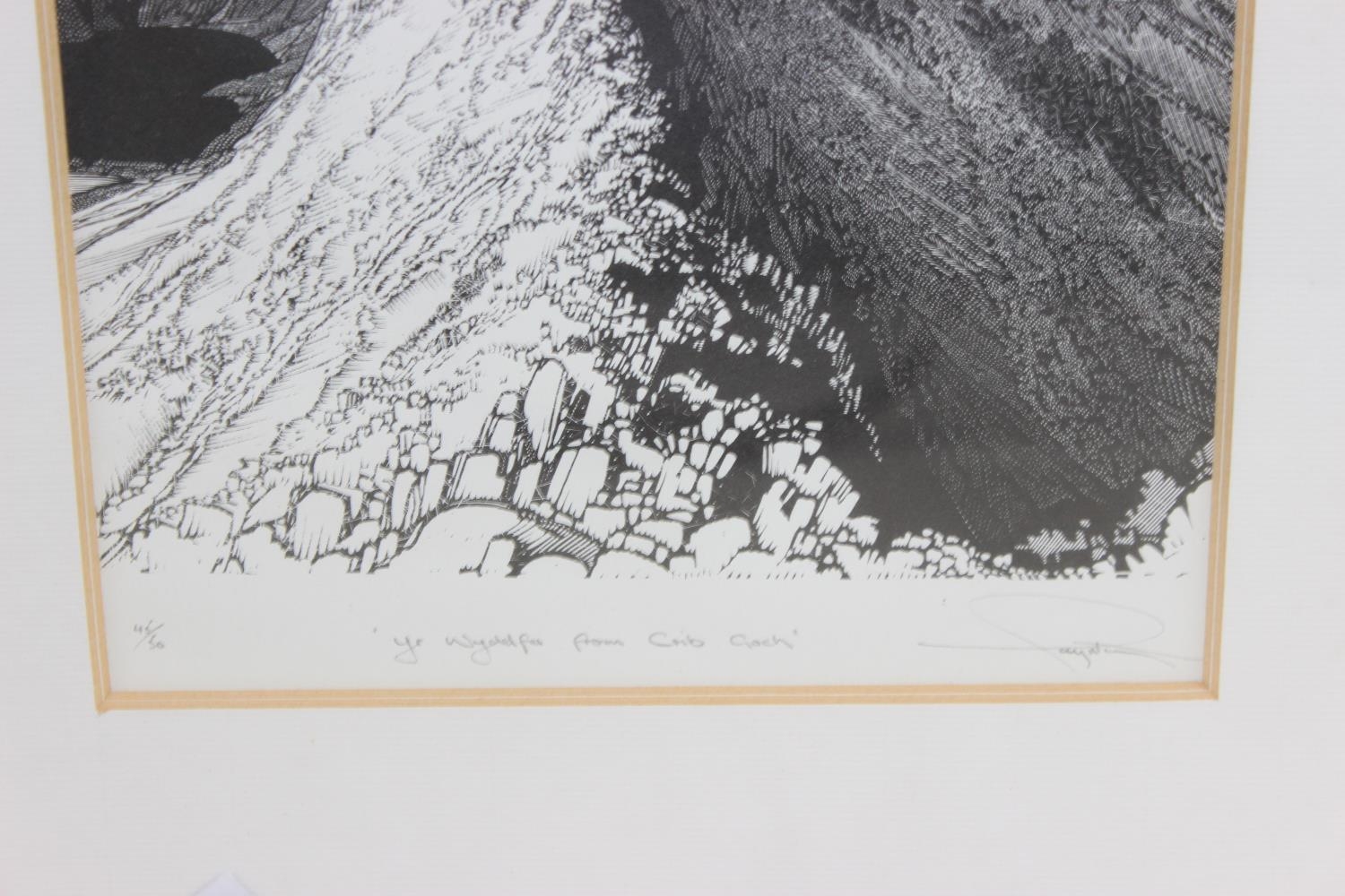 Limited edition engraving of Crib Goch, numbered 45/50 and indistinctly signed, Al Abbar Dubai gallery label to verso.
