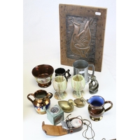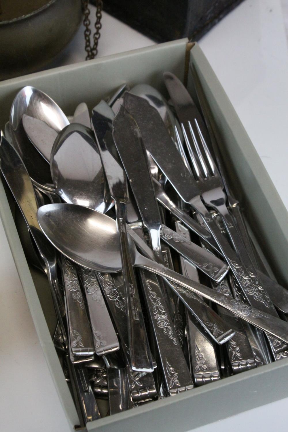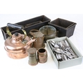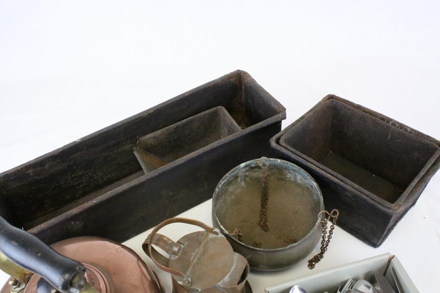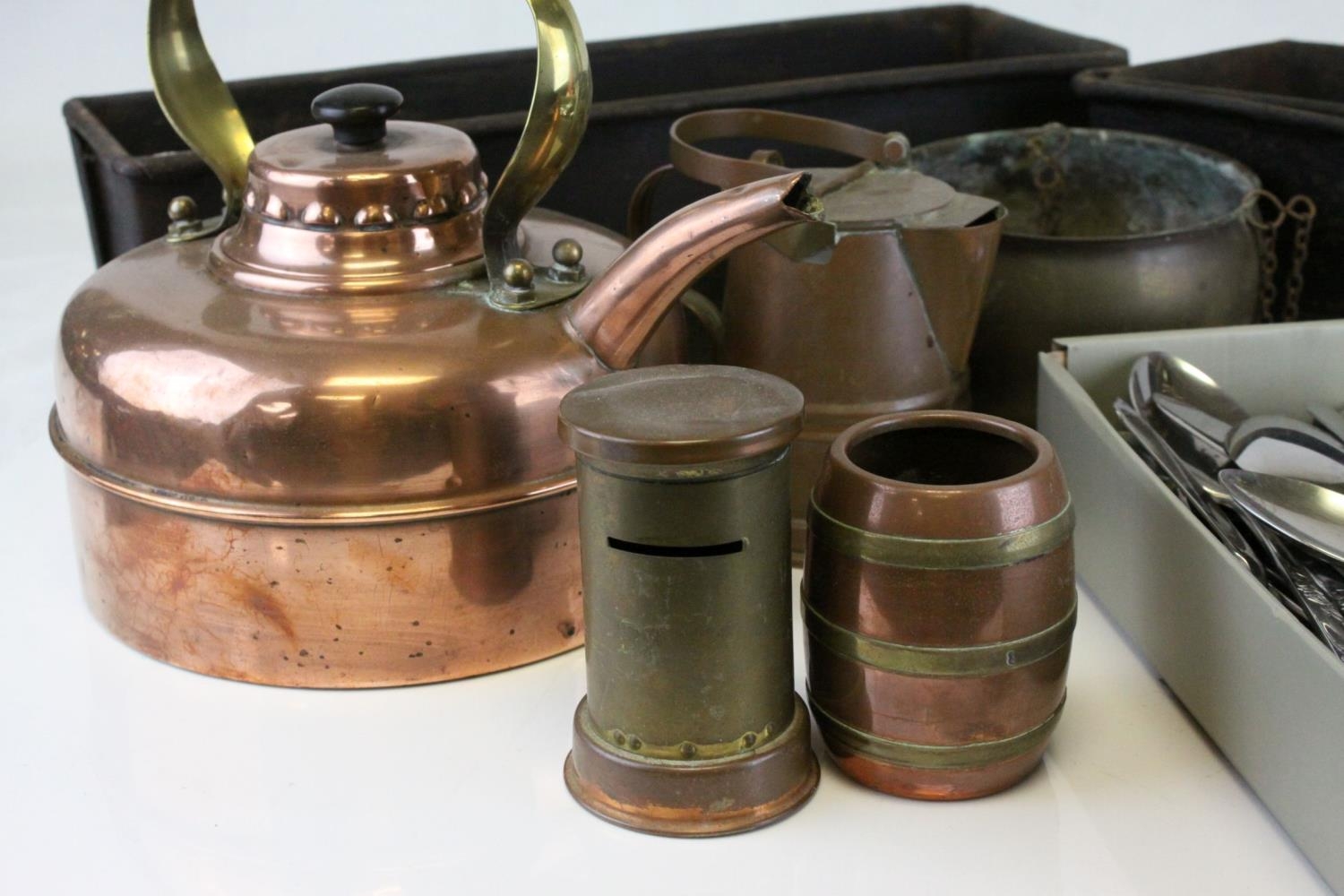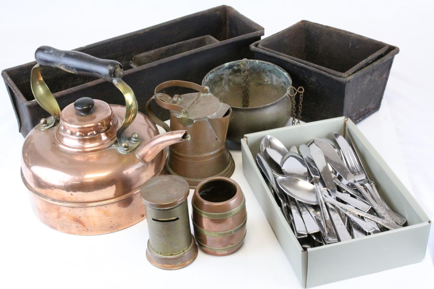 Copper Kettle, Copper & Brass Moneybox in the form of a Letterbox, Three Further items of Copper, Four Antique Bakery Baking Tins and a Quantity of Matching Cutlery