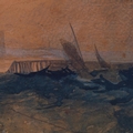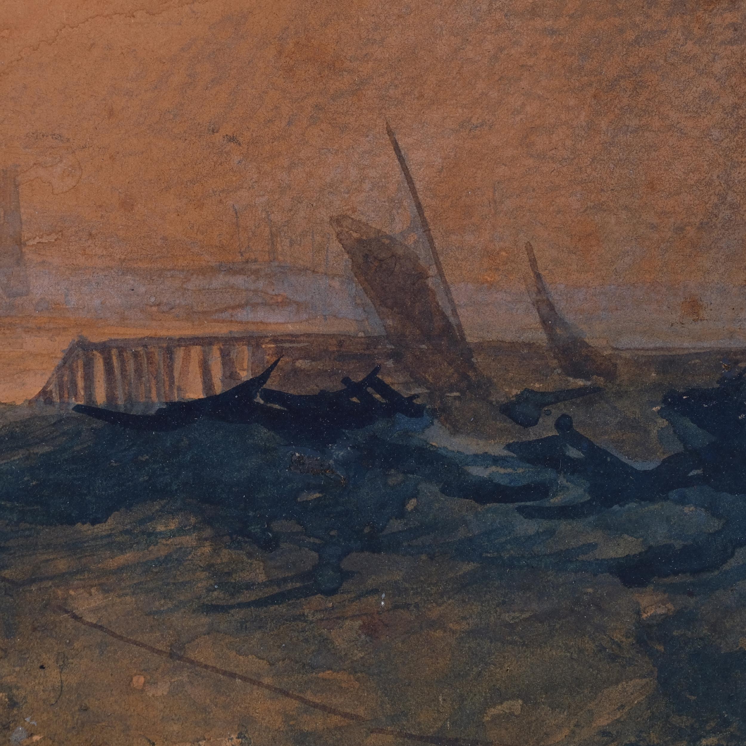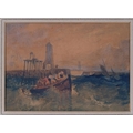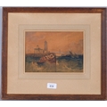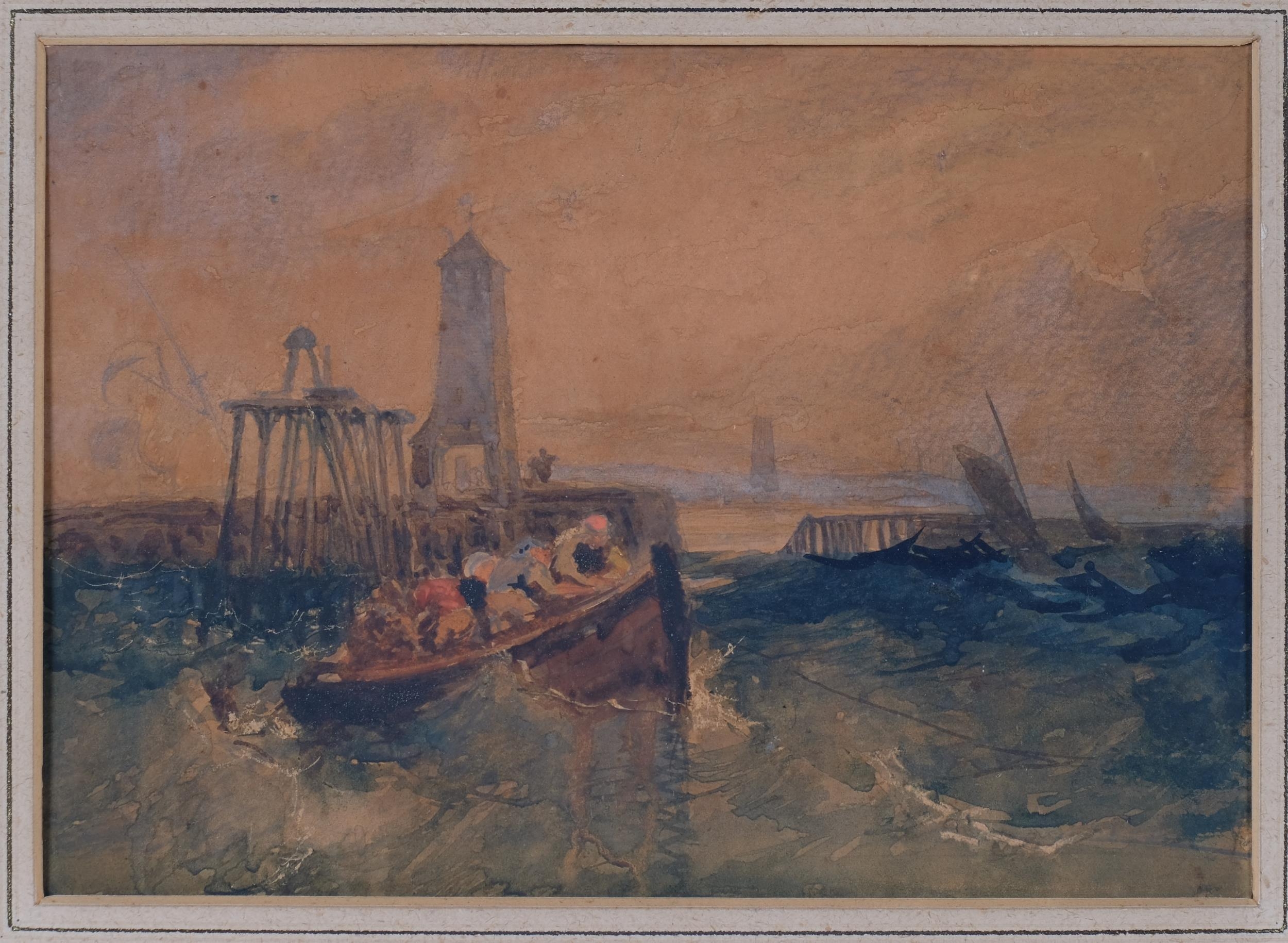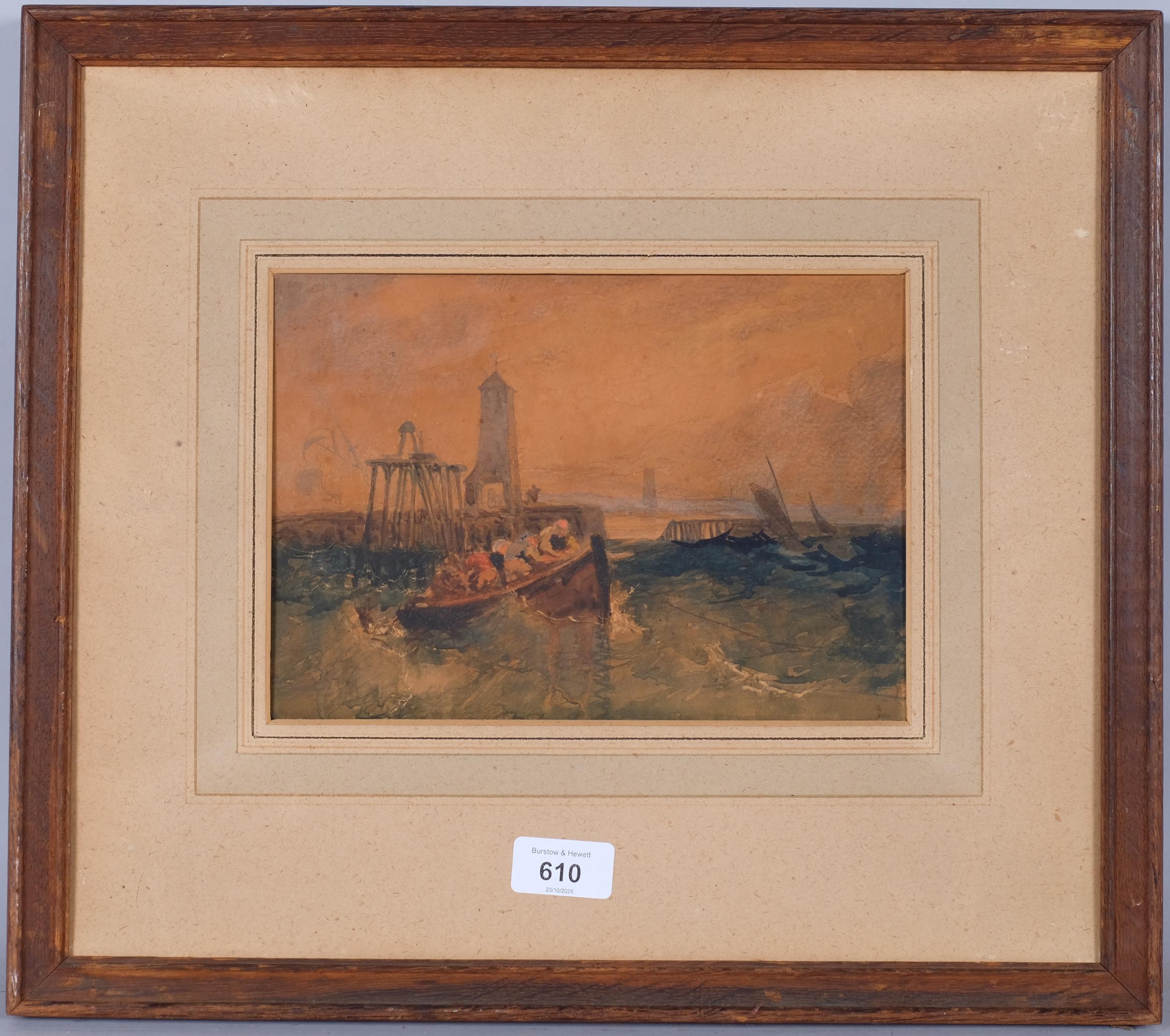 Boats near harbour, 19th century watercolour, unsigned, 17cm x 24cm, framed