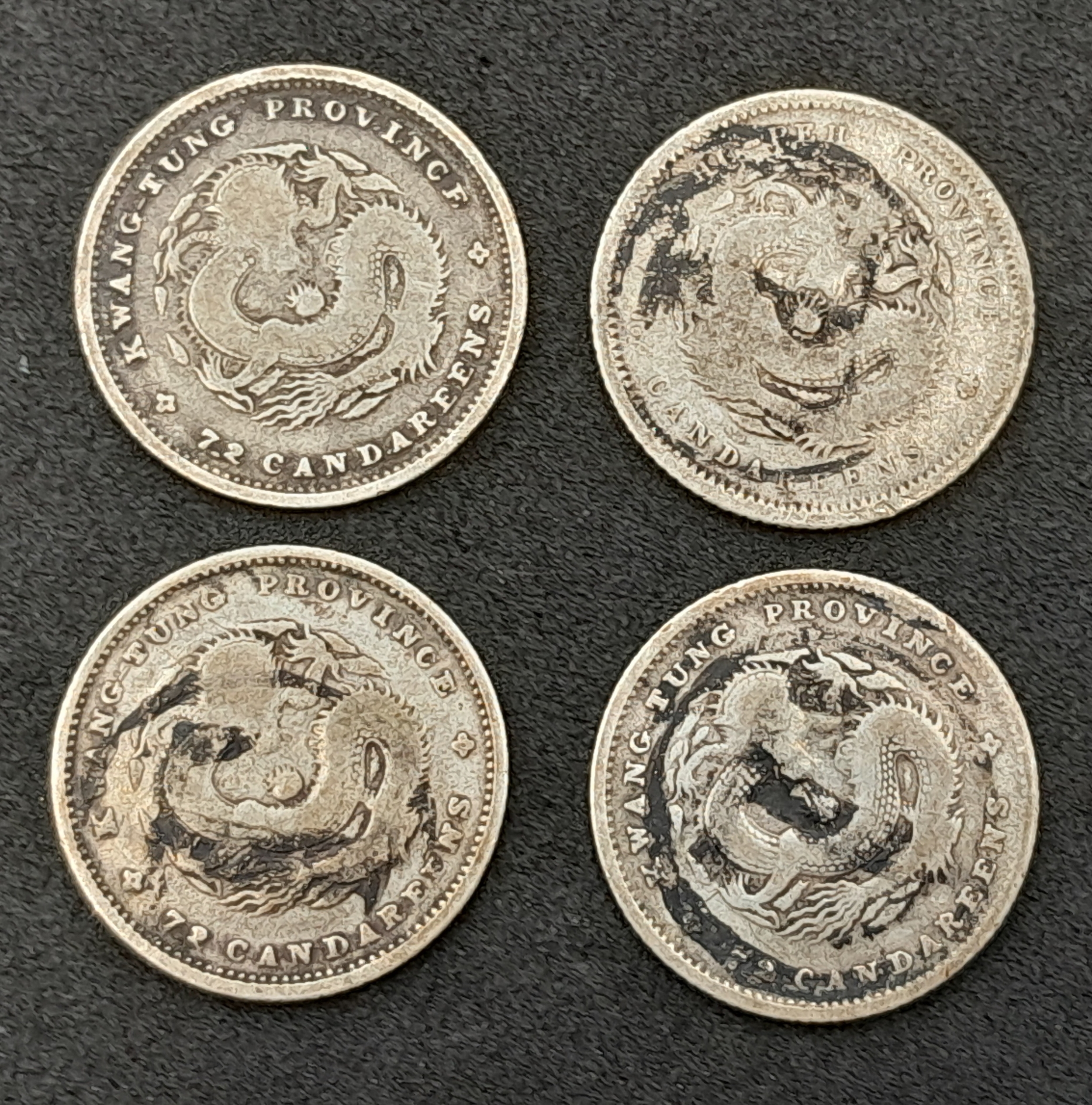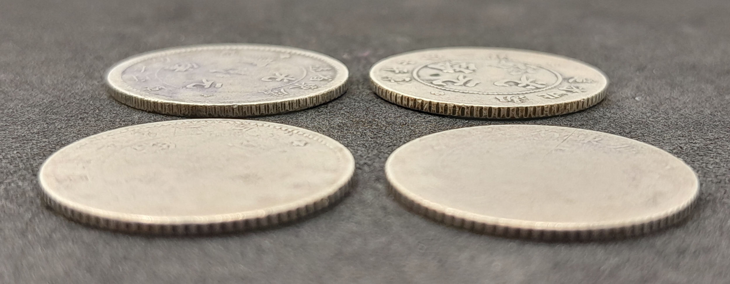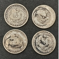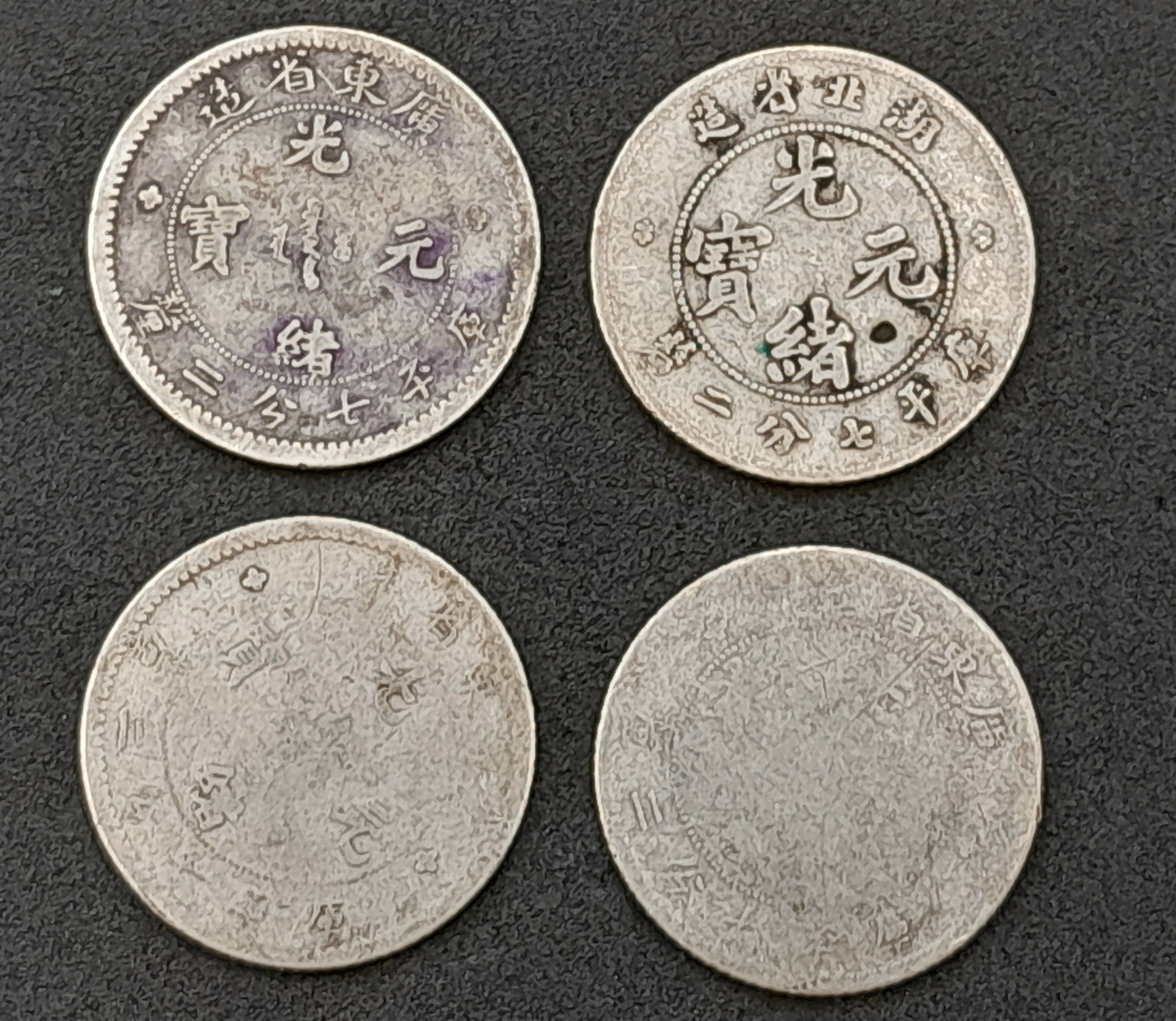 A Parcel of Four Antique Chinese Silver Coins Comprising 1) Three 1890 Dated China Empire 7.2 Candareens and 2) One 1894 China Empire 7.2 Candareens.