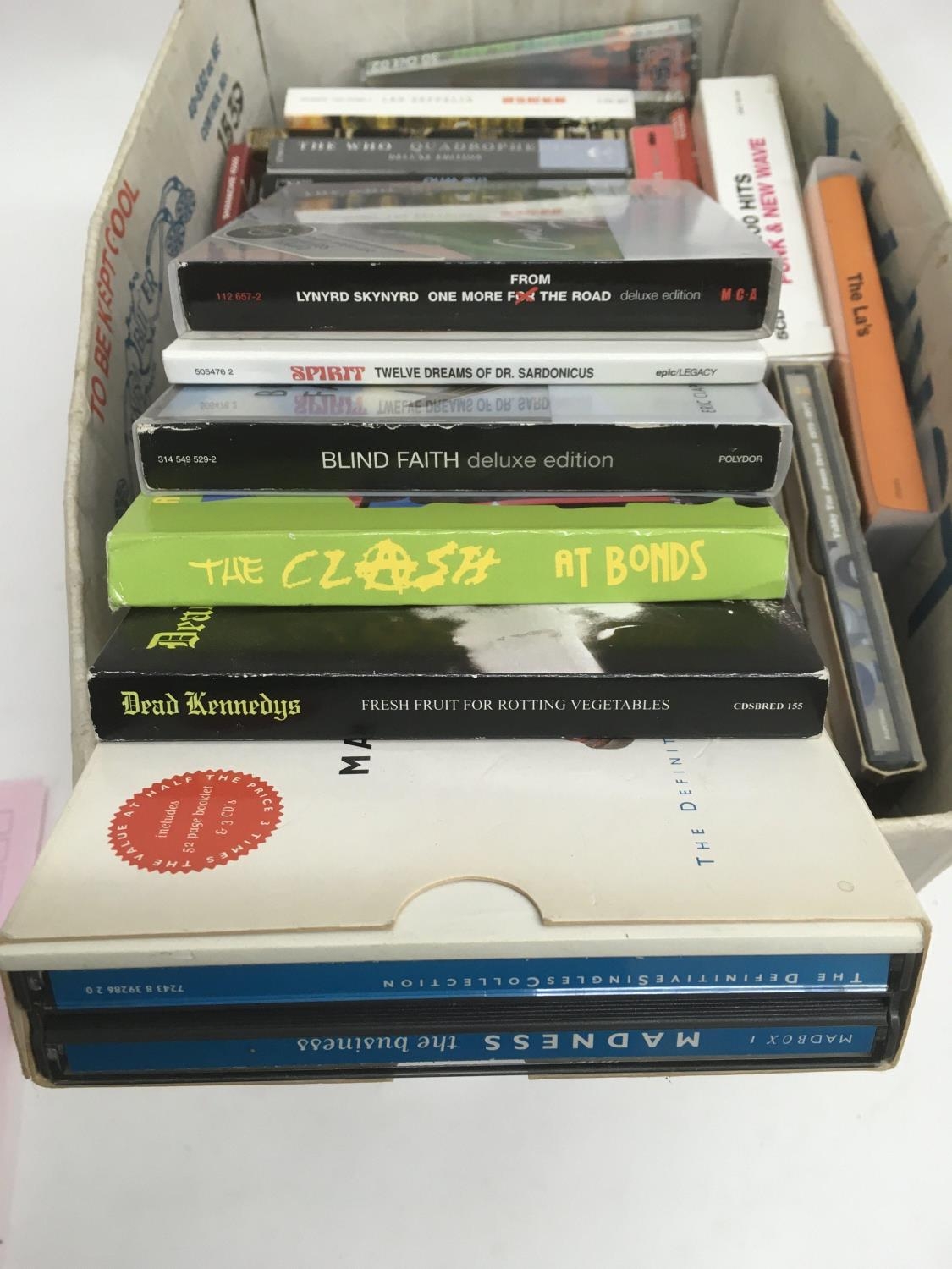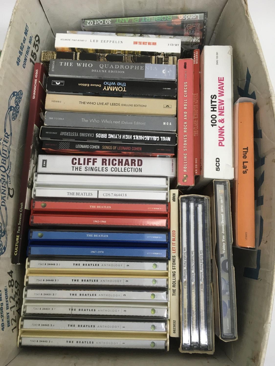 A collection of CD box sets by various artists including The Beatles, The Who, Noel Gallagher, Dead Kennedys and others.