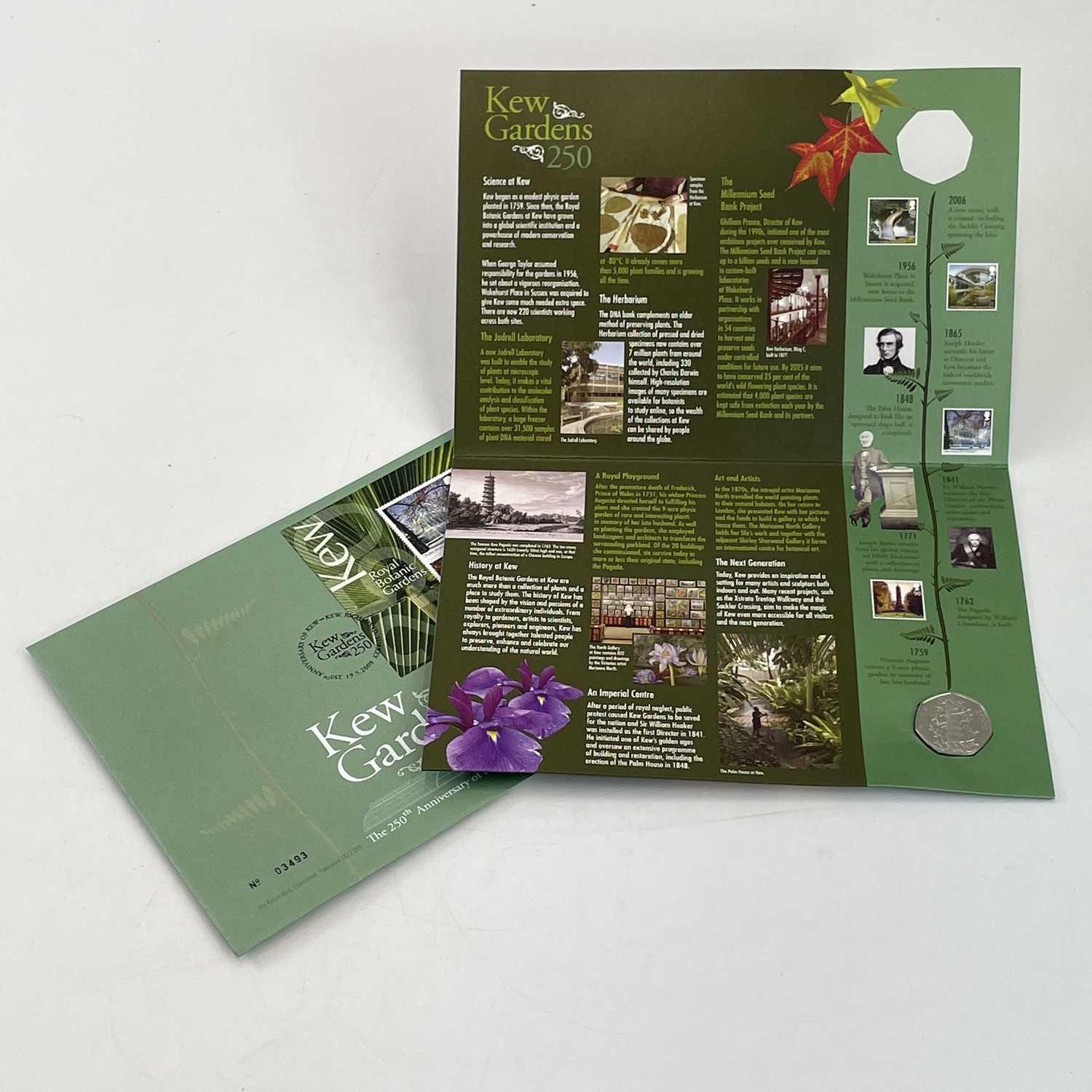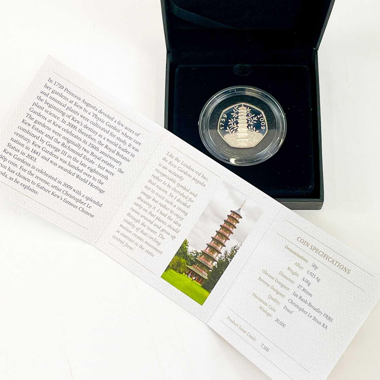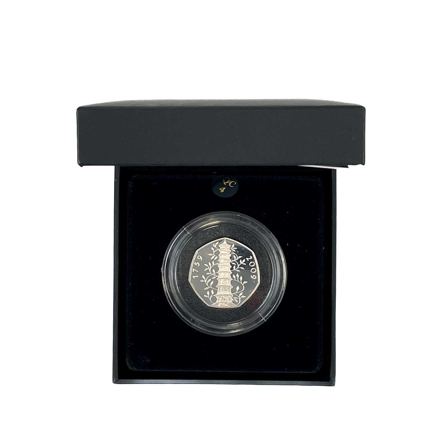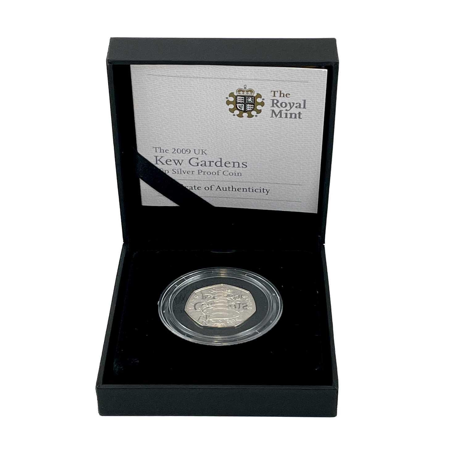 Great Britain 50 pence Kew Gardens 2009 cased silver proof coin. A cased 250th anniversary of Kew Gardens silver proof 50 pence with certificate of authenticity.