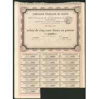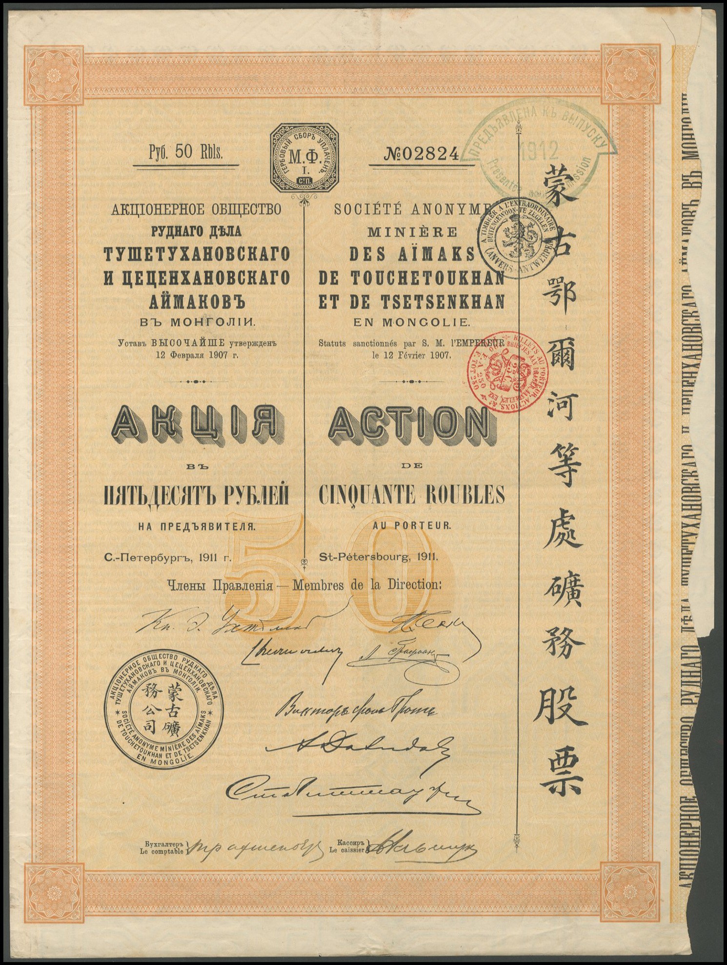 China: Société Anonyme Minière des Aïmaks de Touchetoukhan et de Tsetsekhan en Mongolie, 50 rouble share, 1911, #02824, ornate border, orange and black, text in Russian, French and some Chinese, with coupons. GVF.