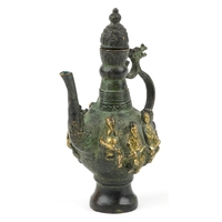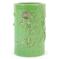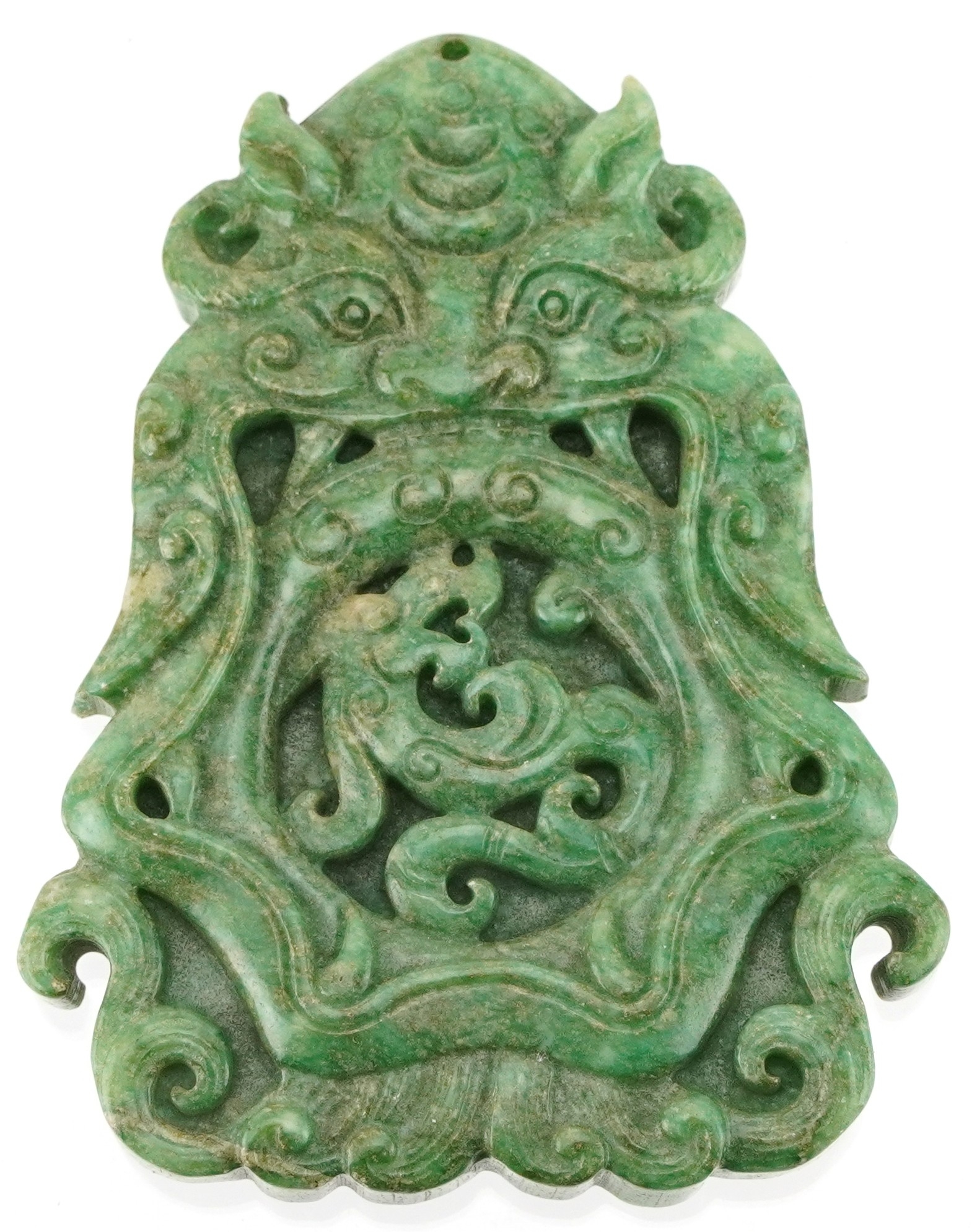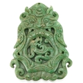 A Chinese green stone pendant carved with dragons, 8cm high, 78.6g.
