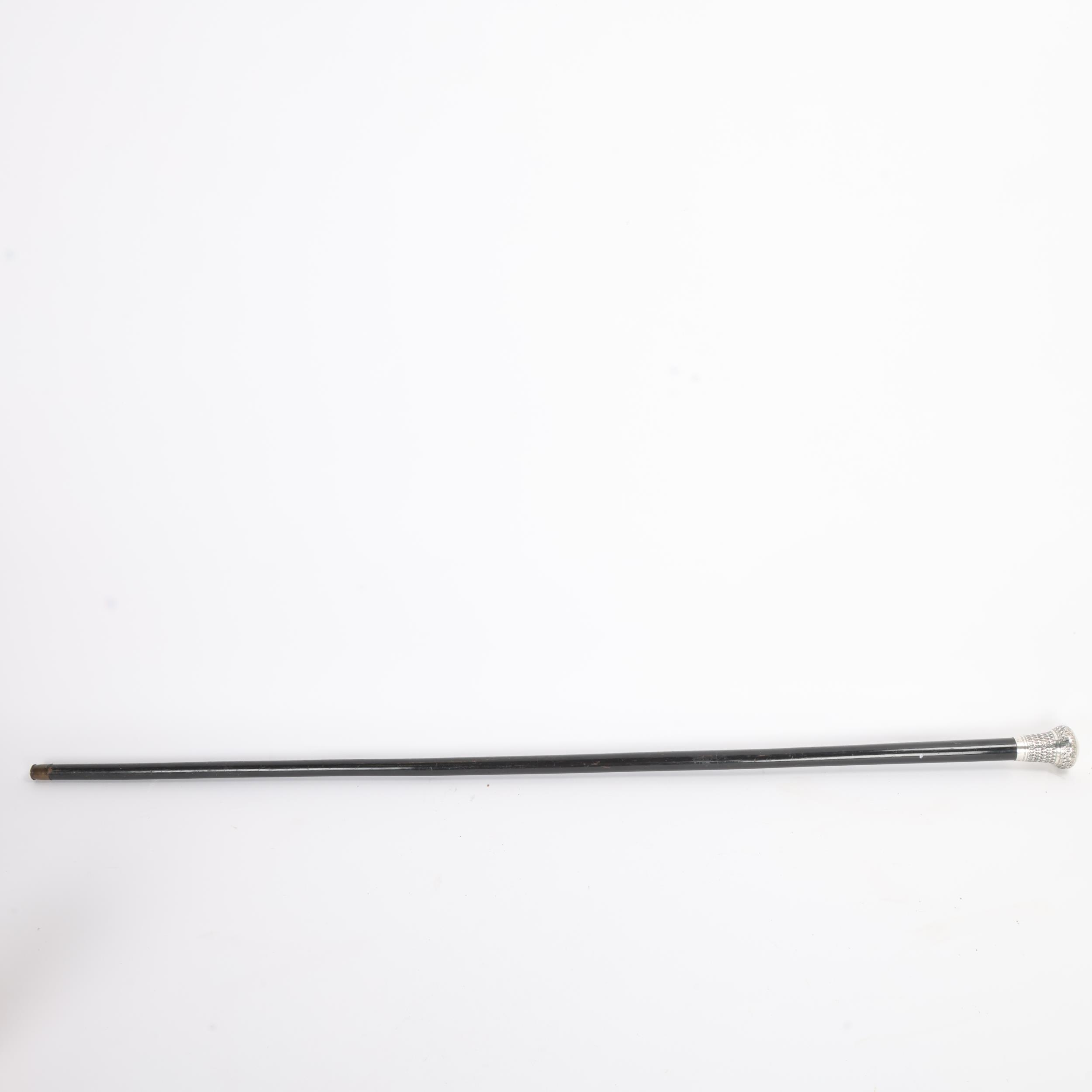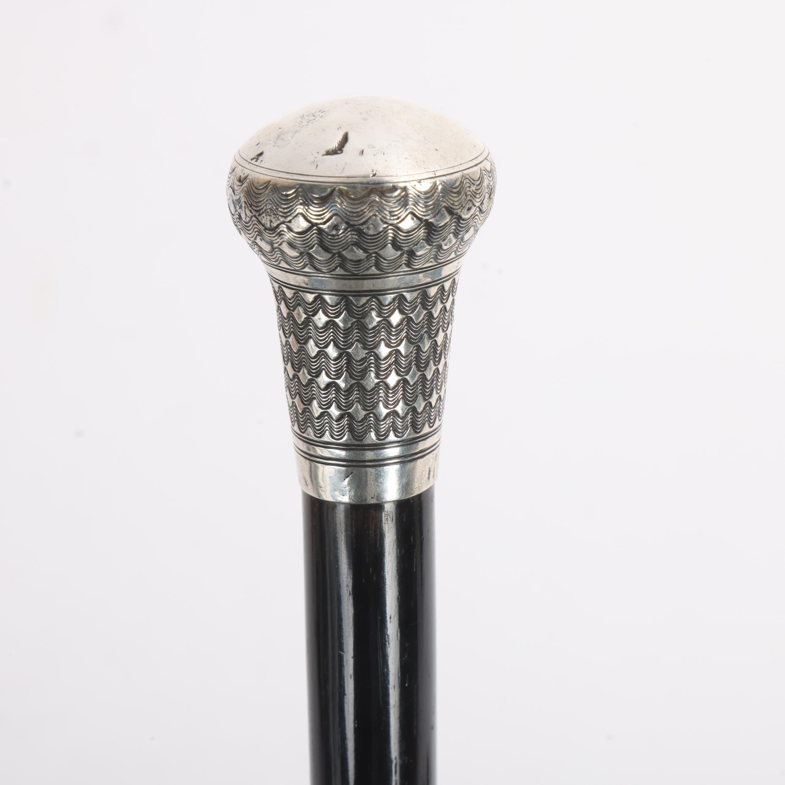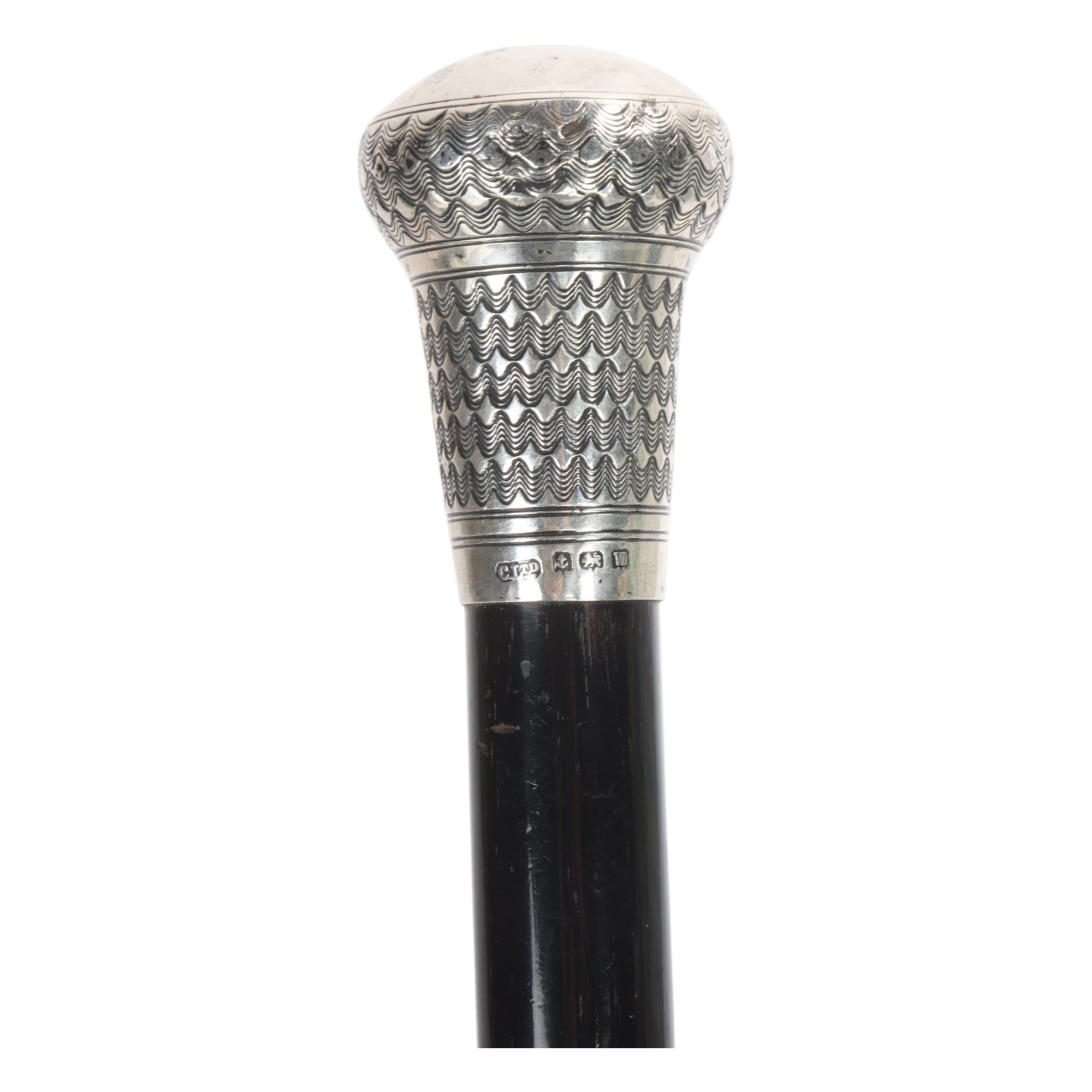 An Antique silver ebonised walking cane, the silver conical handle with engine-turned weaved engraving, the top left blank for the owner's monogram, the base stamped with retailer's mark C Ltd, Birmingham 1921, ebonised hardwood shaft, brass ferrule, length 91cm