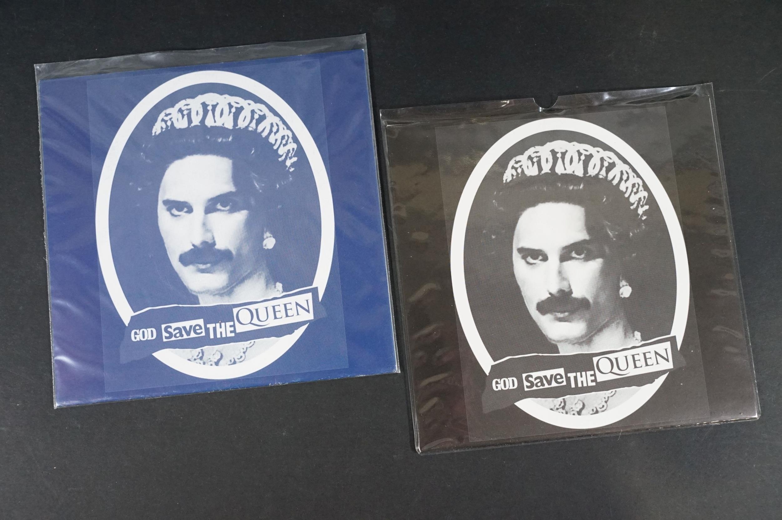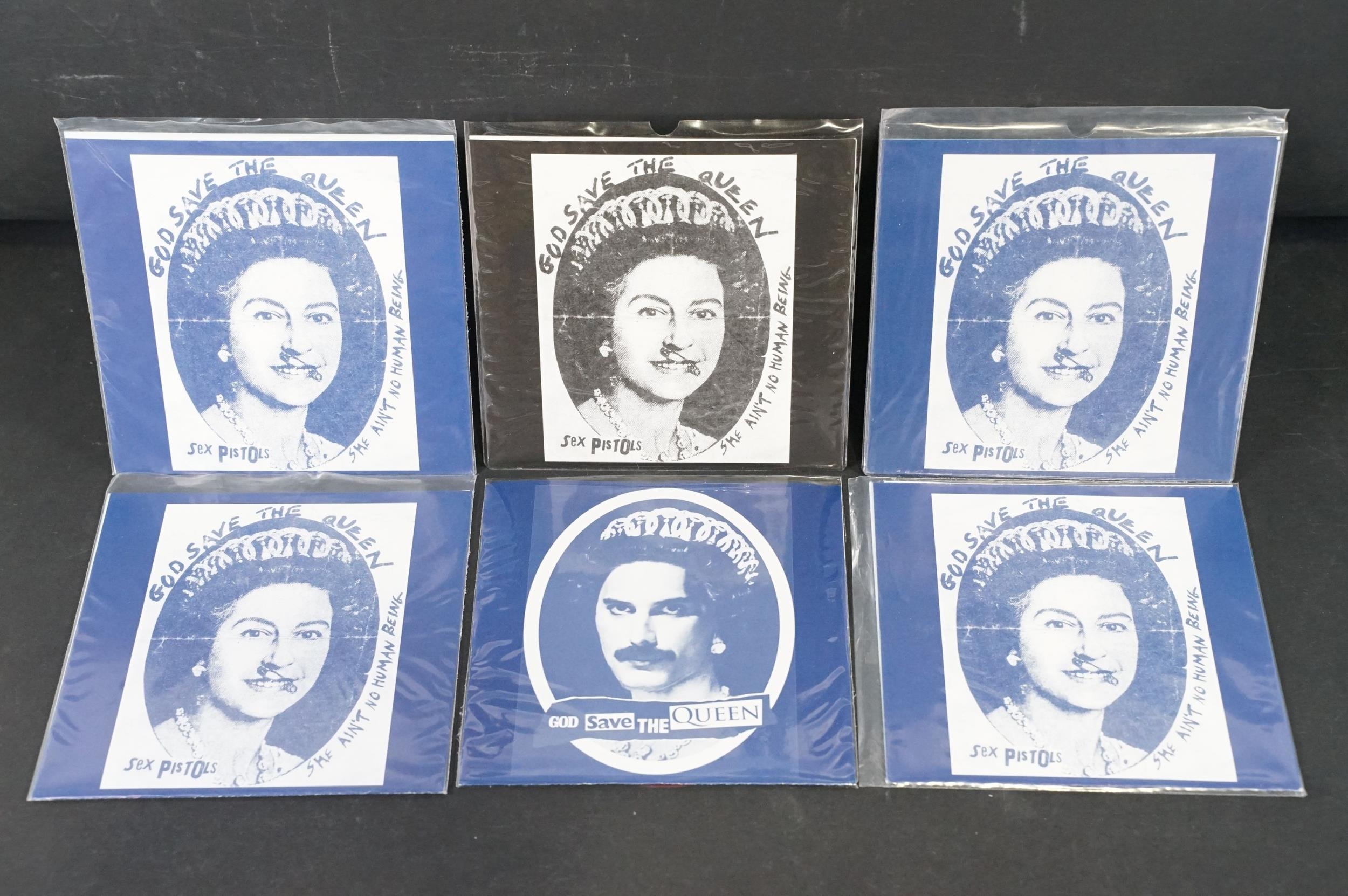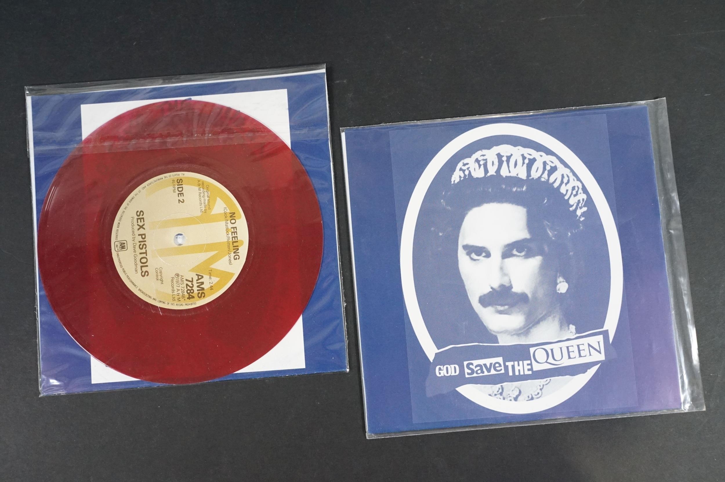 Vinyl - Punk - Sex Pistols, 6 different coloured vinyl UK 2013 re-pressing 7” singles of “God Save The Queen”, yellow, pink, red, purple, blue and clear marbled vinyl. All come with Freddie Mercury / Queen picture sleeves. EX+