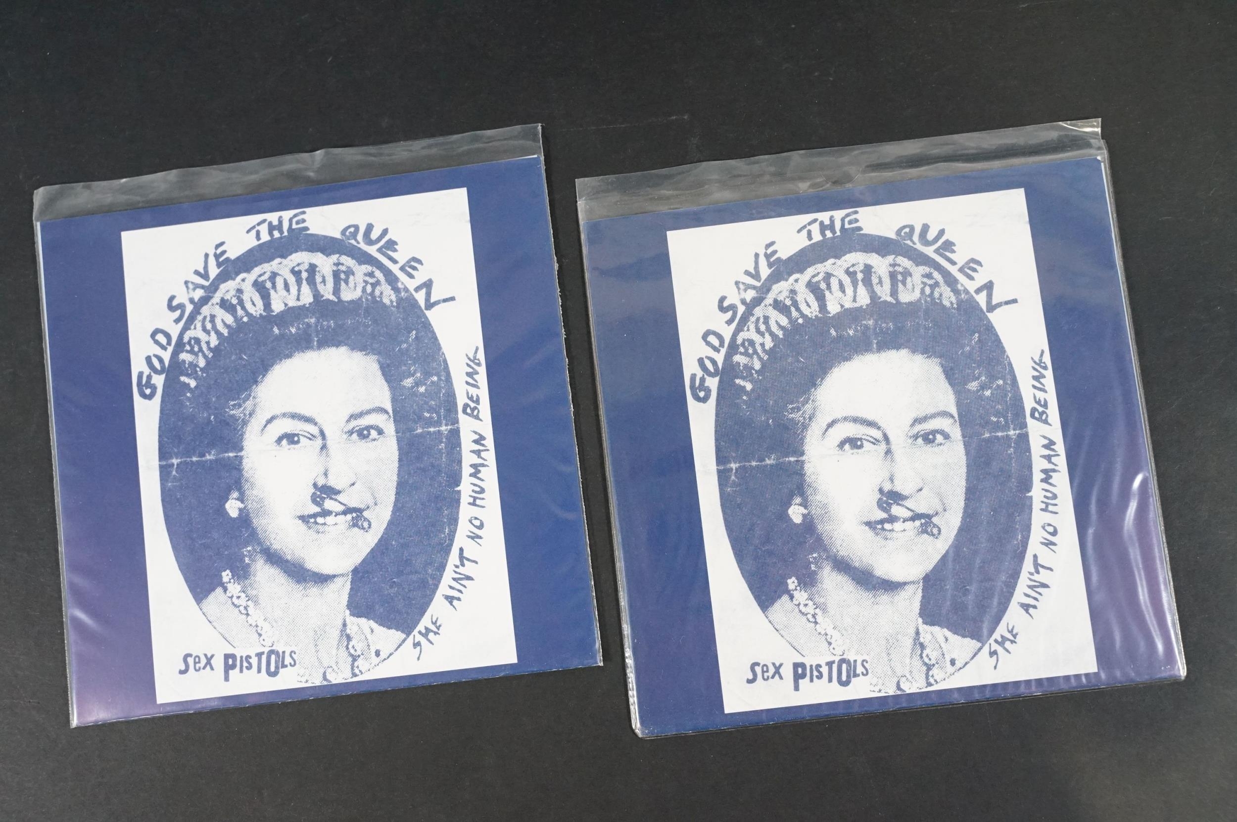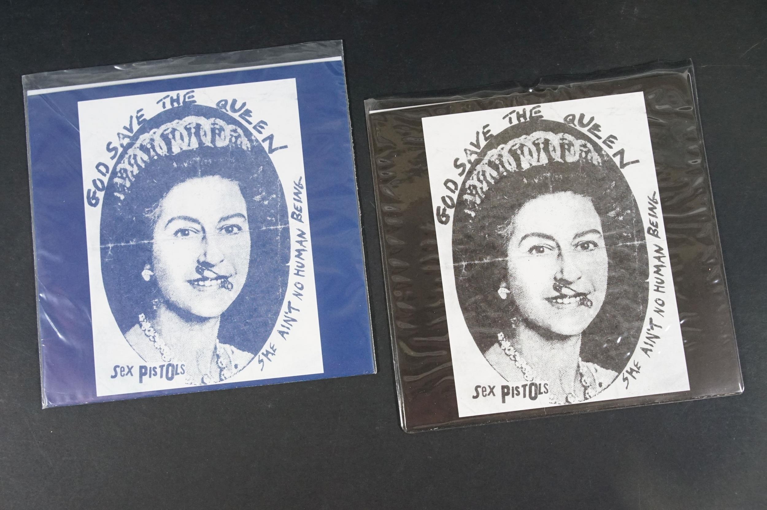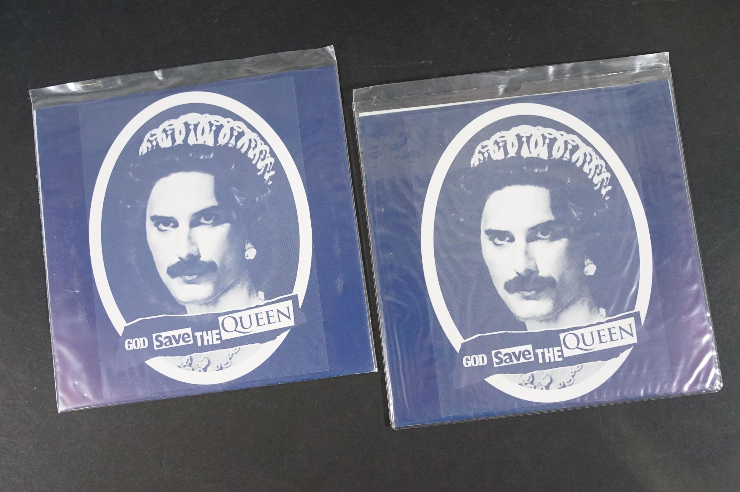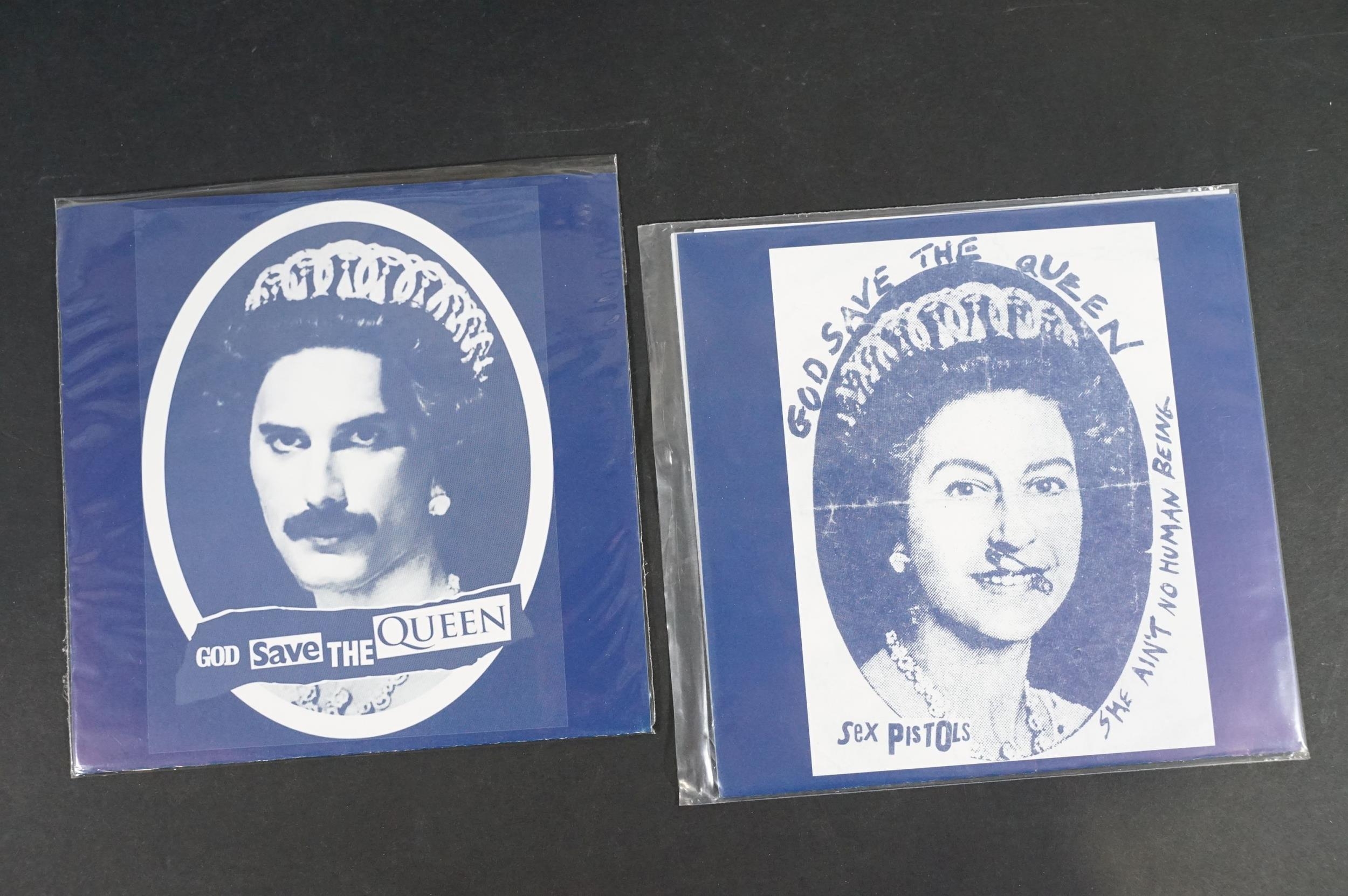 Vinyl - Punk - Sex Pistols, 6 different coloured vinyl UK 2013 re-pressing 7” singles of “God Save The Queen”, yellow, pink, red, purple, blue and clear marbled vinyl. All come with Freddie Mercury / Queen picture sleeves. EX+