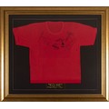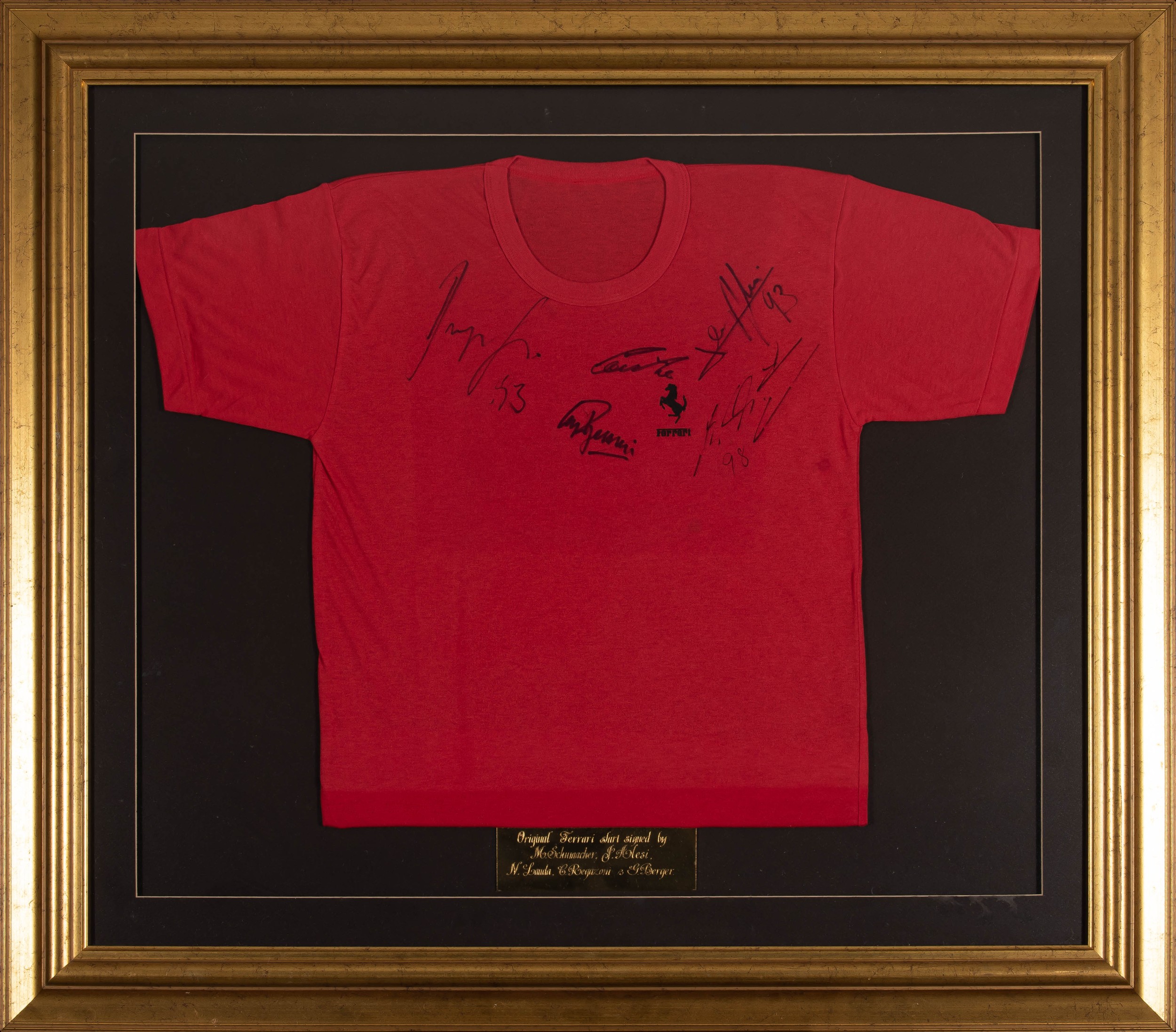 A FERRARI TEAM PRACTICE SHIRT, SIGNED BY MICHAEL SCHUMACHER, GERHARD BERGER, CLAY REGAZZONI, JEAN ALESI AND NIKI LAUDA