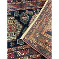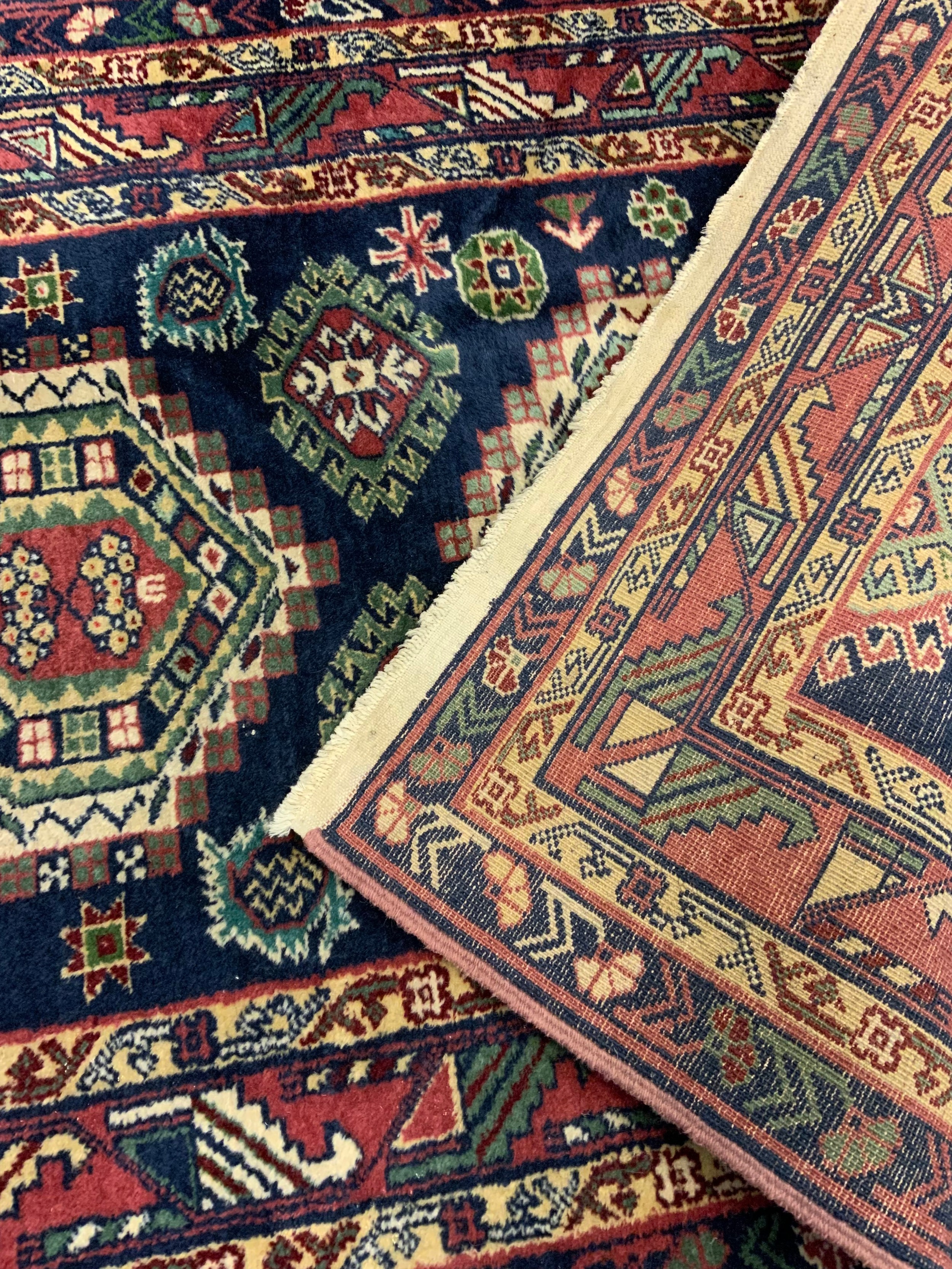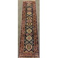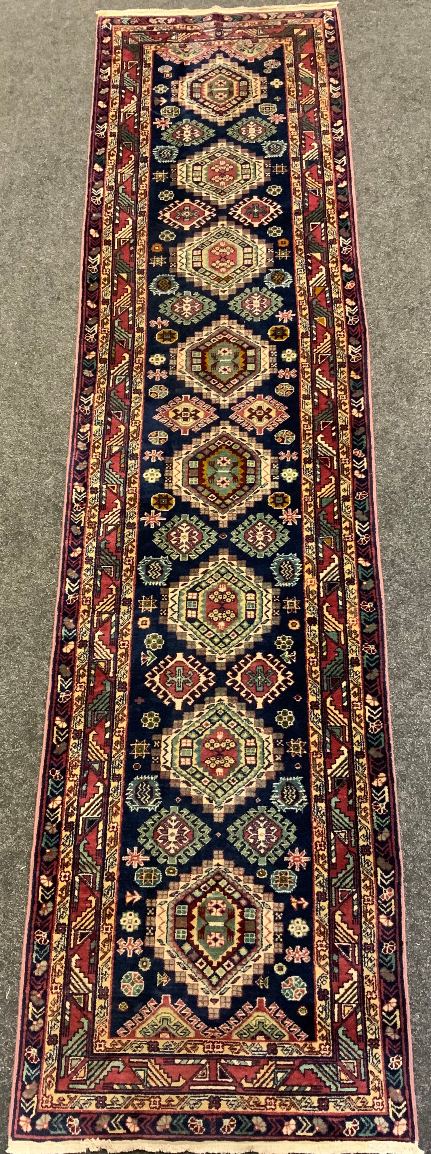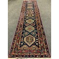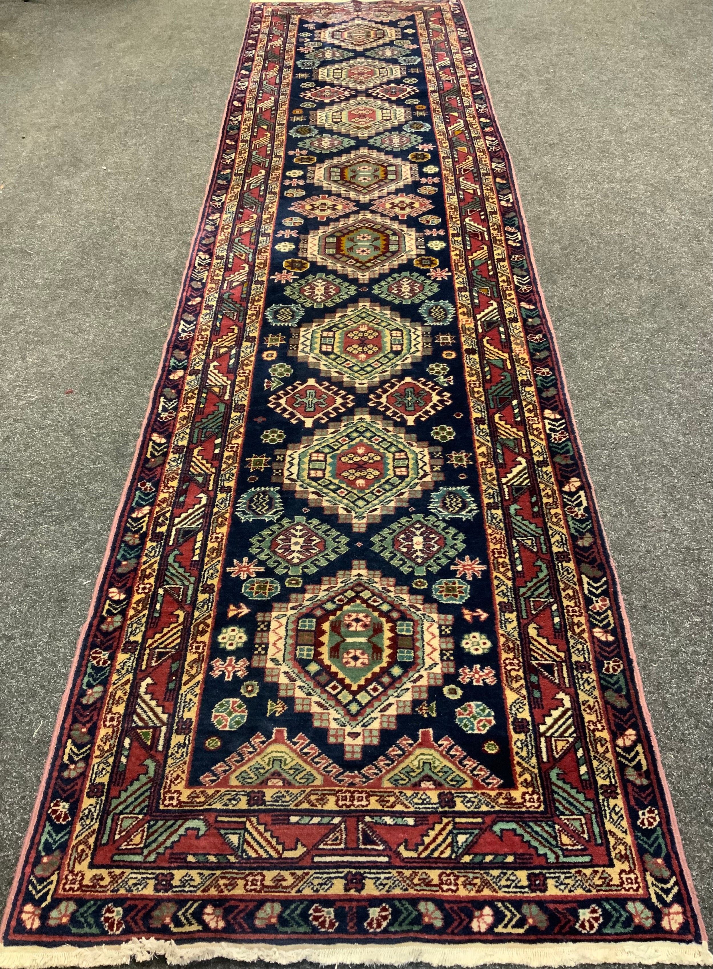 A hand-made Heriz runner carpet, woven with stylised geometric motifs in shades of red, pale green, and deep blue, 345cm x 85cm.