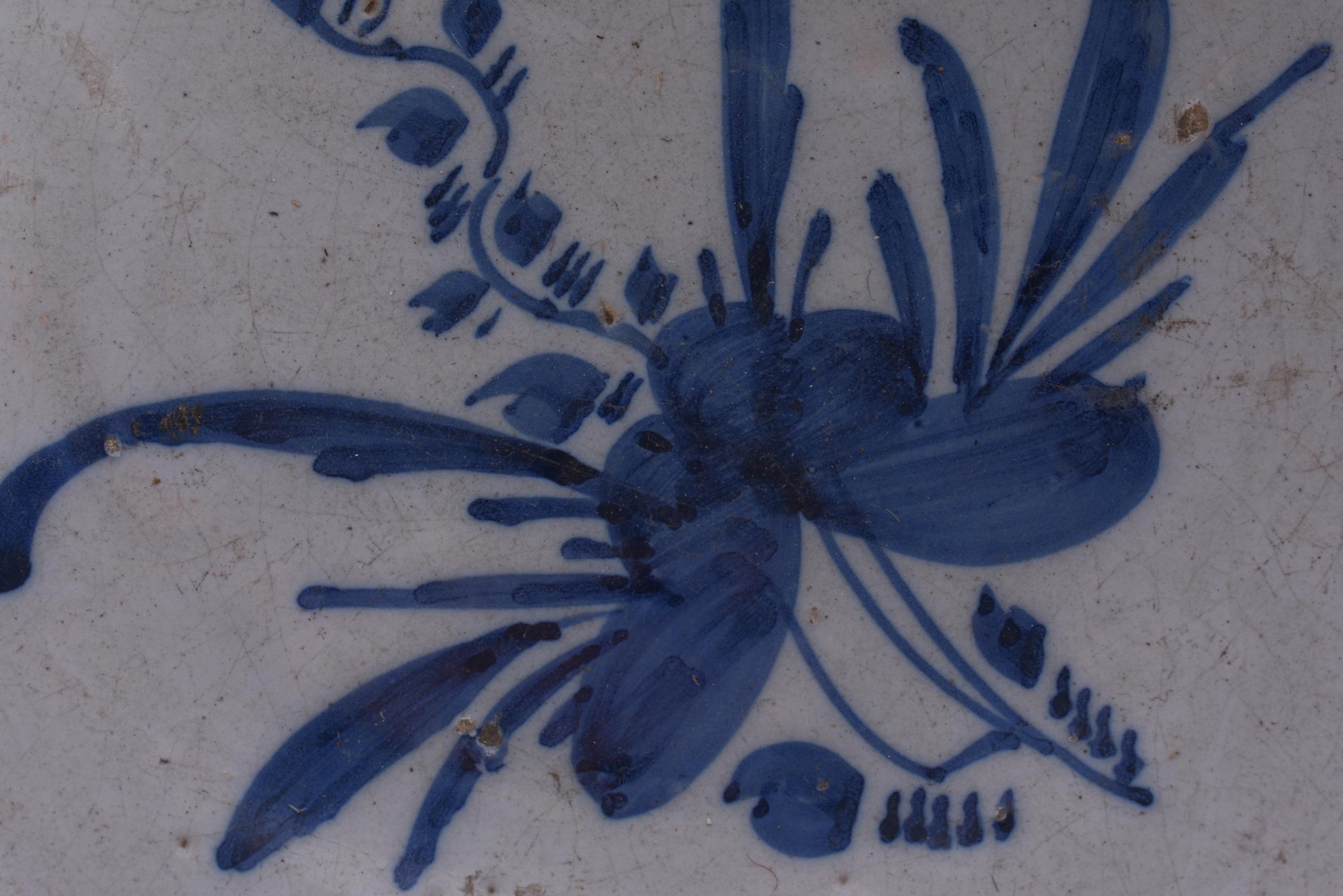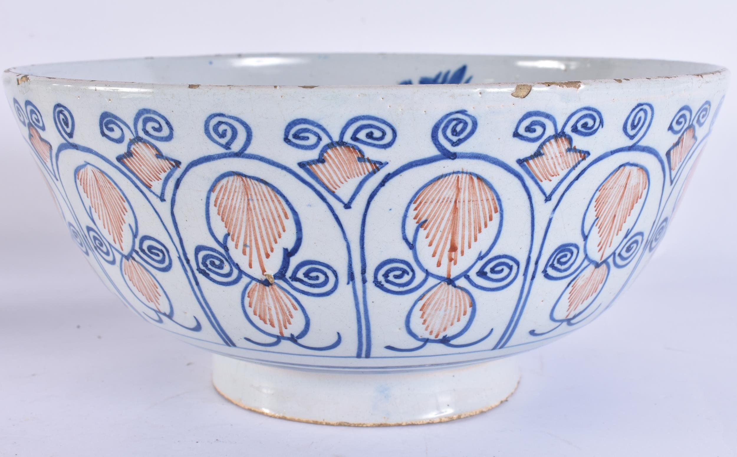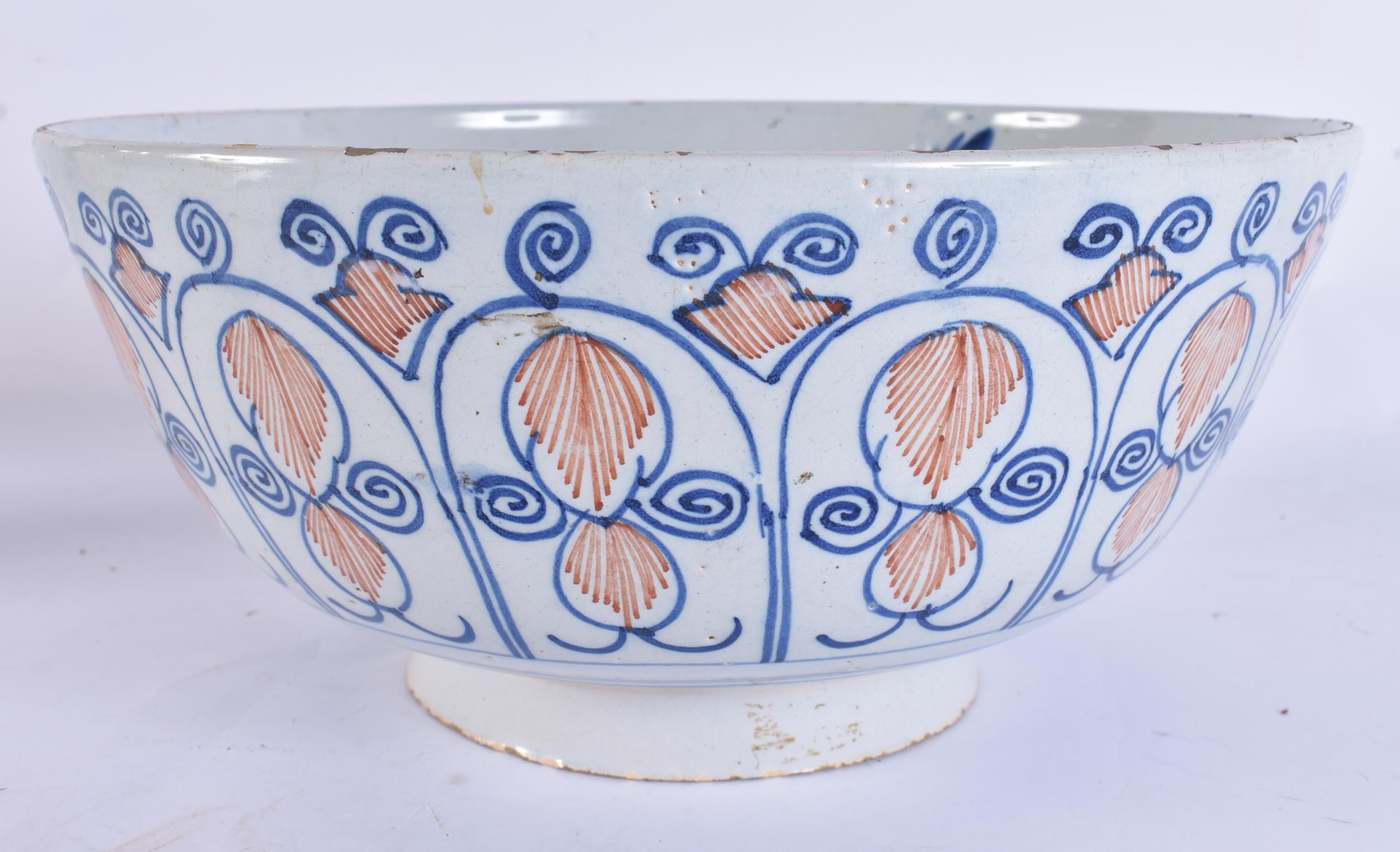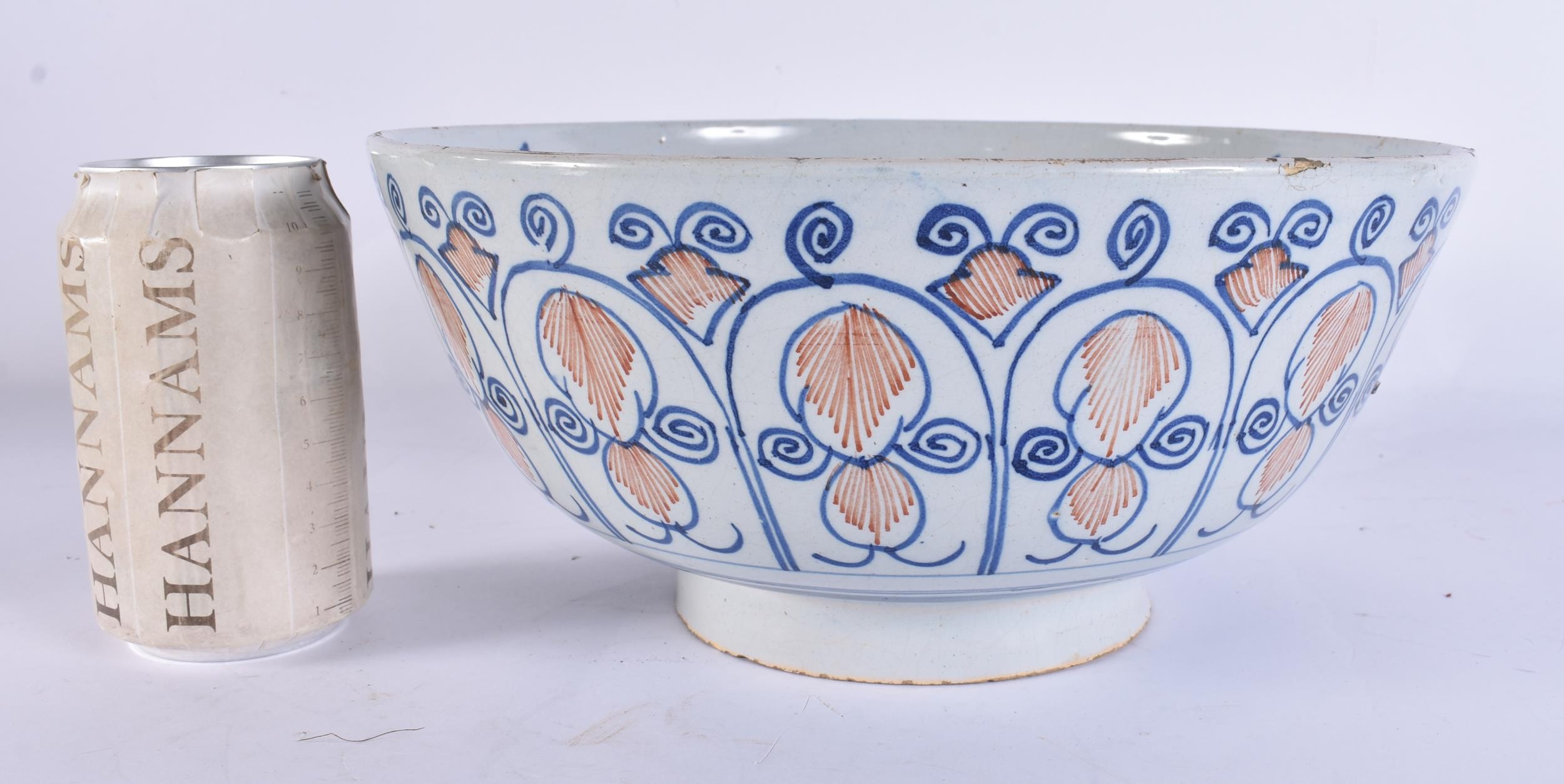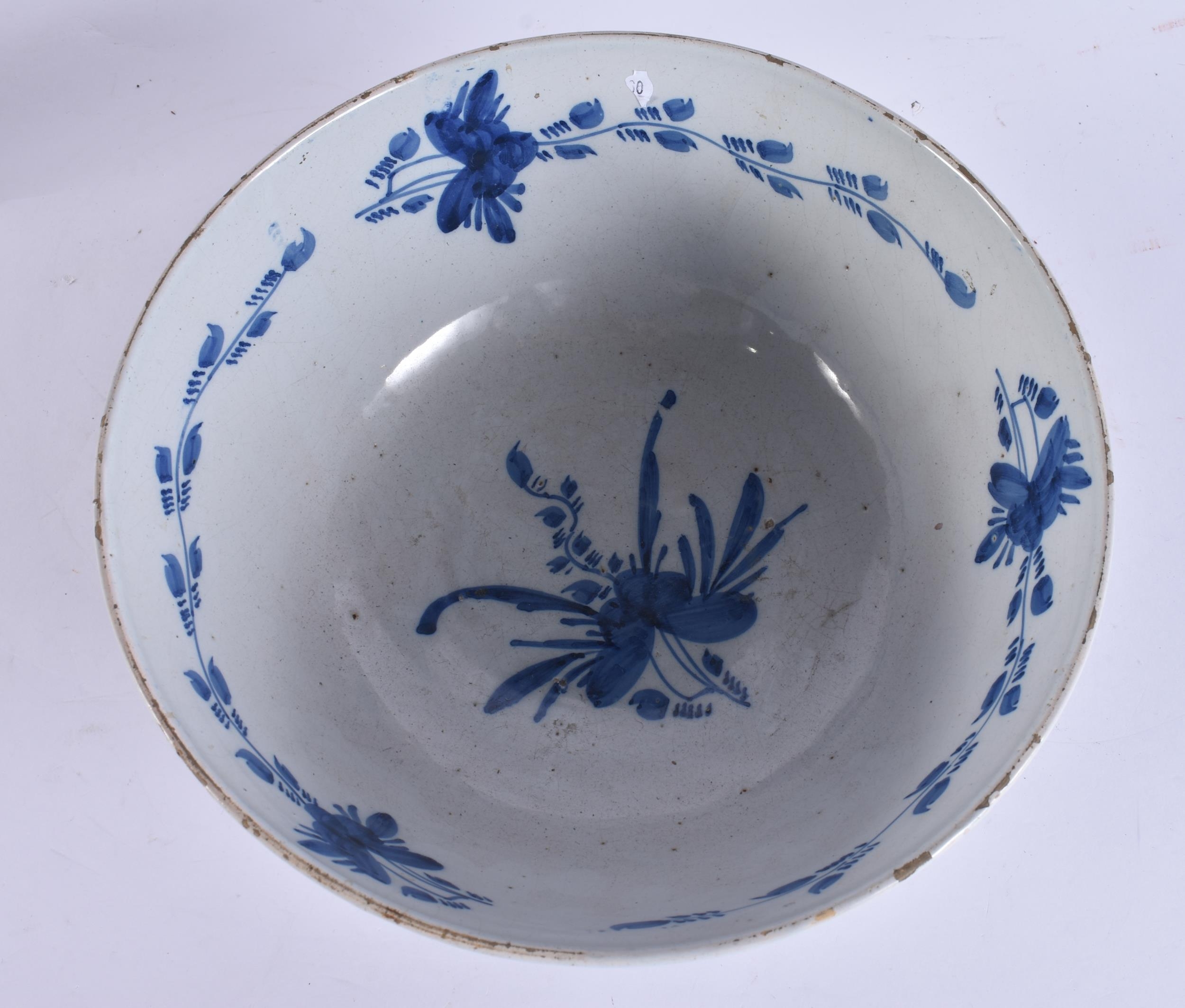 A LARGE 18TH CENTURY DELFT BLUE AND WHITE LIGHT MANGANESE POTTERY BOWL painted with motifs. 25.5 cm x 12 cm.