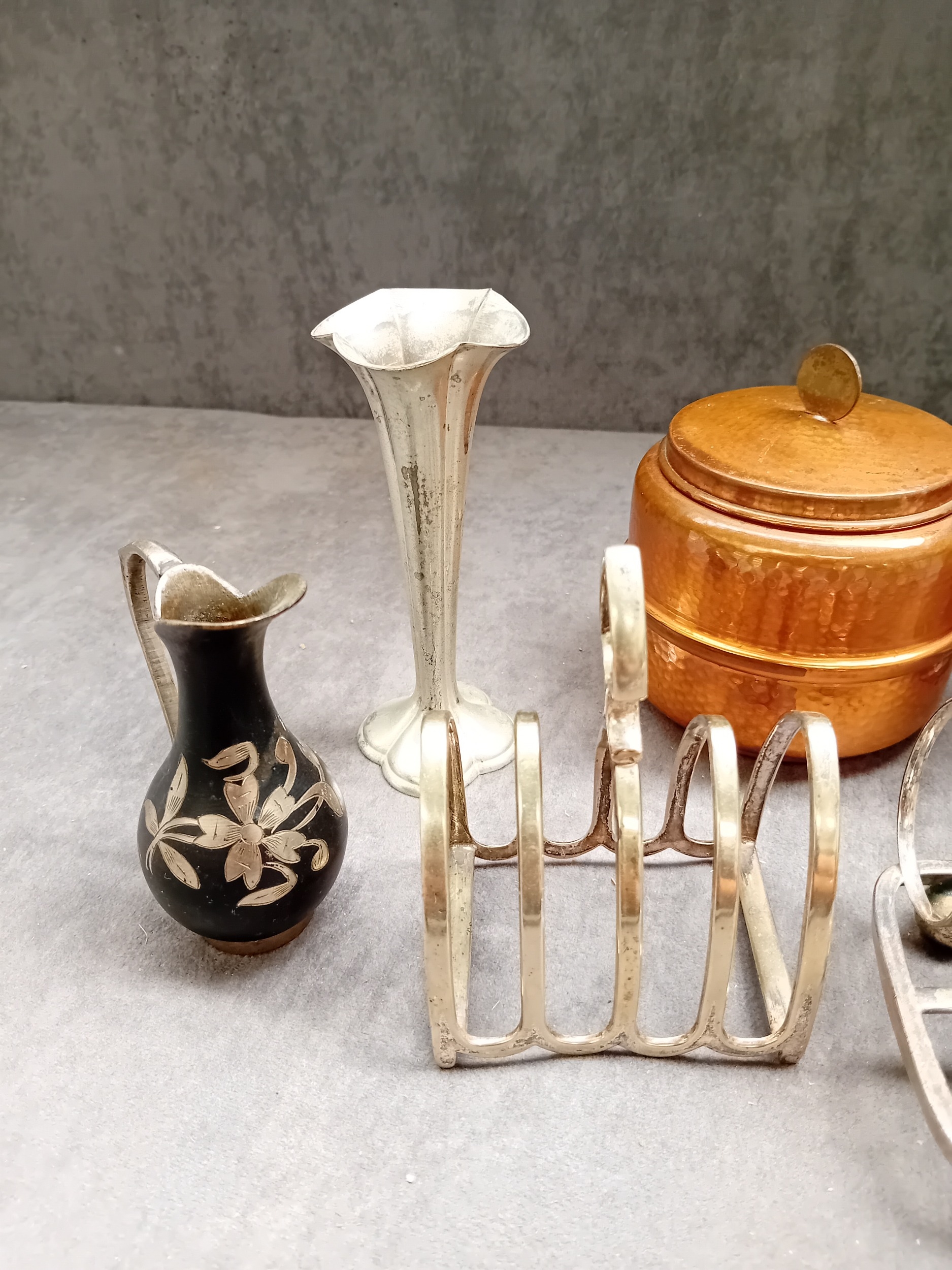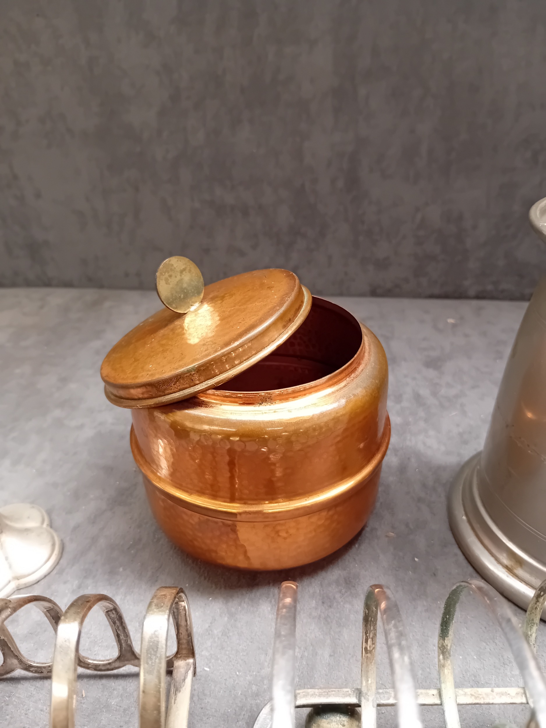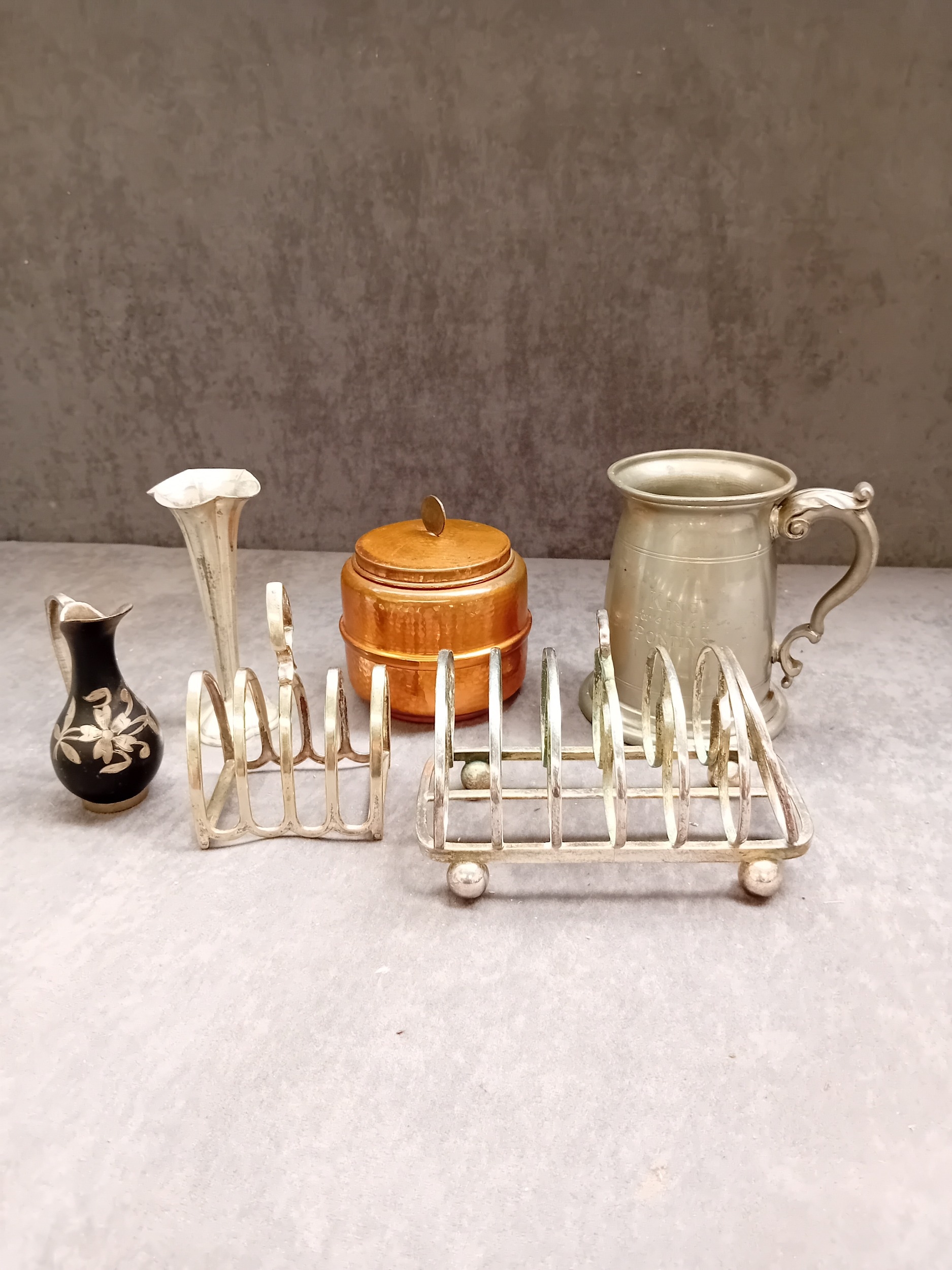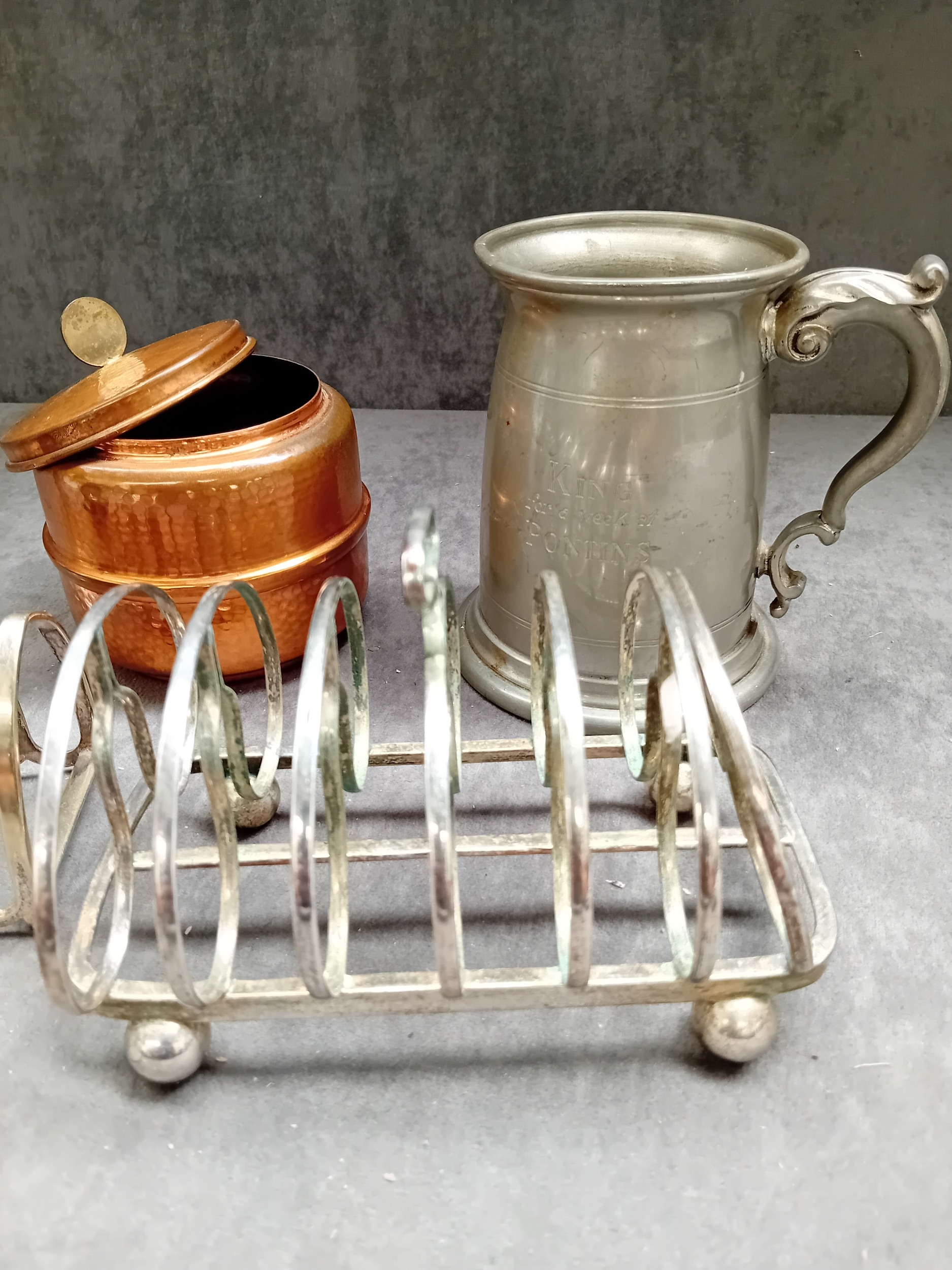 Mixed Lot of metalware, includes silver Plated toast rack, pewter stein copper pot and other items as pictured.