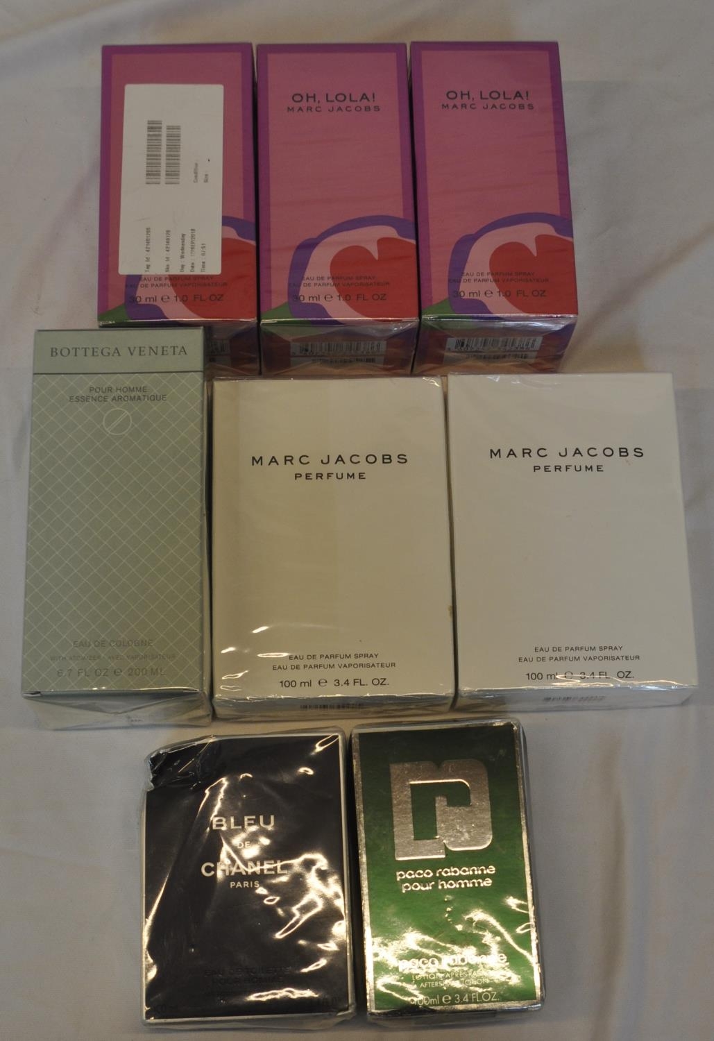 5 PERFUMES, 2 COLOGNES AND 1 AFTERSHAVE LOTION - 3 MARC JACOBS OH, LOLA EAU DE PARFUM SPRAY 30ml, 2 MARC JACOBS PERFUME EAU DE PARFUM SPRAY 100ML, BOTTEGA VENETA POUR HOMME ESSENCE AROMATIC EAU DE COLOGNE 200ML, BLEU DE CHANEL PARIS AND PACO RABANNE POUR HOMME AFTERSHAVE LOTION 100ML