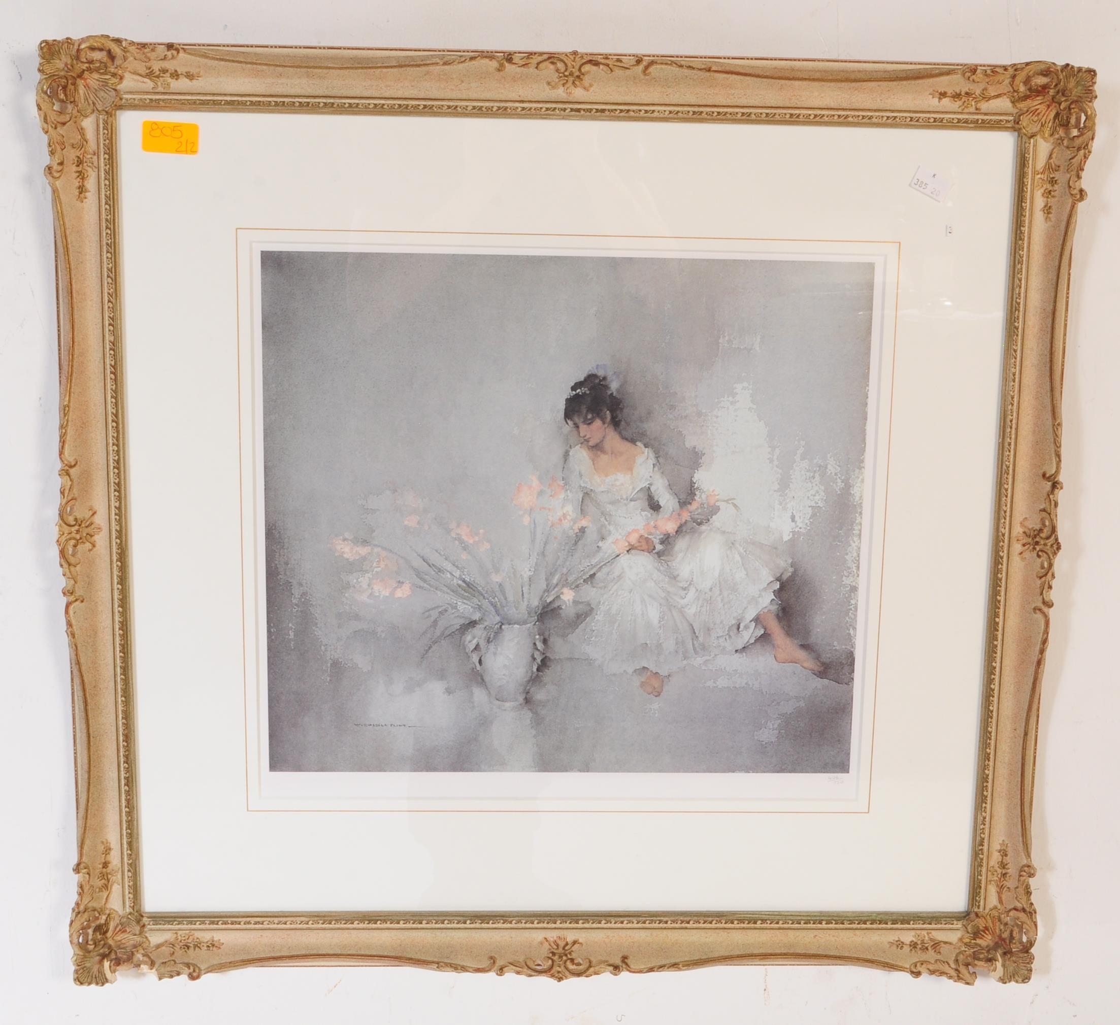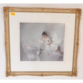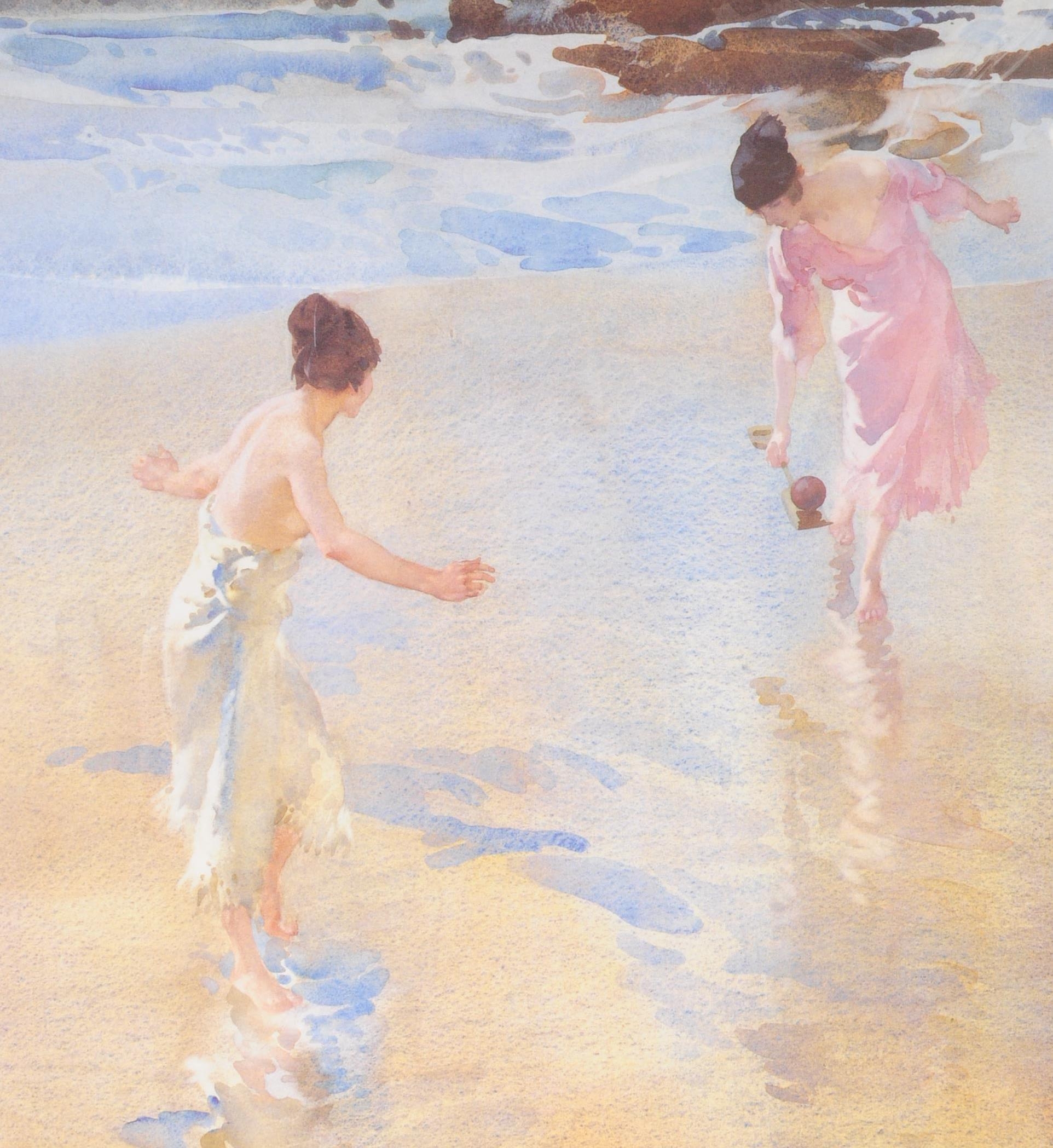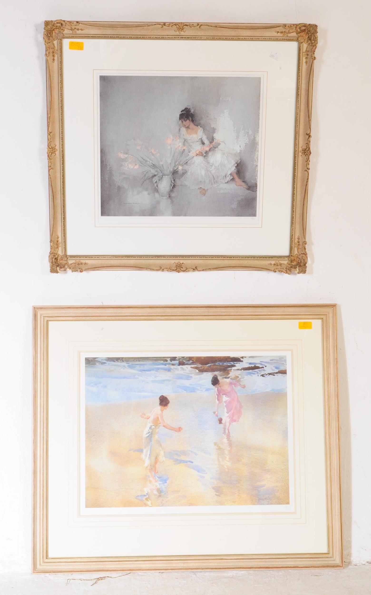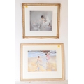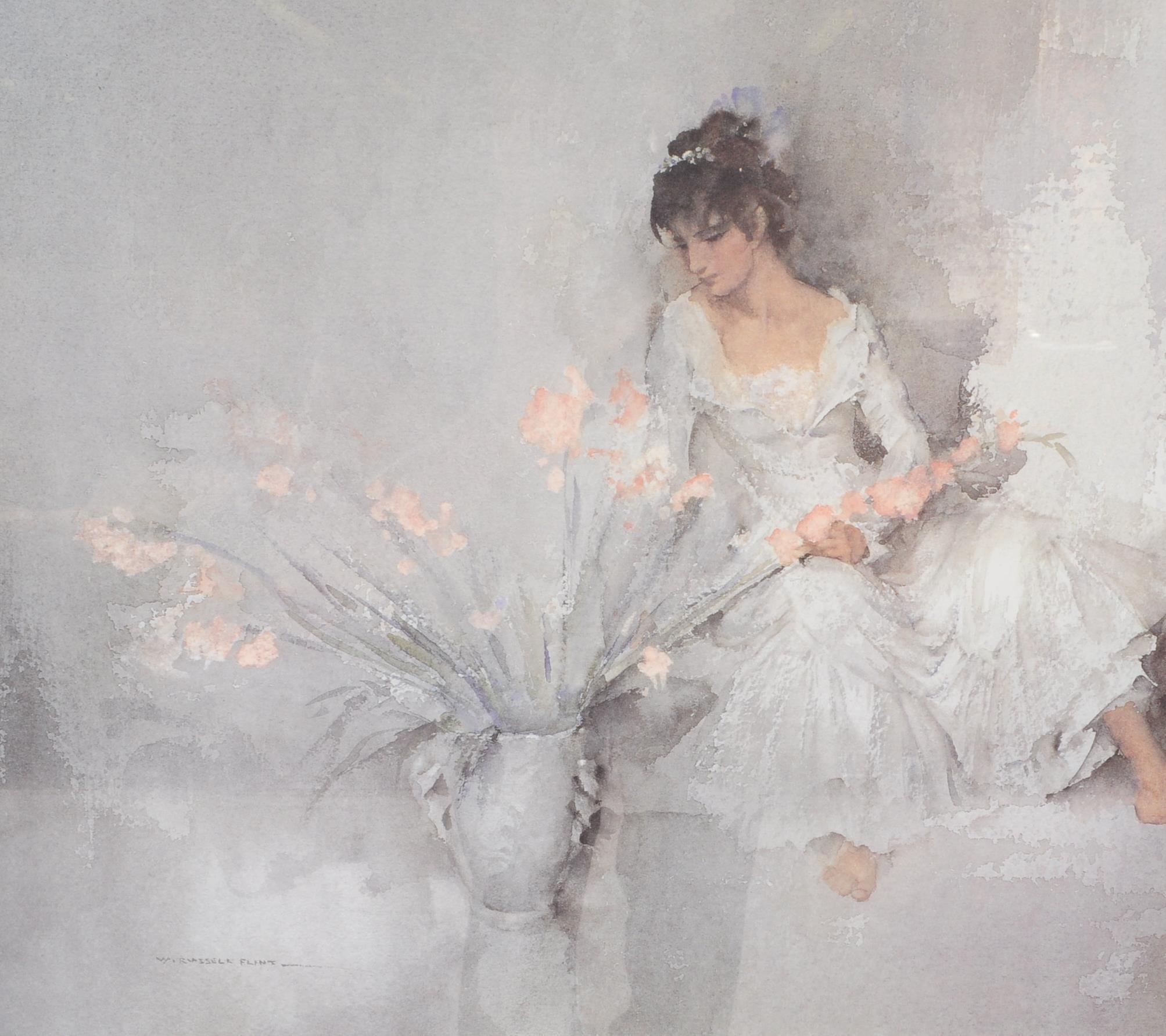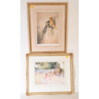 A pair of William Russell Flint prints, one depicting a female figure sat within a room scene with a vase and flowers at her feet. The other depicting an outdoor scene with two cavorting ladies at a beech.