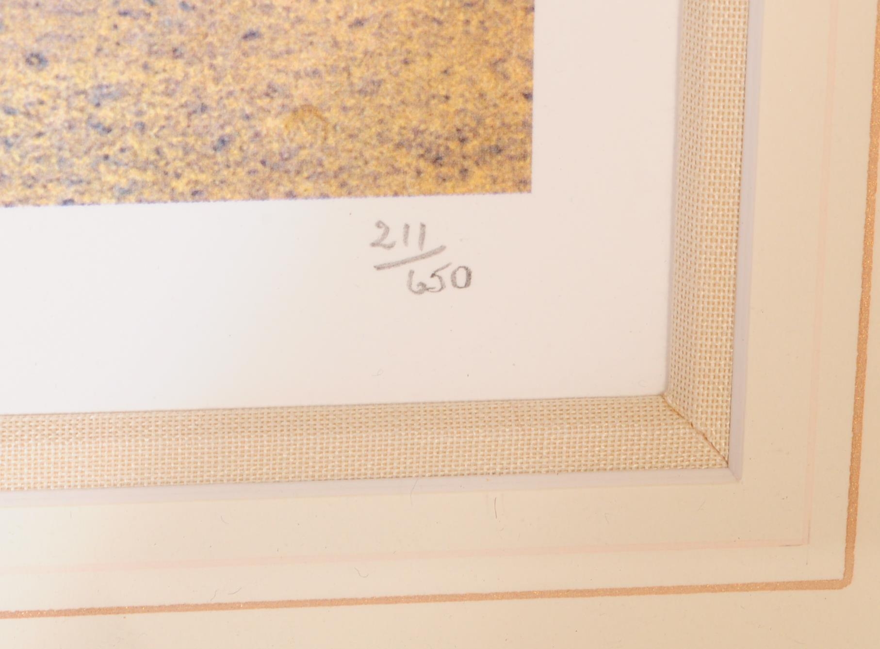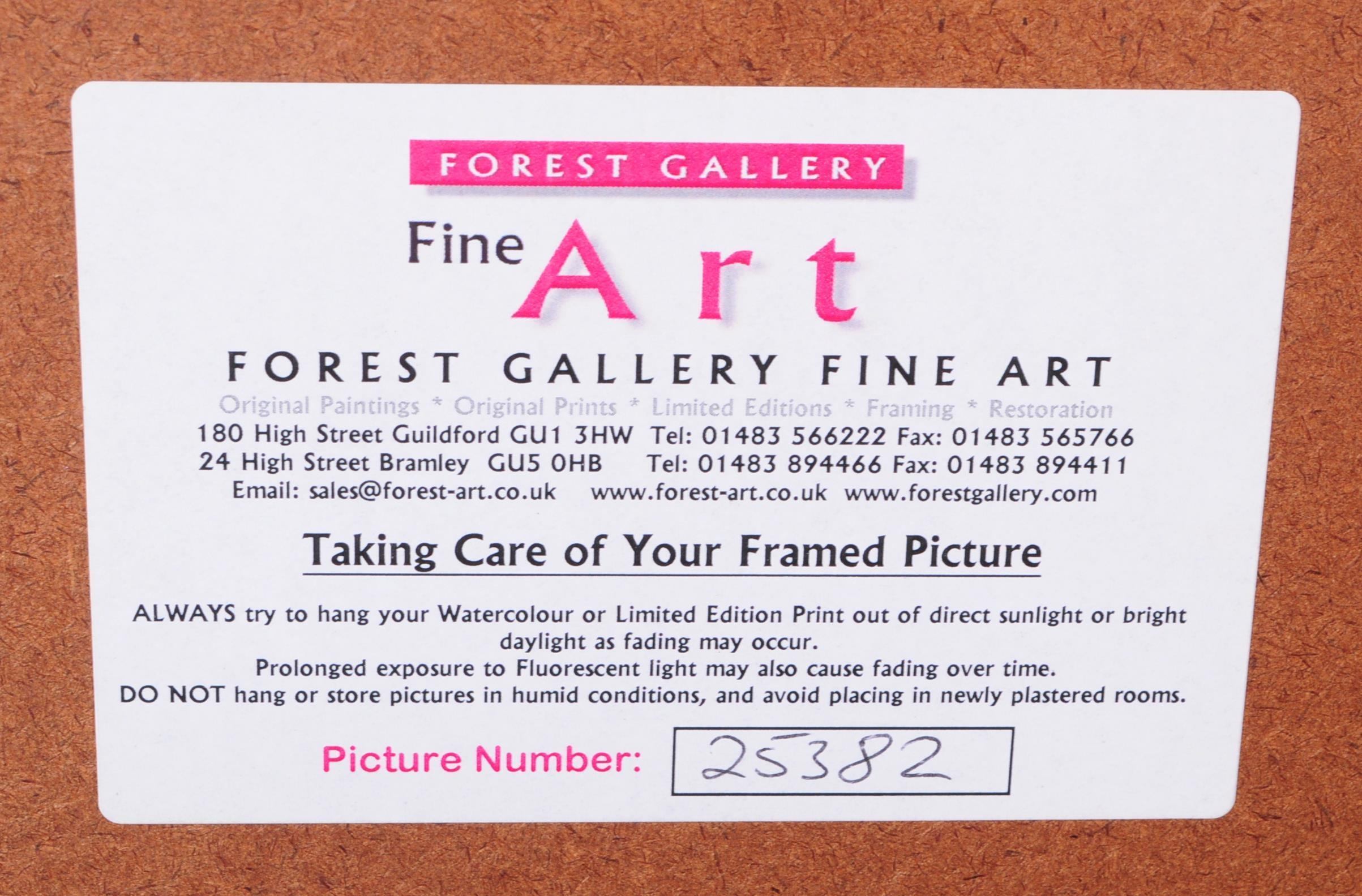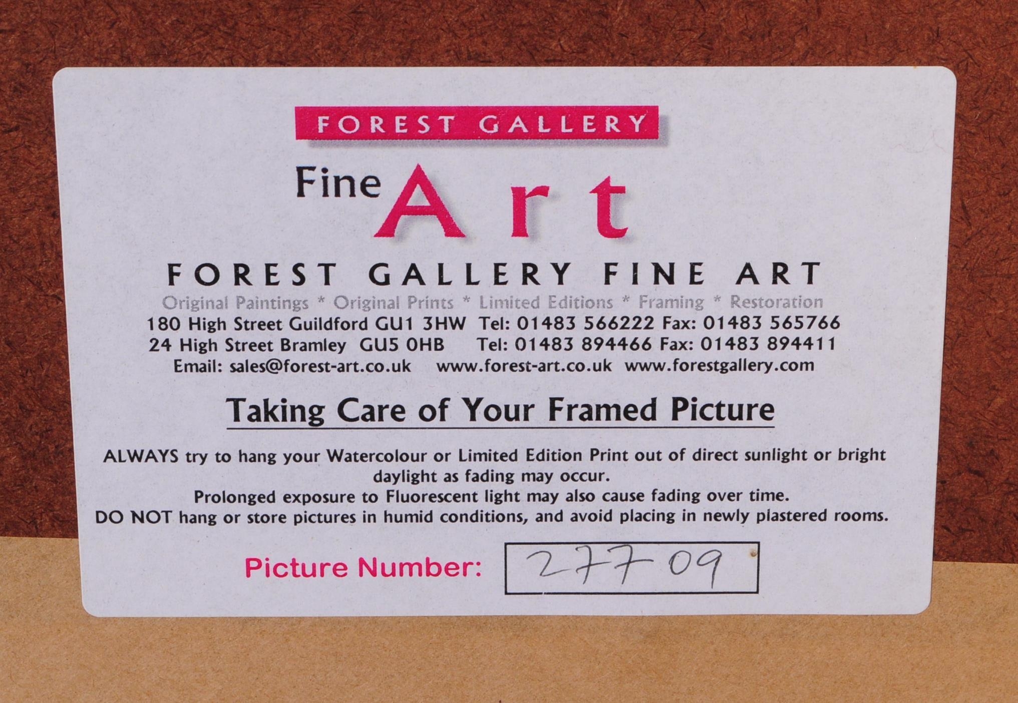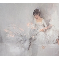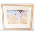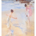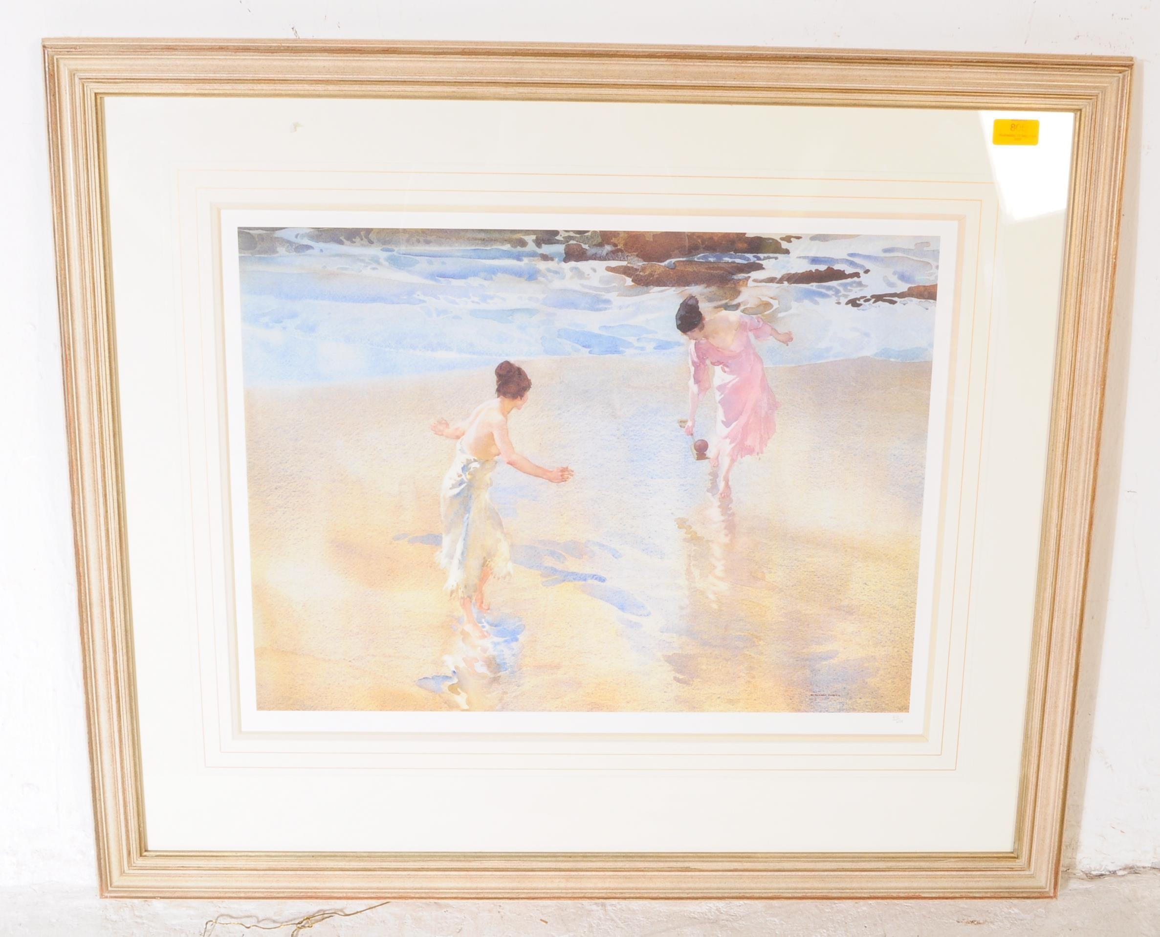 A pair of William Russell Flint prints, one depicting a female figure sat within a room scene with a vase and flowers at her feet. The other depicting an outdoor scene with two cavorting ladies at a beech.