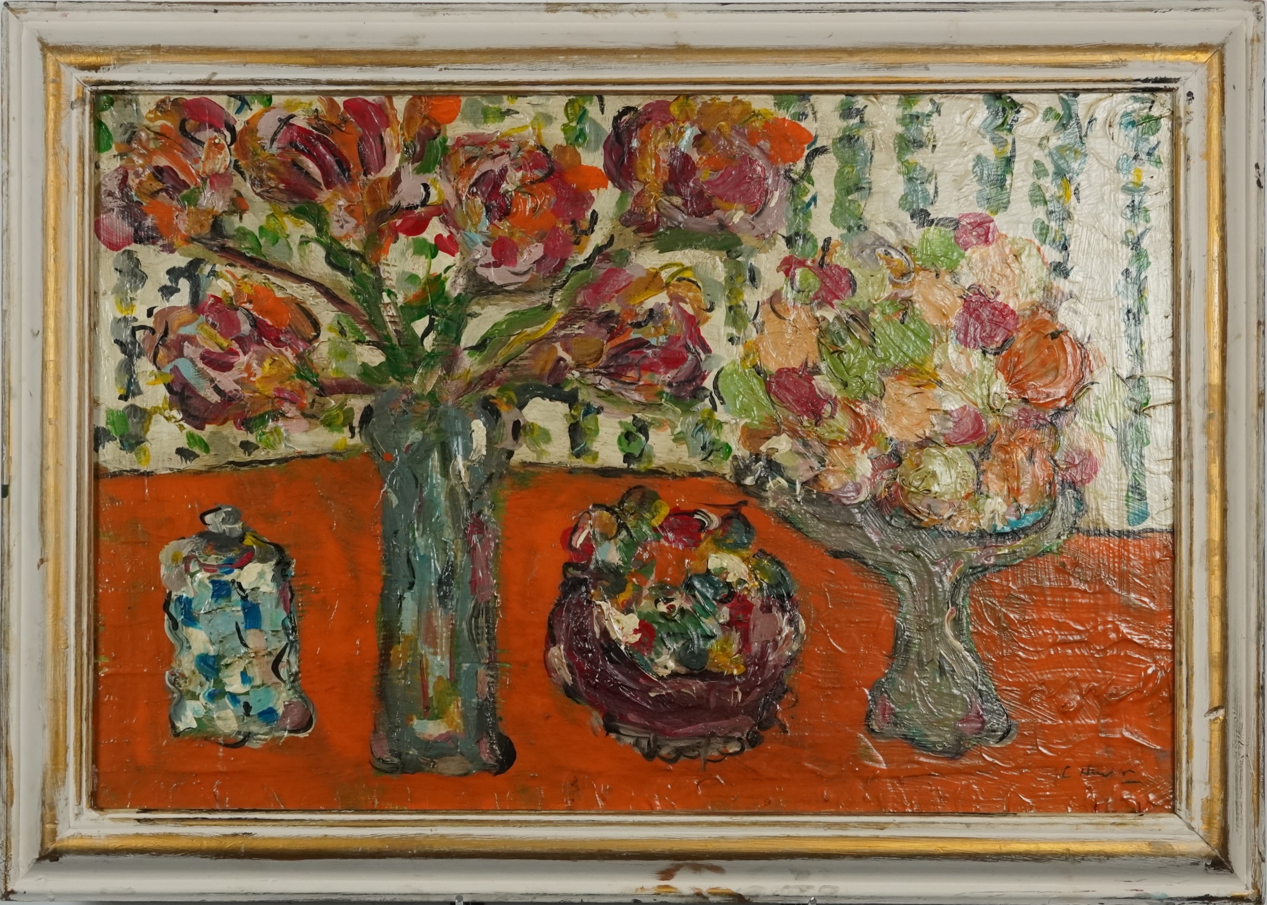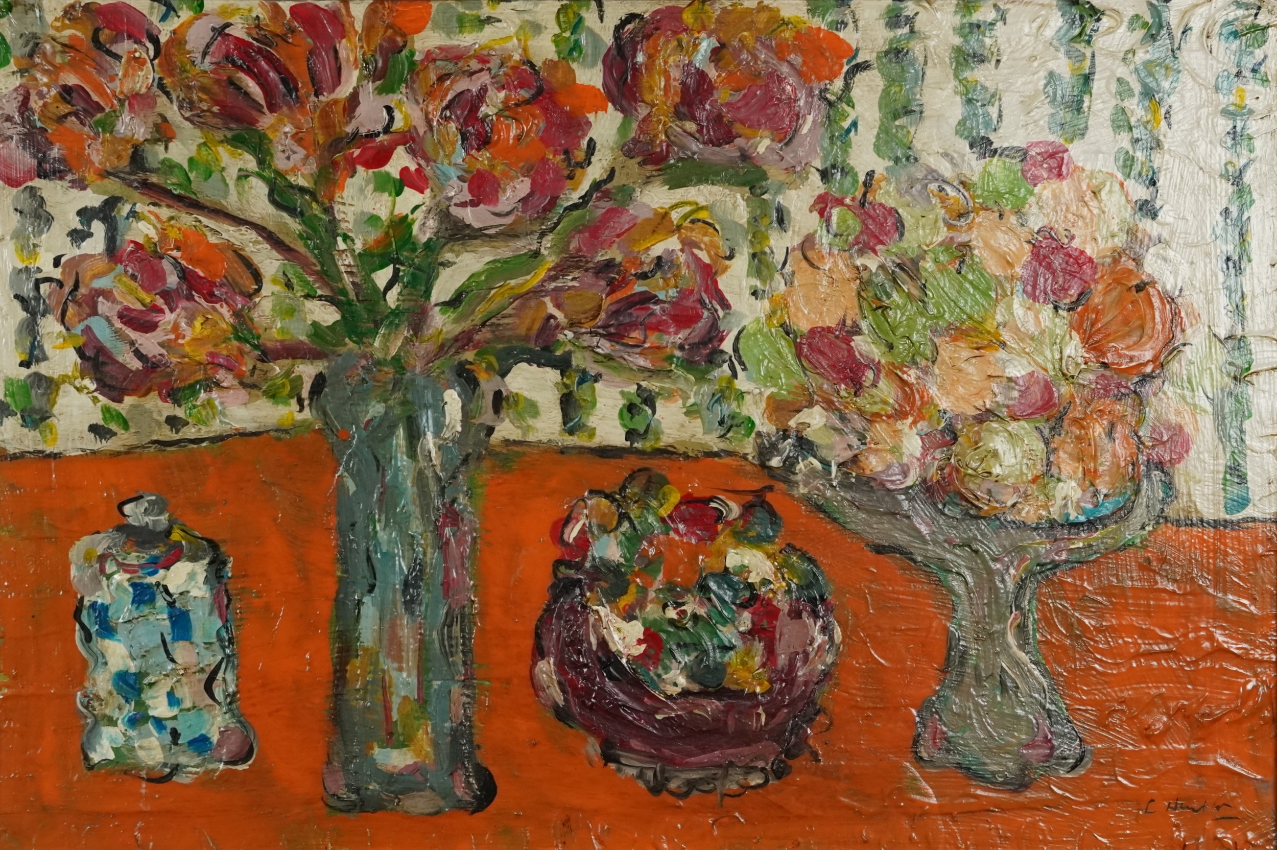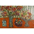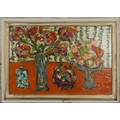 Still life flowers and vases, European school oil on board, framed, 75cm x 50cm.