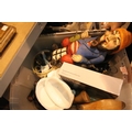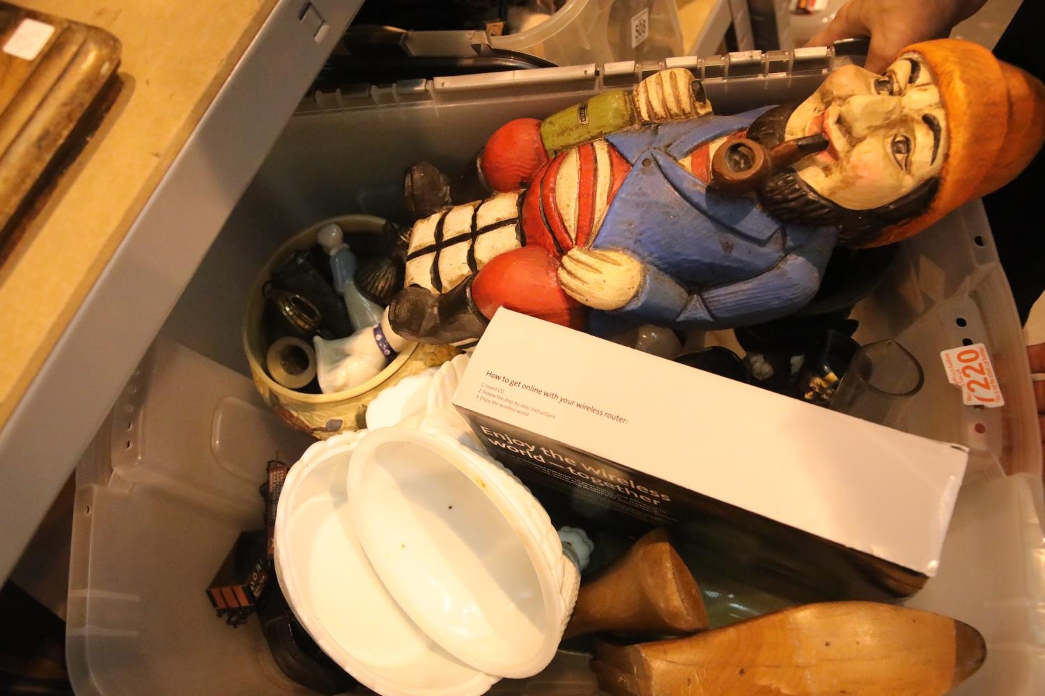 Box of mixed items including unusual wine bottle holder. Not available for in-house P&P.