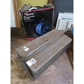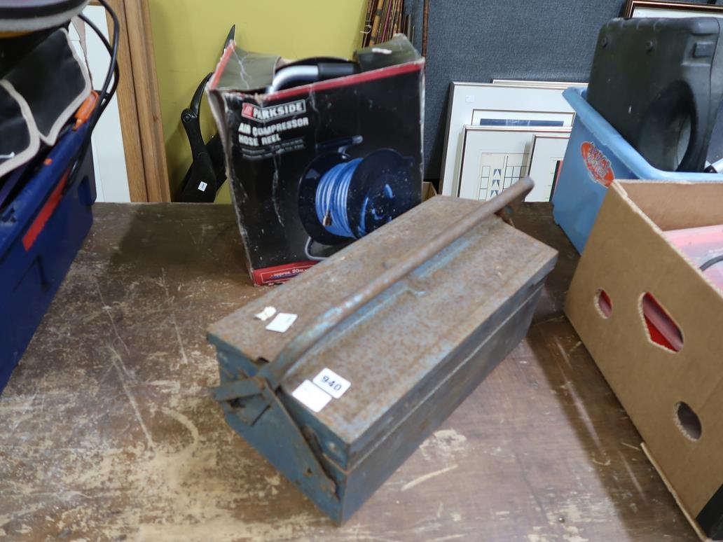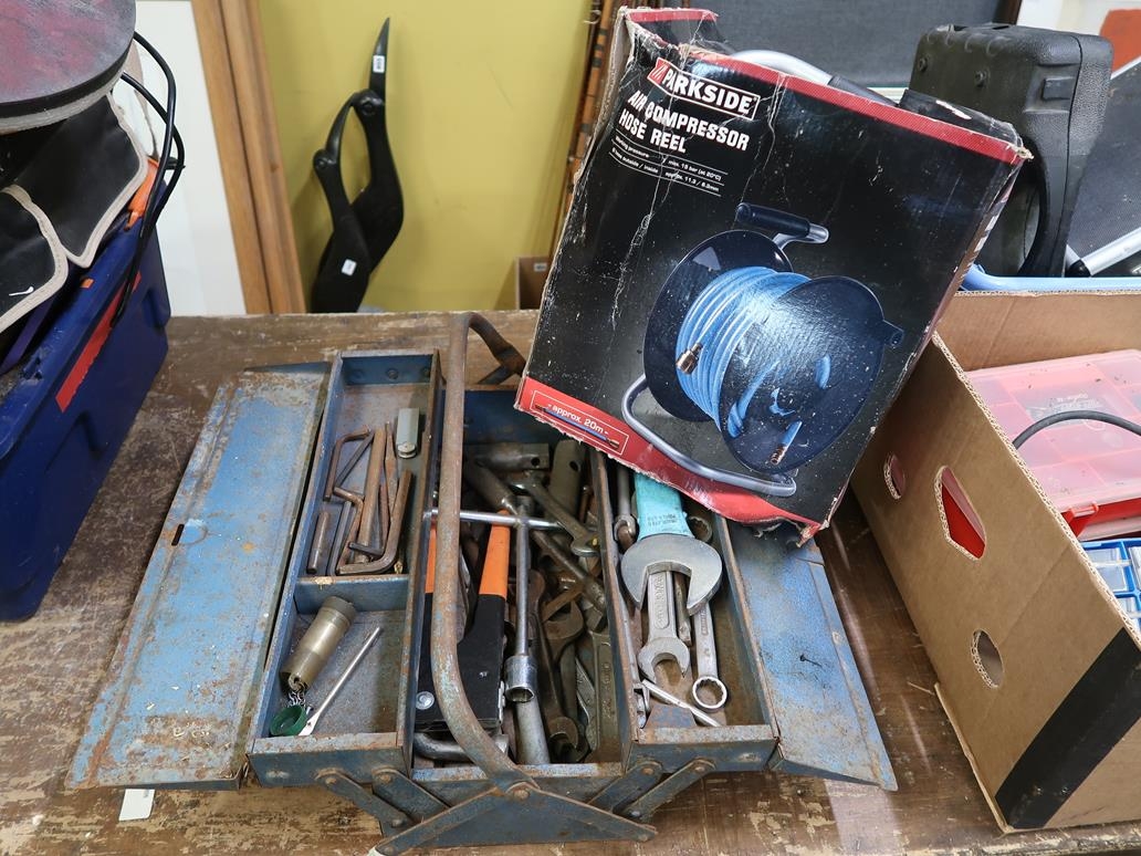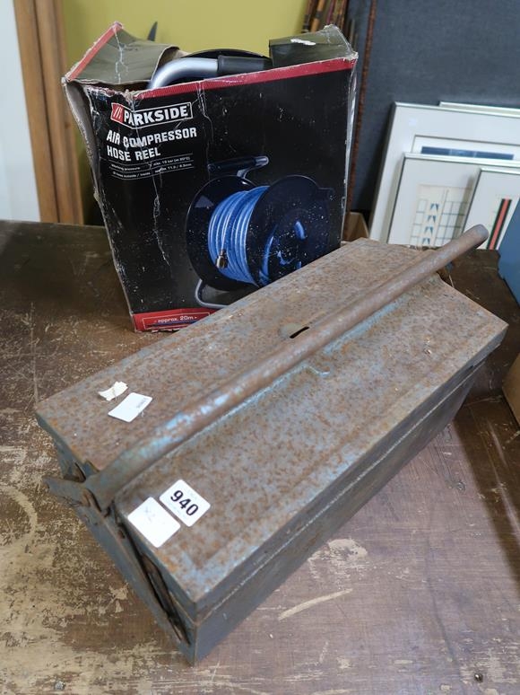 AIR COMPRESSOR HOSE AND A BOX OF TOOLS
