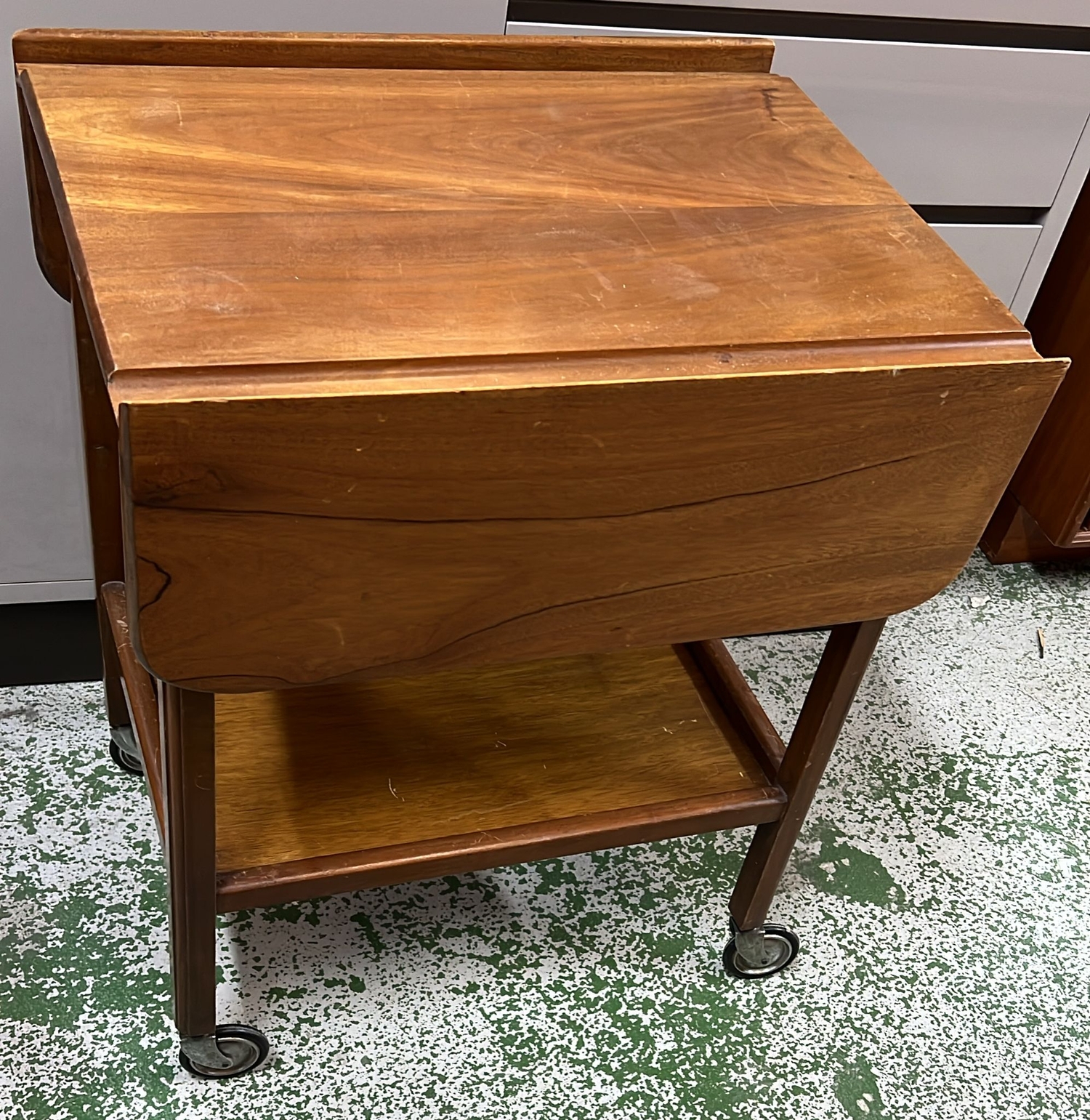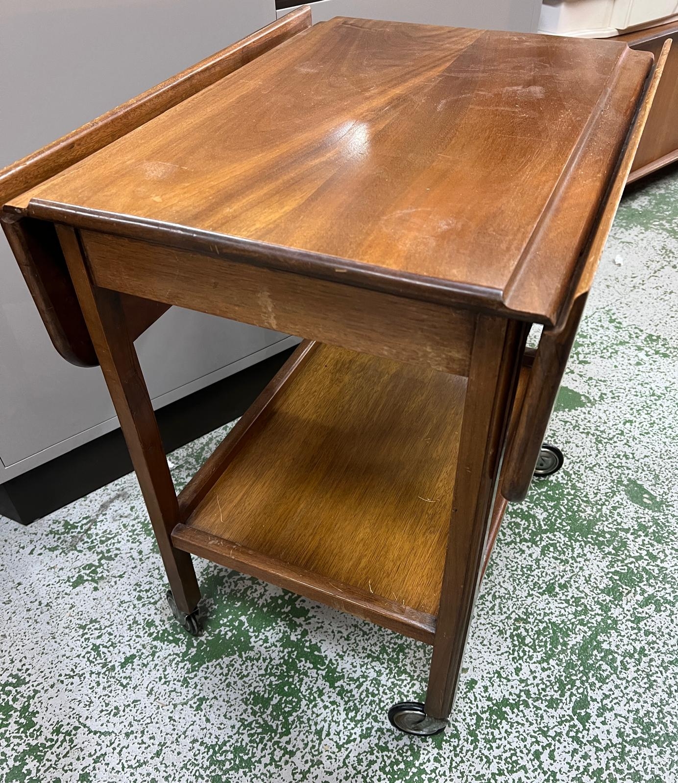 A mid century drop leaf tea trolley with shelf under (H71cm x 59cm x 47cm)