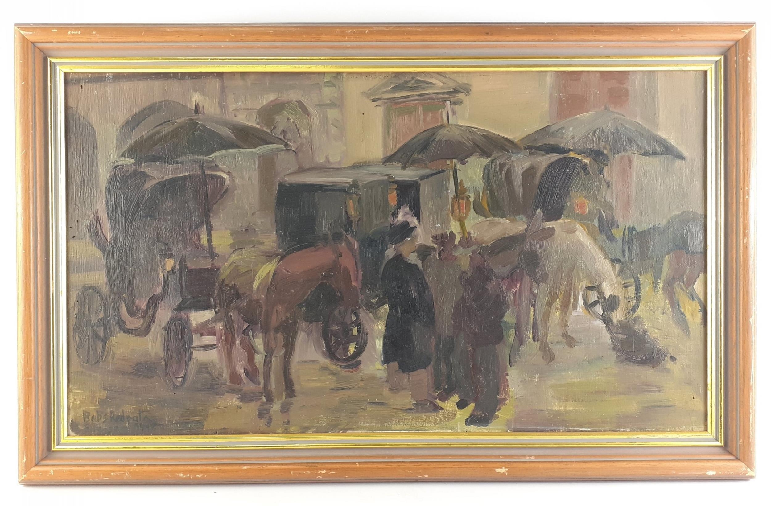 ORIGINAL BARBARA 'BABS' REDPATH (SCOTTISH b. 1924), Firenze dated 1948. Study of street scene with carriages etc. Oil on board. Frame size 68cm x 40cm. approx