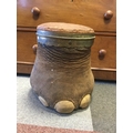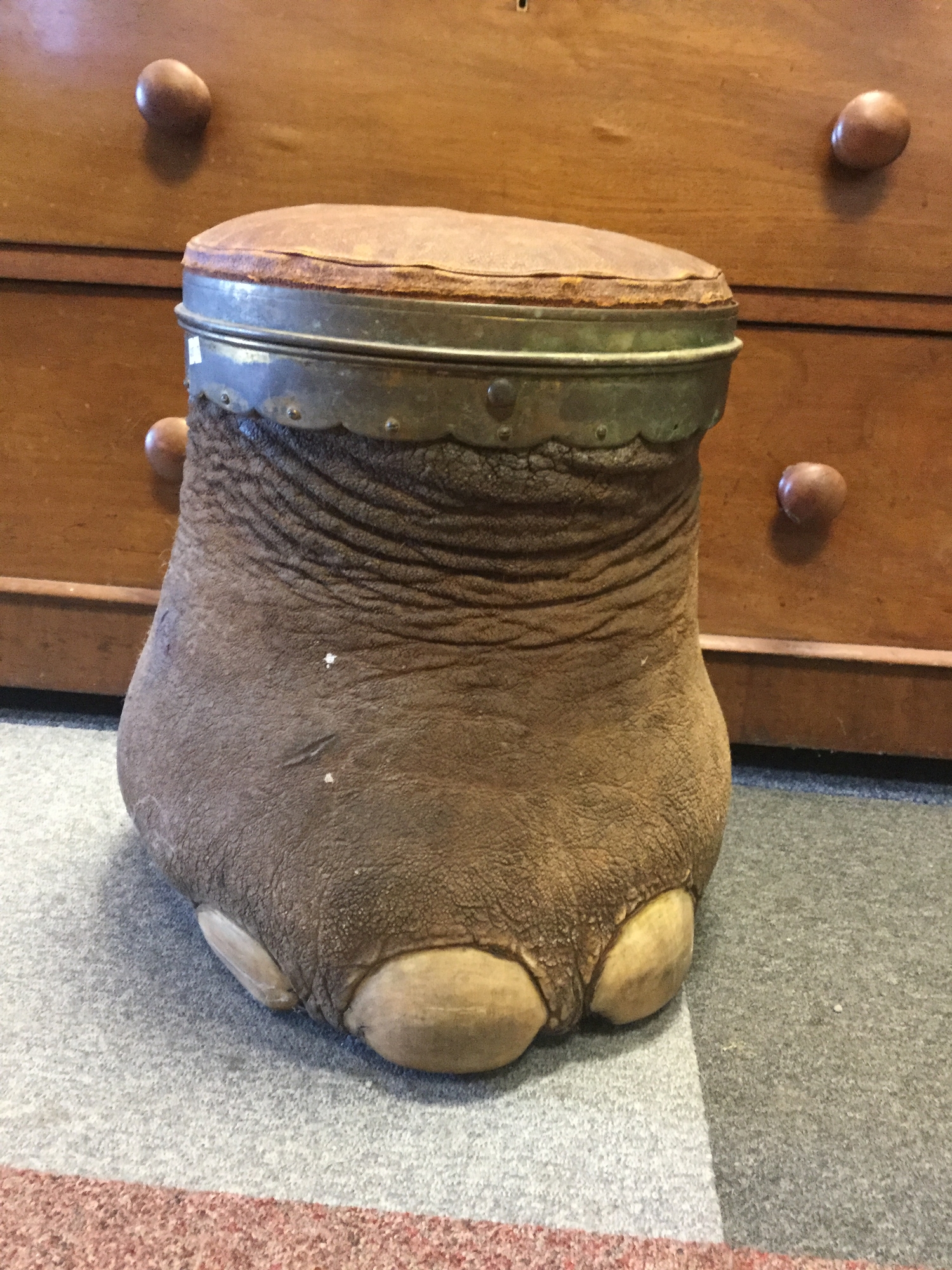 Taxidermy: A 19th century elephant foot, with brass mounts and padded stool top -