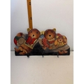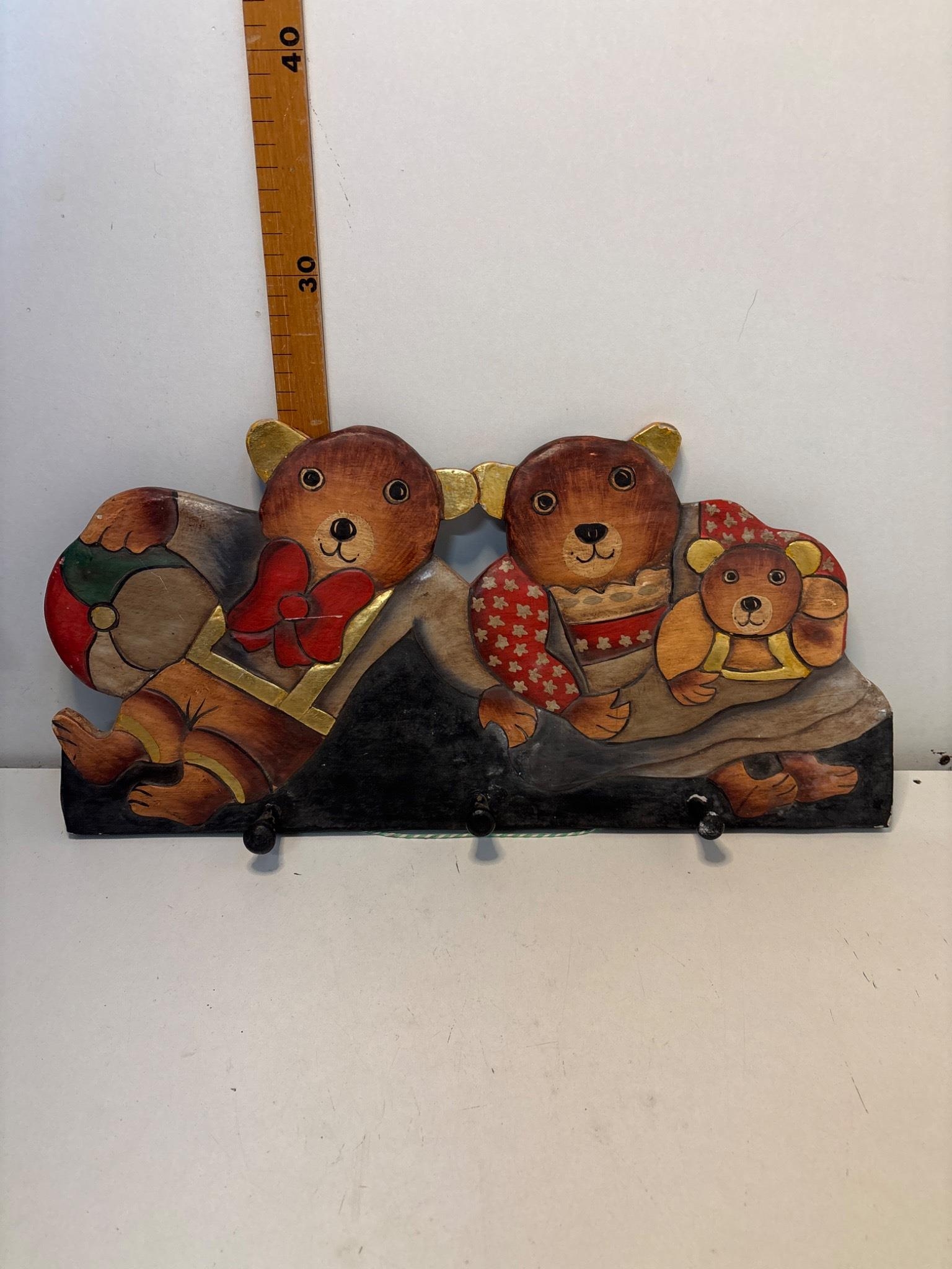Hand-painted wooden wall hook with bear family motif, featuring three hooks.
