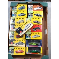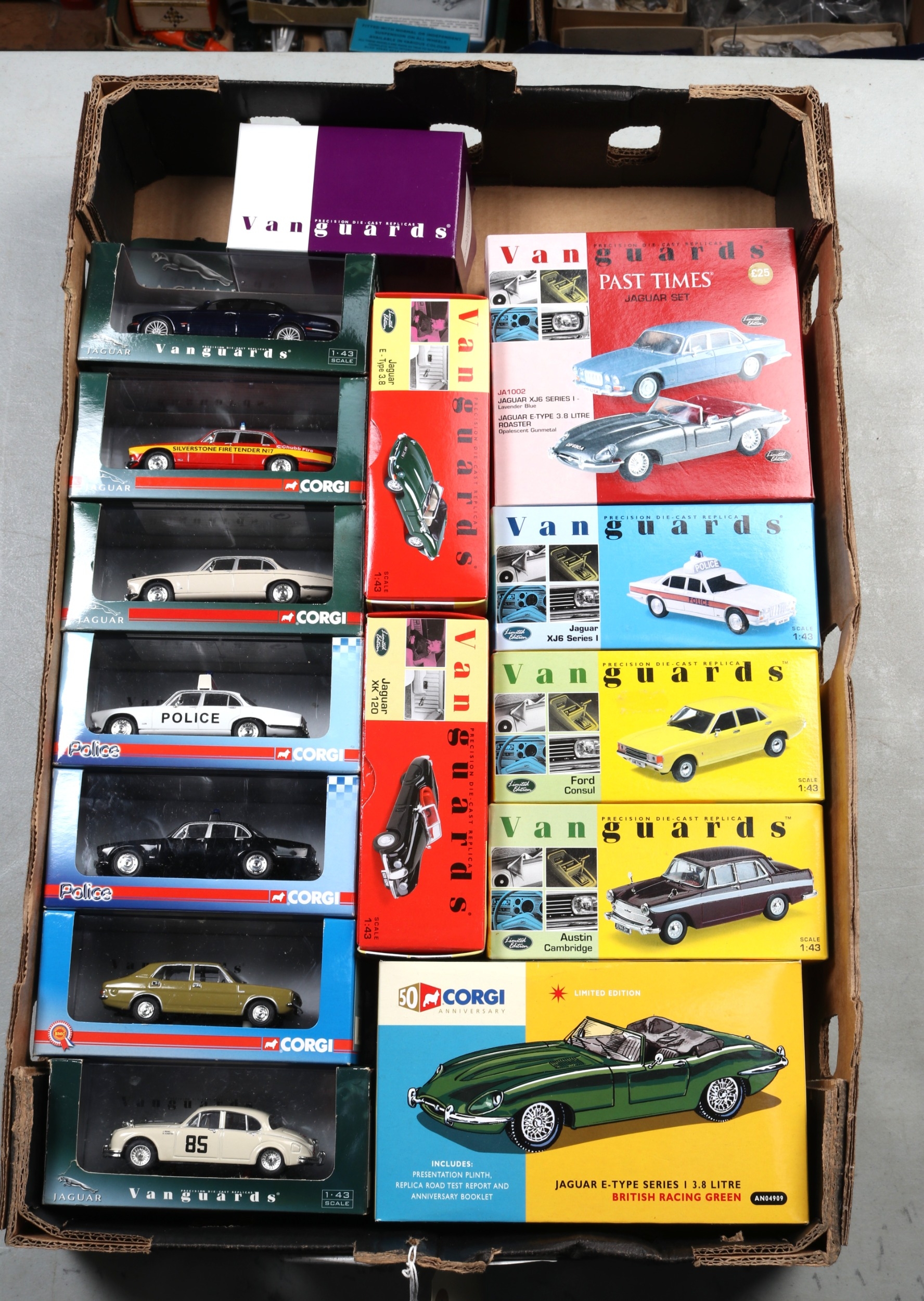 15 Vanguards. Morris Marina, Ford Consul, Austin Cambridge, Jaguar XK120, 2x Jaguar E Type, Jaguar MkII racing car. 4x Jaguar XJ6, including 2 POLICE examples. Jaguar XJR, Jaguar XJ12 Silverstone Fire Tender. Morris Minor Saloon and a 2 car set, Past Times Jaguar Set XJ6 Series I and an E Type. All boxed. Contents VGC £70-100