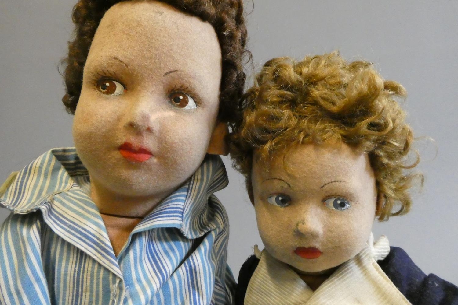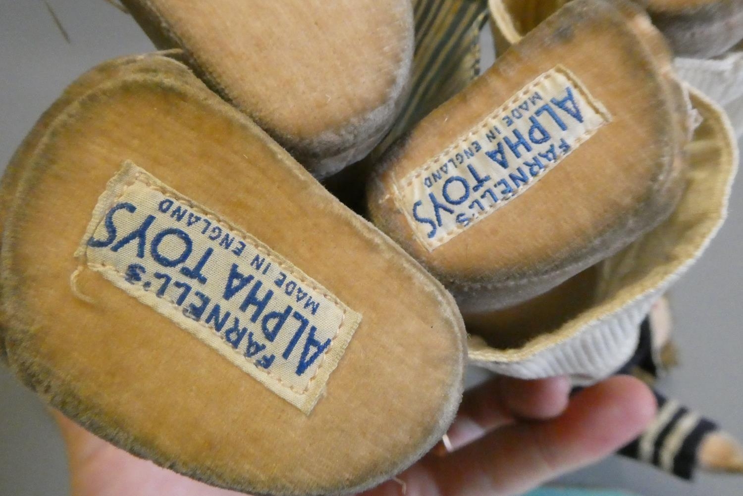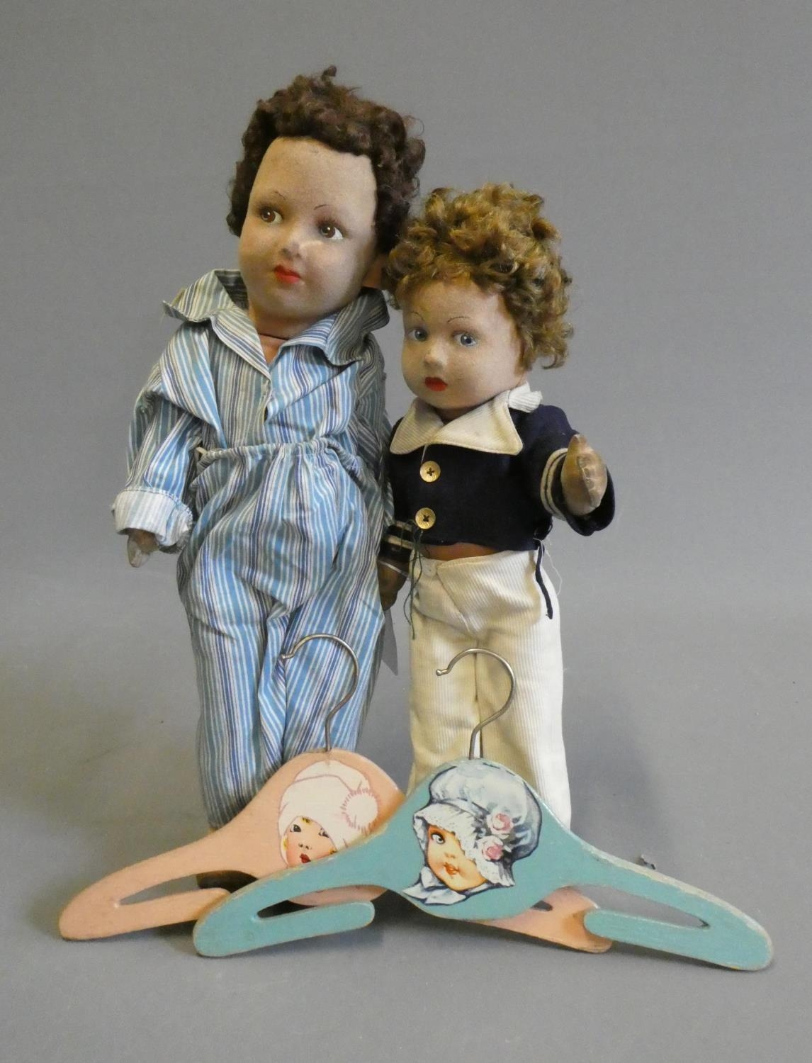 Two Farnell's Alpha Toys dolls, both of felt construction, with painted features, sideways glancing eyes and labels too feet, one 17" tall with pyjamas, the other 14 1/2" and a sailor, together with two vintage doll's coathangers