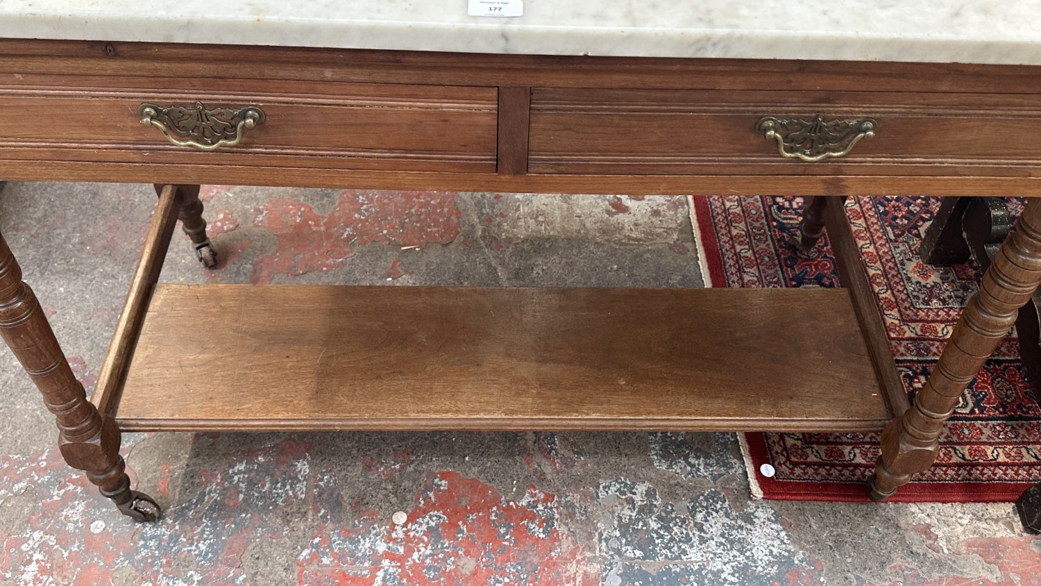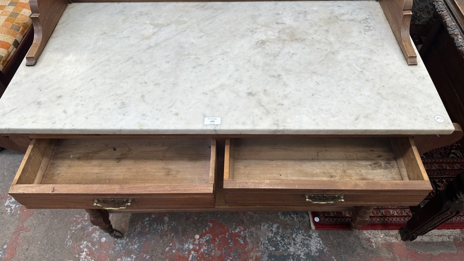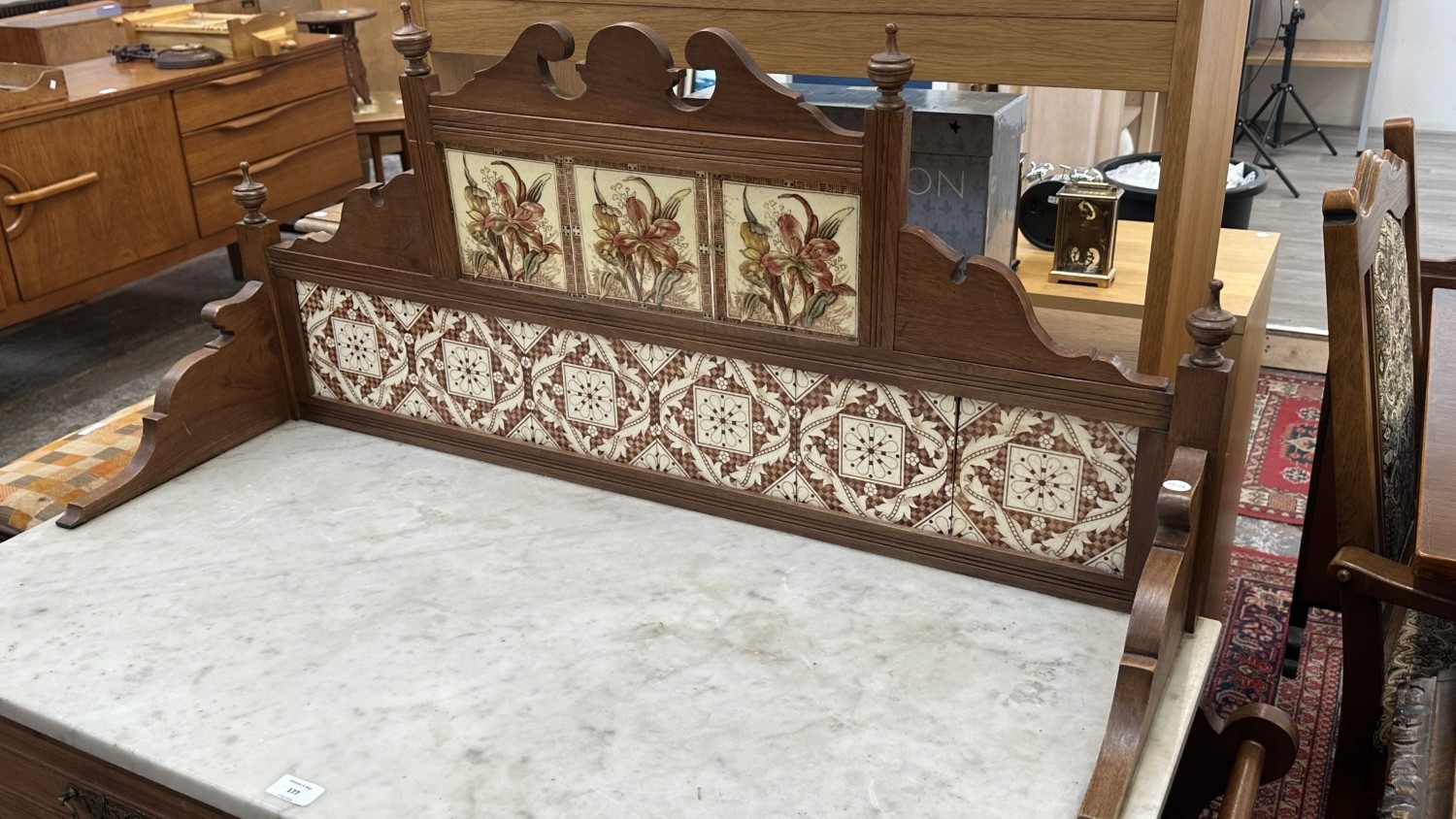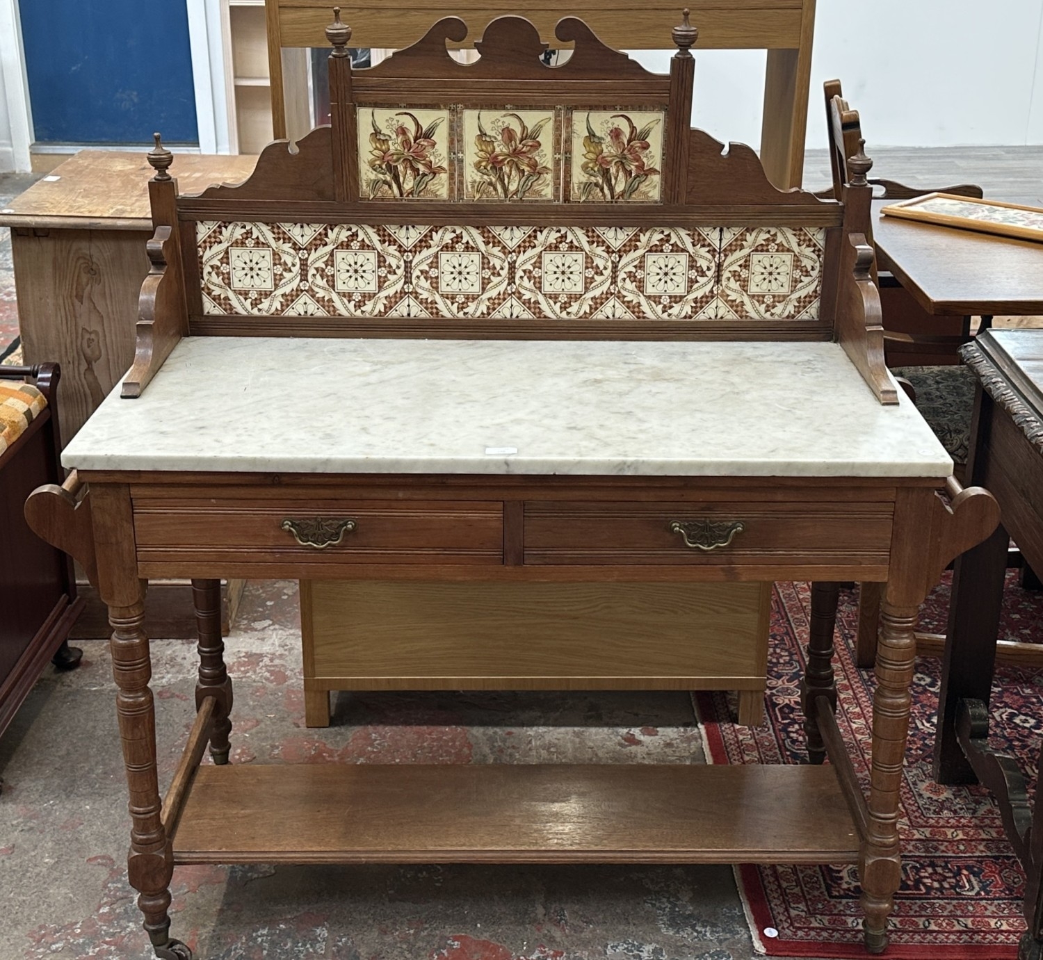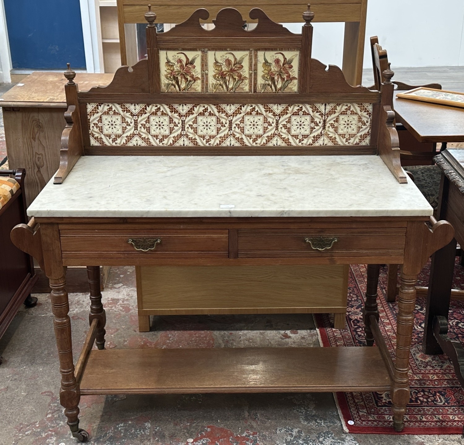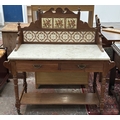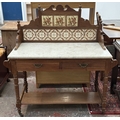 An Edwardian walnut and marble top washstand with ceramic ti...
