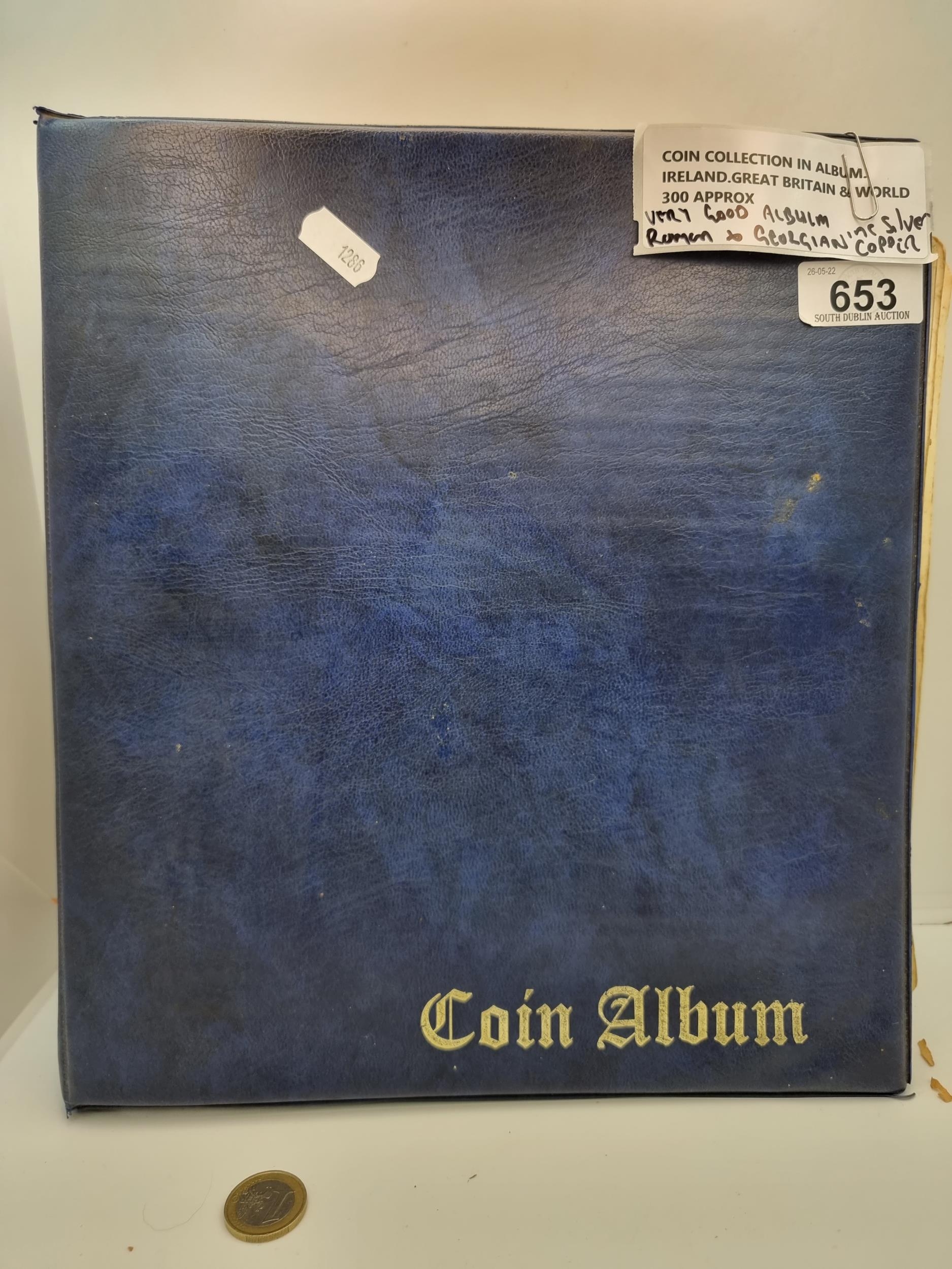 A very large collection of approximately 300 coins, contained neatly in a coin mounted album. This coin collection covers Ireland, Great Britain and afar. Some interesting Roman and Georgian silver examples. All coins individually mounted. Great collection.